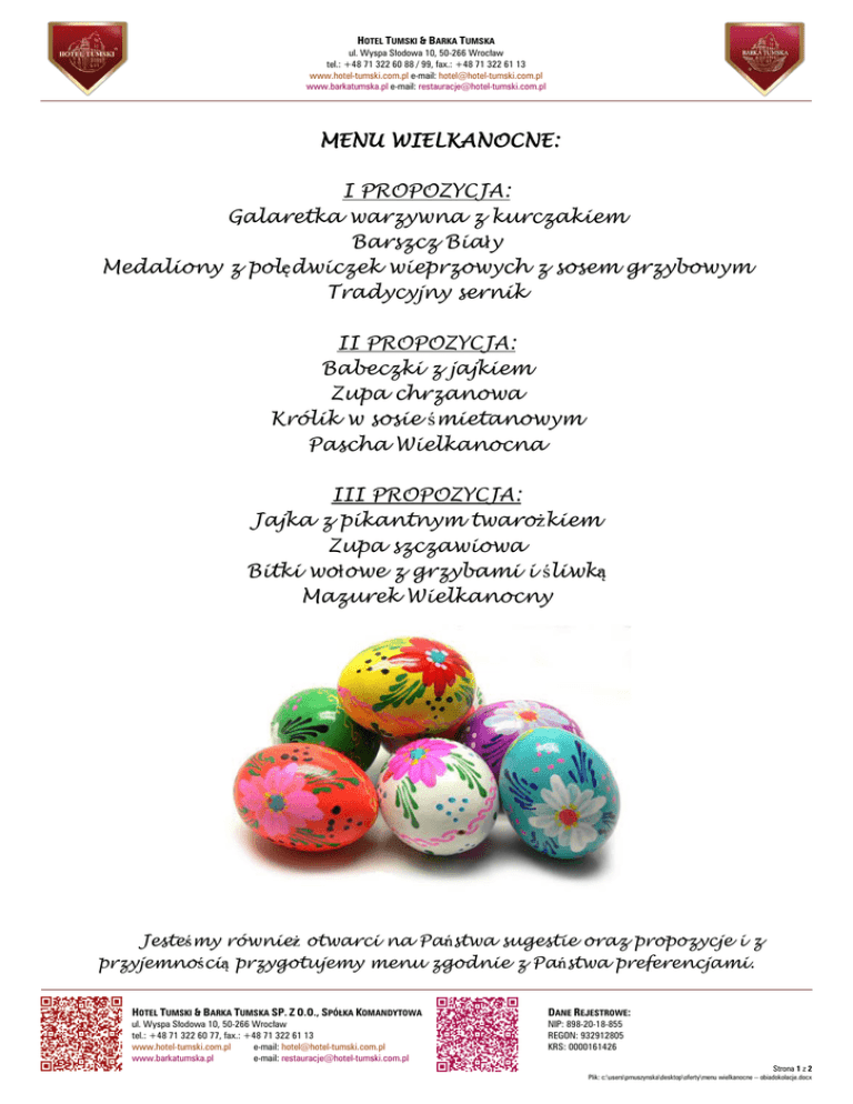 HOTEL TUMSKI & BARKA TUMSKA ul. Wyspa Słodowa 10, 50-266 Wrocław tel.: +48 71 322 60 88 / 99, fax.: +48 71 322 61 13 www.hotel-tumski.com.pl e-mail: [email protected] www.barkatumska.pl e-mail: [email protected] MENU WIELKANOCNE: I PROPOZYCJA: Galaretka warzywna z kurczakiem Barszcz Biały Medaliony z polędwiczek wieprzowych z sosem grzybowym Tradycyjny sernik II PROPOZYCJA: Babeczki z jajkiem Zupa chrzanowa Królik w sosie śmietanowym Pascha Wielkanocna III PROPOZYCJA: Jajka z pikantnym twarożkiem Zupa szczawiowa Bitki wołowe z grzybami i śliwką Mazurek Wielkanocny Jesteśmy również otwarci na Państwa sugestie oraz propozycje i z przyjemnością przygotujemy menu zgodnie z Państwa preferencjami. HOTEL TUMSKI & BARKA TUMSKA SP. Z O.O., SPÓŁKA KOMANDYTOWA DANE REJESTROWE: ul. Wyspa Słodowa 10, 50-266 Wrocław tel.: +48 71 322 60 77, fax.: +48 71 322 61 13 www.hotel-tumski.com.pl e-mail: [email protected] www.barkatumska.pl e-mail: [email protected] NIP: 898-20-18-855 REGON: 932912805 KRS: 0000161426 Strona 1 z 2 Plik: c:\users\pmuszynska\desktop\oferty\menu wielkanocne -- obiadokolacje.docx HOTEL TUMSKI & BARKA TUMSKA ul. Wyspa Słodowa 10, 50-266 Wrocław tel.: +48 71 322 60 88 / 99, fax.: +48 71 322 61 13 www.hotel-tumski.com.pl e-mail: [email protected] www.barkatumska.pl e-mail: [email protected] HOTEL TUMSKI & BARKA TUMSKA SP. Z O.O., SPÓŁKA KOMANDYTOWA DANE REJESTROWE: ul. Wyspa Słodowa 10, 50-266 Wrocław tel.: +48 71 322 60 77, fax.: +48 71 322 61 13 www.hotel-tumski.com.pl e-mail: [email protected] www.barkatumska.pl e-mail: [email protected] NIP: 898-20-18-855 REGON: 932912805 KRS: 0000161426 Strona 2 z 2 Plik: c:\users\pmuszynska\desktop\oferty\menu wielkanocne -- obiadokolacje.docx