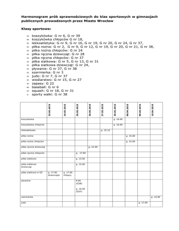 Harmonogram prób sprawnościowych do klas sportowych w gimnazjach publicznych prowadzonych przez Miasto Wrocław Klasy sportowe: koszykówka g. 16.00 koszykówka chłopców g. 16.00 lekkoatletyka g. 15.00 piłka nożna chłopców g. 15.00 piłka ręczna dziewcząt g. 14.30 piłka ręczna chłopców g. 17.00 piłka siatkowa g. 15.00 piłka siatkowa dziewcząt g. 15.00 pływanie 10.04.2015 g. 15.15 piłka nożna piłka siatkowa w G5 09.04.2015 08.04.2015 30.03.2015 27.03.2015 26.03.2015 25.03.2015 23.03.2015 • koszykówka: G nr 6, G nr 39 koszykówka chłopców G nr 18, lekkoatletyka: G nr 9, G nr 16, G nr 19, G nr 20, G nr 24, G nr 37, piłka nożna: G nr 2, G nr 9, G nr 12, G nr 19, G nr 20, G nr 21, G nr 38, piłka nożna chłopców: G nr 24 piłka ręczna dziewcząt: G nr 28 piłka ręczna chłopców: G nr 37 piłka siatkowa: G nr 5, G nr 13, G nr 31 piłka siatkowa dziewcząt: G nr 24, pływanie: G nr 37, G nr 38 szermierka: G nr 3 judo: G nr 7, G nr 37 wioślarstwo: G nr 15, G nr 27 zapasy: G 22 baseball: G nr 6 squash: G nr 18, G nr 31 sporty walki: G nr 38 24.03.2015 • • • • • • • • • • • • • • • • g. 17.00 dziewczęta g. 17.00 chłopcy 9.00 (G38) g. 16.00 (G37) szermierka judo g. 14.00 g. 17.00 wioślarstwo g. 16.00 zapasy g. 14.00 baseball squash sporty walki g. 15.30 g. 16.00 g. 15.00 Uwagi 1). Podane godziny i daty przy dyscyplinie sportowej dotyczą wszystkich gimnazjów z tą dyscypliną. 2). Zdana próba sprawności fizycznej w szkole z daną dyscypliną sportową pozwala na rekrutację do innej szkoły z oddziałem z tą samą dyscypliną sportową. Wyjątek stanowi Gimnazjum nr 5, które przeprowadza testy według innych kryteriów. Punkty otrzymane na teście w tym gimnazjum będą honorowane w innych gimnazjach z tą samą dyscypliną.