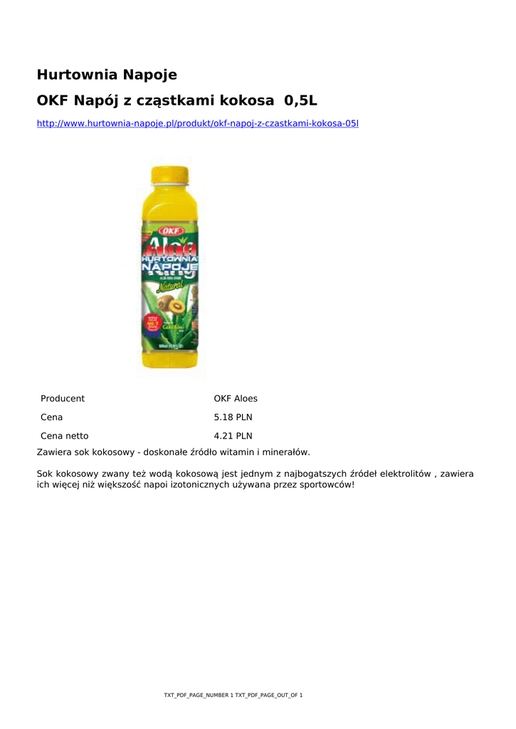 Hurtownia Napoje OKF Napój z cząstkami kokosa 0,5L http://www.hurtownia-napoje.pl/produkt/okf-napoj-z-czastkami-kokosa-05l Producent OKF Aloes Cena 5.18 PLN Cena netto 4.21 PLN Zawiera sok kokosowy - doskonałe źródło witamin i minerałów. Sok kokosowy zwany też wodą kokosową jest jednym z najbogatszych źródeł elektrolitów , zawiera ich więcej niż większość napoi izotonicznych używana przez sportowców! TXT_PDF_PAGE_NUMBER 1 TXT_PDF_PAGE_OUT_OF 1