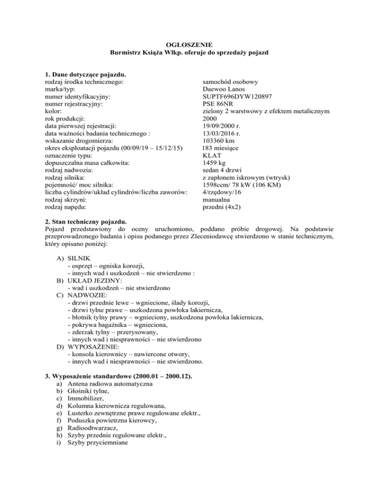 OGŁOSZENIE Burmistrz Książa Wlkp. oferuje do sprzedaży pojazd 1. Dane dotyczące pojazdu. rodzaj środka technicznego: marka/typ: numer identyfikacyjny: numer rejestracyjny: kolor: rok produkcji: data pierwszej rejestracji: data ważności badania technicznego : wskazanie drogomierza: okres eksploatacji pojazdu (00/09/19 – 15/12/15) oznaczenie typu: dopuszczalna masa całkowita: rodzaj nadwozia: rodzaj silnika: pojemność/ moc silnika: liczba cylindrów/układ cylindrów/liczba zaworów: rodzaj skrzyni: rodzaj napędu: samochód osobowy Daewoo Lanos SUPTF696DYW120897 PSE 86NR zielony 2 warstwowy z efektem metalicznym 2000 19/09/2000 r. 13/03/2016 r. 103360 km 183 miesiące KLAT 1459 kg sedan 4 drzwi z zapłonem iskrowym (wtrysk) 1598ccm/ 78 kW (106 KM) 4/rzędowy/16 manualna przedni (4x2) 2. Stan techniczny pojazdu. Pojazd przedstawiony do oceny uruchomiono, poddano próbie drogowej. Na podstawie przeprowadzonego badania i opisu podanego przez Zleceniodawcę stwierdzono w stanie technicznym, który opisano poniżej: A) SILNIK - osprzęt – ogniska korozji, - innych wad i uszkodzeń – nie stwierdzono : B) UKŁAD JEZDNY: - wad i uszkodzeń – nie stwierdzono C) NADWOZIE: - drzwi przednie lewe – wgniecione, ślady korozji, - drzwi tylne prawe – uszkodzona powłoka lakiernicza, - błotnik tylny prawy – wgnieciony, uszkodzona powłoka lakiernicza, - pokrywa bagażnika – wgnieciona, - zderzak tylny – przerysowany, - innych wad i niesprawności – nie stwierdzono D) WYPOSAŻENIE: - konsola kierownicy – nawiercone otwory, - innych wad i niesprawności – nie stwierdzono. 3. Wyposażenie standardowe (2000.01 – 2000.12). a) Antena radiowa automatyczna b) Głośniki tylne, c) Immobilizer, d) Kolumna kierownicza regulowana, e) Lusterko zewnętrzne prawe regulowane elektr., f) Poduszka powietrzna kierowcy, g) Radioodtwarzacz, h) Szyby przednie regulowane elektr., i) Szyby przyciemniane j) k) l) m) n) o) Światła p/mgielne przednie Światło dodatkowe STOP, Wspomaganie układu kierowniczego, Zamek centralny, Zderzaki w kolorze nadwozia, Zegar cyfrowy. 4. Wyposażenie dodatkowe: a) ABS – system zapobiegający blokowaniu kół b) lakier metalizowany lub perłowy, c) poduszka powietrzna pasażera, 5. opis zamontowanego w pojeździe ogumienia: a) koło przednie lewe – DĘBICA 185/60 R14 82 H FURIO TL – zużycie 50% b) koło przednie prawe – DĘBICA 185/60 R14 82 H FURIO TL – zużycie 50% c) koło tylne lewe – DĘBICA 185/60 R14 82 H FURIO TL – zużycie 50% d) koło tylne prawe – DĘBICA 185/60 R14 82 H FURIO TL – zużycie 50% 4. Możliwość obejrzenia pojazdu. Pojazd można obejrzeć w strażnicy OSP w Chwałkowie Kościelnym po wcześniejszym umówieniu się z Panem Marianem Wojtkowiakiem tel. – 606 756 101 lub Sebastianem Skałeckim – 668 909 789 5. Cena. Cena wywoławcza wynosi: brutto: 1 600,00 zł (słownie: tysiąc sześćset złotych). Ceny sprzedaży zawiera podatek VAT wg obowiązujących stawek. 6. Składanie ofert. Pisemne oferty można składać w Urzędzie Miejskim w Książu Wlkp. przy ul. Stacha Wichury 11A 63-130 Książ Wlkp. w pokoju nr 1 (sekretariat) w godzinach urzędowania w terminie od dnia 25 stycznia 2016r. do dnia 1 lutego 2016r. Oferta powinna zawierać: a) imię i nazwisko lub nazwę oferenta, b) adres oferenta lub adres siedziby oferenta, c) telefon kontaktowy, d) datę sporządzenia oferty, e) oferowaną cenę netto za przedmiot transakcji, f) podpis oferenta. W przypadku składania oferty przez podmiot inny niż osoba fizyczna do oferty należy dołączyć aktualny dokument (np. odpis lub wydruk z KRS), z którego wynika upoważnienie do reprezentowania tego podmiotu. Za udzielenie pełnomocnictw należy uiścić opłatę skarbową a dokument potwierdzający jej uiszczenie należy dołączyć do oferty. Oferty niekompletne i nieprawidłowo wypełnione albo złożone po terminie nie będą rozpatrywane. W przypadku przesłania oferty pocztą tradycyjną decyduje data jej wpływu do tut. Urzędu. Oferty należy składać w zamkniętych kopertach z dopiskiem „Przetarg na sprzedaż samochodu osobowego Daewoo Lanos– PSE 86NR” 7. Rozpatrzenie ofert. Rozpatrzenie ofert nastąpi w dniu 3 lutego 2016r. w Urzędzie Miejskim w Książu Wlkp. o godz. 10.00 – pokój nr 7. W przypadku złożenia ofert równorzędnych Komisja Konkursowa organizuje dodatkowy przetarg ustny ograniczony do oferentów, którzy złożyli te oferty. O terminie przeprowadzenia przetargu Komisja Konkursowa zawiadamia oferentów odrębnym pismem. 8. Powiadomienie oferentów. O wyborze oferty zainteresowani zostaną powiadomieni telefonicznie. 9. Dodatkowe informacje. a) wszelkiego rodzaju koszty transakcji oraz koszty opłat skarbowych wynikające z zawarcia umowy kupna – sprzedaży pojazdu obciążają Kupującego, b) cena osiągnięta w przetargu będzie stanowiła należność za nabycie pojazdu i powinna być wpłacona na konto Urzędu Miejskiego w Książu Wlkp. nr 43 9084 1026 0300 0101 2000 0001 w Spółdzielczym Banku Ludowym w Śremie, Oddział w Książu Wlkp. z odpowiednim wyprzedzeniem tak, aby środki finansowe znalazły się na koncie Urzędu Miejskiego na dzień przed zawarciem umowy kupna –sprzedaży, c) wyklucza się dokonywania płatności w inny sposób niż określony w lit. b, d) dodatkowe informacje można uzyskać w Urzędzie Miejskim w Książu Wlkp. pod numerem telefonu 61 28 22 001 wew. 17 – Pan Krzysztof Korasiak Książ Wlkp. 20 stycznia 2016r.