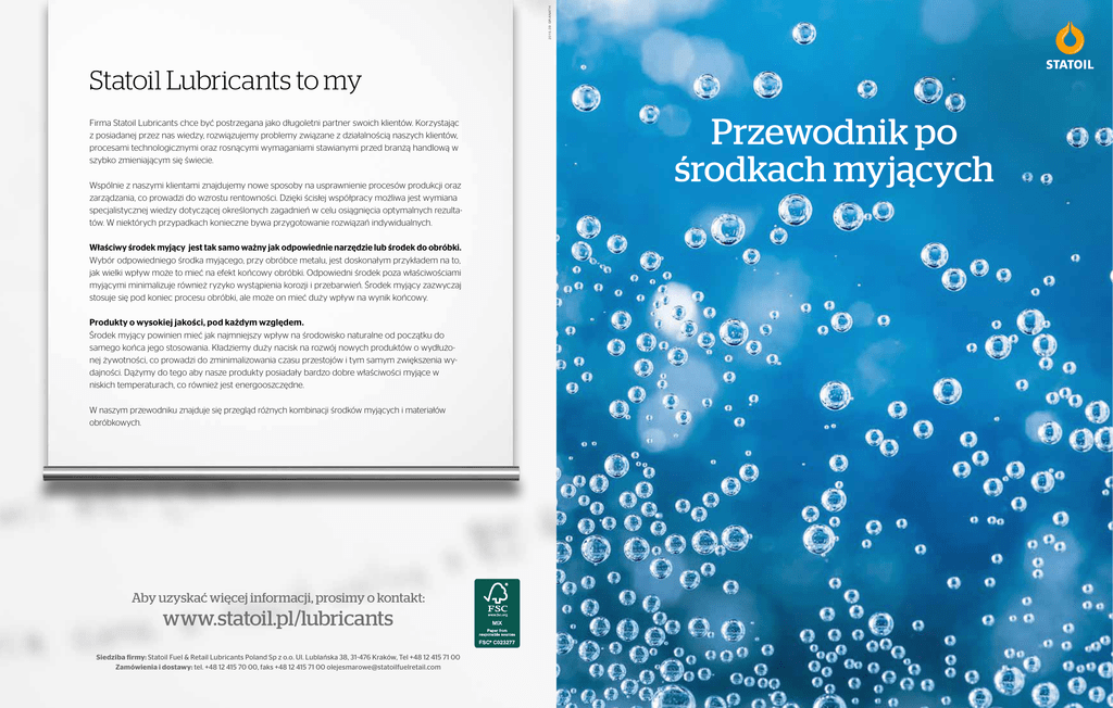 2 0 1 5 . 0 9 G R A N AT H Statoil Lubricants to my Firma Statoil Lubricants chce być postrzegana jako długoletni partner swoich klientów. Korzystając z posiadanej przez nas wiedzy, rozwiązujemy problemy związane z działalnością naszych klientów, procesami technologicznymi oraz rosnącymi wymaganiami stawianymi przed branżą handlową w szybko zmieniającym się świecie. Wspólnie z naszymi klientami znajdujemy nowe sposoby na usprawnienie procesów produkcji oraz zarządzania, co prowadzi do wzrostu rentowności. Dzięki ścisłej współpracy możliwa jest wymiana specjalistycznej wiedzy dotyczącej określonych zagadnień w celu osiągnięcia optymalnych rezultatów. W niektórych przypadkach konieczne bywa przygotowanie rozwiązań indywidualnych. Właściwy środek myjący jest tak samo ważny jak odpowiednie narzędzie lub środek do obróbki. Wybór odpowiedniego środka myjącego, przy obróbce metalu, jest doskonałym przykładem na to, jak wielki wpływ może to mieć na efekt końcowy obróbki. Odpowiedni środek poza właściwościami myjącymi minimalizuje również ryzyko wystąpienia korozji i przebarwień. Środek myjący zazwyczaj stosuje się pod koniec procesu obróbki, ale może on mieć duży wpływ na wynik końcowy. Produkty o wysokiej jakości, pod każdym względem. Środek myjący powinien mieć jak najmniejszy wpływ na środowisko naturalne od początku do samego końca jego stosowania. Kładziemy duży nacisk na rozwój nowych produktów o wydłużonej żywotności, co prowadzi do zminimalizowania czasu przestojów i tym samym zwiększenia wydajności. Dążymy do tego aby nasze produkty posiadały bardzo dobre właściwości myjące w niskich temperaturach, co również jest energooszczędne. W naszym przewodniku znajduje się przegląd różnych kombinacji środków myjących i materiałów obróbkowych. Aby uzyskać więcej informacji, prosimy o kontakt: www.statoil.pl/lubricants Siedziba firmy: Statoil Fuel & Retail Lubricants Poland Sp z o.o. Ul. Lublańska 38, 31-476 Kraków, Tel +48 12 415 71 00 Zamówienia i dostawy: tel. +48 12 415 70 00, faks +48 12 415 71 00 [email protected] Przewodnik po środkach myjących Zastosowanie środków myjących Produkt Temperatura Mętnienia °C Zalecana Temperatura °C Zalecane Stężenie % 36°C 30–50°C 2–7% CleanWay SF 936 Współczynnik TA-faktor pH 5% 1,18 9,5 Oznaczanie stężenie metodą całkowitej alkaliczności ( TA) za pomocą miareczkowania Tak +++ +++ ++ CleanWay SF 1000 N.A. 20–80°C 1–5% 1,20 9,8 Tak +++ +++ + CleanWay SF 1150 50°C 45–70°C 3–6% 5,70 10,9 Tak +++ ++ - CleanWay 111 55°C 20–60°C 1–3% 7,40 9,7 Nie ++ + + CleanWay 122 N.A. 20–80°C 2–5% 6,90 9,5 Nie +++ +++ + CleanWay 132 36°C 30–50°C 3–7% 5,10 10,0 Nie +++ ++ + CleanWay 143 N.A. 20–80°C 3–10% 3,40 9,9 Nie ++ ++ + CleanWay X FE >80°C 60–80°C 2–6% 1,92 11,9 Nie ++ ++ - CleanWay ALK >80°C 20–80°C 2–8% 4,54 11,3 Nie + + +++ Oznaczenia +++ Specjalnie opracowane do ++ Zalecane + Możliwe Miareczkować 0.5N HCl cały czas mieszając Nie zawiera Materiały: soli Stal ŻeliwoAluminium – Nie zalecane Kilka kropli Oranżu metylowego (wskaźnik) 20 ml próbka + 80 ml wody Wynik + • • • • • • • • Wlać 20ml lub 20gr próbki do 250ml kolby (E) i rozcieńczyć wodą aby uzyskać około 100ml roztworu. Dodać kilka kropli Oranżu metylowego (0,1% roztwór w wodzie destylowanej). Miareczkować 0.5N HCl cały czas mieszając aż do zmiany koloru z żółtego na czerwony. Stężenie jest wyliczane przez pomnożenie ilości kwasu z współczynnikiem TA odpowiednim dla danego produktu. C=VxF C = Stężenie w % V = ml 0,5 N HCl F = Współczynnik TA danego produktu Wziąć pod uwagę: Żeliwo Potrzeba dobrej ochrony przed korozją. Stopy miedzi Pasywatory i pH maksymalnie 9 Stal automatowa Potrzeba dobrej ochrony przed korozją. Stal niskostopowa Potrzeba dobrej ochrony przed korozją. Ogólne zasady postępowania ze środkami myjącymi 1. Należy wyznaczyć osobę odpowiedzialną za środki myjące. Do jej zadań należy: • kontrola prawidłowego stężenia w układach • wpisywanie danych dotyczących stężenia i wartości pH do dziennika rejestru • przeprowadzić odpowiednie działania korygujące , aby zachować optymalne właściwości płynu.. Stal wysokostopowaPasywatory. 2.Należy oznaczyć maszyny. W przypadku korzystania z różnych środków w różnych procesach obróbki, należy oznaczyć maszyny umieszczając na nich informację na temat rodzaju używanego w danej maszynie środka. Dzięki temu można uniknąć pomyłek, które mogą doprowadzić do pogorszenia właściwości środka myjącego. Stopy aluminium Niskie pH maksymalnie 9 lub dodać inhibitory. 3. Konieczne jest kontrolowanie stężenia poprzez miareczkowanie, aby mieć pewność, że znajduje się ono na właściwym poziomie. Stal nierdzewna Ewentualna potrzeba pasywatorów. 4. Należy dopełniać układ koncentratem/wodą. Stopy niklu Ryzyko alergii kontaktowej. 5. Należy zminimalizować ilość niepożądanego oleju obcego przy pomocy urządzeń typu „skimmer” oraz oddzielaczy. Tytan Niskie pH maksymalnie 9 lub dodać inhibitory. 6. Należy usuwać wióry i opiłki w sposób ciągły.