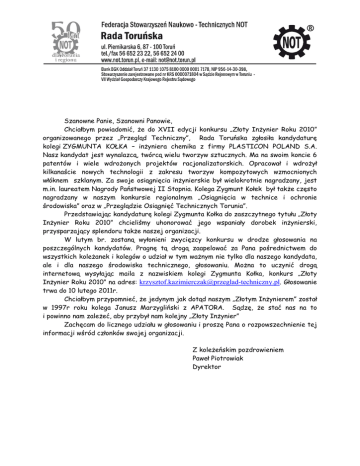 Szanowne Panie, Szanowni Panowie, Chciałbym powiadomić, że do XVII edycji konkursu „Złoty Inżynier Roku 2010” organizowanego przez „Przegląd Techniczny”, Rada Toruńska zgłosiła kandydaturę kolegi ZYGMUNTA KOŁKA – inżyniera chemika z firmy PLASTICON POLAND S.A. Nasz kandydat jest wynalazcą, twórcą wielu tworzyw sztucznych. Ma na swoim koncie 6 patentów i wiele wdrożonych projektów racjonalizatorskich. Opracował i wdrożył kilkanaście nowych technologii z zakresu tworzyw kompozytowych wzmocnionych włóknem szklanym. Za swoje osiągnięcia inżynierskie był wielokrotnie nagradzany, jest m.in. laureatem Nagrody Państwowej II Stopnia. Kolega Zygmunt Kołek był także często nagradzany w naszym konkursie regionalnym „Osiągnięcia w technice i ochronie środowiska” oraz w „Przeglądzie Osiągnięć Technicznych Torunia”. Przedstawiając kandydaturę kolegi Zygmunta Kołka do zaszczytnego tytułu „Złoty Inżynier Roku 2010” chcieliśmy uhonorować jego wspaniały dorobek inżynierski, przysparzający splendoru także naszej organizacji. W lutym br. zostaną wyłonieni zwycięzcy konkursu w drodze głosowania na poszczególnych kandydatów. Pragnę tą drogą zaapelować za Pana pośrednictwem do wszystkich koleżanek i kolegów o udział w tym ważnym nie tylko dla naszego kandydata, ale i dla naszego środowiska technicznego, głosowaniu. Można to uczynić drogą internetową wysyłając maila z nazwiskiem kolegi Zygmunta Kołka, konkurs „Złoty Inżynier Roku 2010” na adres: [email protected]. Głosowanie trwa do 10 lutego 2011r. Chciałbym przypomnieć, że jedynym jak dotąd naszym „Złotym Inżynierem” został w 1997r roku kolega Janusz Marzygliński z APATORA. Sądzę, że stać nas na to i powinno nam zależeć, aby przybył nam kolejny „Złoty Inżynier” Zachęcam do licznego udziału w głosowaniu i proszę Pana o rozpowszechnienie tej informacji wśród członków swojej organizacji. Z koleżeńskim pozdrowieniem Paweł Piotrowiak Dyrektor