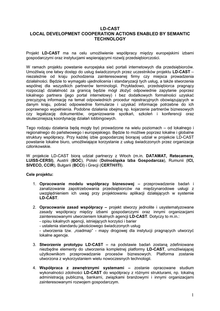 LD-CAST LOCAL DEVELOPMENT COOPERATION ACTIONS ENABLED BY SEMANTIC TECHNOLOGY Projekt LD-CAST ma na celu umoŜliwienie współpracy między europejskimi izbami gospodarczymi oraz instytucjami wspierającymi rozwój przedsiębiorczości. W ramach projektu powstanie europejska sieć portali internetowych dla przedsiębiorców. UmoŜliwią one łatwy dostęp do usług świadczonych przez uczestników projektu LD-CAST – niezaleŜnie od kraju pochodzenia zainteresowanej firmy czy miejsca prowadzenia działalności. Będzie to wymagało ujednolicenia i standaryzacji tych usług, a takŜe stworzenia wspólnej dla wszystkich partnerów terminologii. Przykładowo, przedsiębiorca pragnący rozpocząć działalność za granicą będzie mógł złoŜyć odpowiednie zapytanie poprzez lokalnego partnera (jego portal internetowy) i bez dodatkowych formalności uzyskać precyzyjną informację na temat odpowiednich procedur rejestracyjnych obowiązujących w danym kraju, pobrać odpowiednie formularze i uzyskać informacje potrzebne do ich poprawnego wypełnienia. Podobne działania obejmą np. kojarzenie partnerów biznesowych czy legalizację dokumentów, organizowanie spotkań, szkoleń i konferencji oraz skuteczniejszą koordynację działań lobbingowych. Tego rodzaju działania będą mogły być prowadzone na wielu poziomach – od lokalnego i regionalnego do państwowego i europejskiego. Będzie to moŜliwe poprzez lokalne i globalne struktury współpracy. Przy kaŜdej izbie gospodarczej biorącej udział w projekcie LD-CAST powstanie lokalne biuro, umoŜliwiające korzystanie z usług świadczonych przez organizacje członkowskie. W projekcie LD-CAST biorą udział partnerzy z Włoch (m.in. DATAMAT, Retecamere, LUISS-CERSI), Austrii (BOC), Polski (Dolnośląska Izba Gospodarcza), Rumunii (ICI, SIVECO, CCIR), Bułgarii (BCCI) i Grecji (CERTH/ITI). Cele projektu: 1. Opracowanie modelu współpracy biznesowej – przeprowadzenie badań i zanalizowanie zapotrzebowania przedsiębiorców na międzynarodowe usługi z uwzględnieniem ich uwag przy projektowaniu aplikacji działających w systemie LD-CAST. 2. Opracowanie zasad współpracy – projekt stworzy jednolite i usystematyzowane zasady współpracy między izbami gospodarczymi oraz innymi organizacjami zainteresowanymi utworzeniem lokalnych agencji LD-CAST. Dotyczy to m.in.: - opisu lokalnych agencji, istniejących korzyści i barier - ustalenia standardu jakościowego świadczonych usług - utworzenia tzw. „roadmap” - mapy drogowej dla instytucji pragnących utworzyć lokalne agencje. 3. Stworzenie prototypu LD-CAST – na podstawie badań zostaną zdefiniowane niezbędne elementy do utworzenia kompletnej platformy LD-CAST, umoŜliwiającej uŜytkownikom przeprowadzanie procesów biznesowych. Platforma zostanie utworzona z wykorzystaniem wielu nowoczesnych technologii. 4. Współpraca z zewnętrznymi systemami – zostanie opracowane studium wykonalności zdolności LD-CAST do współpracy z róŜnymi strukturami, np. lokalną administracją publiczną, bankami, związkami branŜowymi i innymi organizacjami zainteresowanymi rozwojem gospodarczym. 1 5. Plan promocji i wykorzystania uzyskanych rezultatów – zostanie opracowana strategia promocji projektu, która będzie miała na celu dotarcie z wiedzą o LD-CAST do potencjalnych uŜytkowników końcowych (firmy) i izb gospodarczych niezrzeszonych w projekcie. Taki plan wykorzystania rezultatów projektu i jego promocji ma być „Ŝywym” dokumentem, aktualizowanym 2 razy w roku. Ma on pierwotnie powstać po 6 miesiącach od startu przedsięwzięcia. Całkowity koszt projektu LD-CAST wyniesie ponad 2,5 mln euro. Jego realizacja potrwa 30 miesięcy. 2