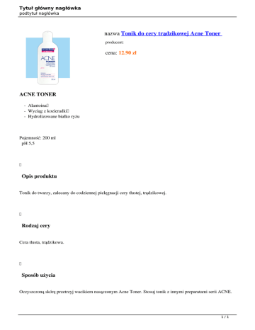 Tytuł główny nagłówka podtytuł nagłówka nazwa Tonik do cery trądzikowej Acne Toner producent: cena: 12.90 zł ACNE TONER - Alantoina - Wyciąg z kozieradki - Hydrolizowane białko ryżu Pojemność: 200 ml pH 5,5 Opis produktu Tonik do twarzy, zalecany do codziennej pielęgnacji cery tłustej, trądzikowej. Rodzaj cery Cera tłusta, trądzikowa. Sposób użycia Oczyszczoną skórę przetrzyj wacikiem nasączonym Acne Toner. Stosuj tonik z innymi preparatami serii ACNE. 1/1