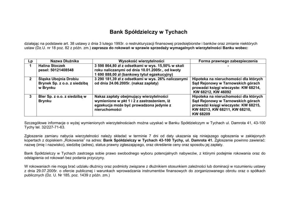 Bank Spółdzielczy w Tychach działając na podstawie art. 38 ustawy z dnia 3 lutego 1993r. o restrukturyzacji finansowej przedsiębiorstw i banków oraz zmianie niektórych ustaw (Dz.U. nr 18 poz. 82 z późn. zm.) zaprasza do rokowań w sprawie sprzedaŜy wymagalnych wierzytelności Banku wobec: Lp 1 Nazwa DłuŜnika Halina Stoczek pesel: 50121408548 2 Śląska Ubojnia Drobiu Brynek Sp. z o.o. z siedzibą w Brynku 3 Bler Sp. z o.o. z siedzibą w Brynku Wysokość wierzytelności 3 598 864,80 zł z odsetkami w wys. 15,50% w skali roku naliczanymi od dnia 10.01.2005r., od kwoty 1 690 888,00 zł (bankowy tytuł egzekucyjny) 3 290 181,39 zł z odsetkami w wys. 26% naliczanymi od dnia 24.06.2005r. (nakaz zapłaty) Nakaz zapłaty obejmujący wierzytelności wymienione w pkt 1 i 2 z zastrzeŜeniem, iŜ egzekucja moŜe być prowadzona jedynie z nieruchomości Forma prawnego zabezpieczenia - Hipoteka na nieruchomości dla których Sąd Rejonowy w Tarnowskich górach prowadzi księgi wieczyste: KW 68214, KW 68212, KW 46092 Hipoteka na nieruchomości dla których Sąd Rejonowy w Tarnowskich górach prowadzi księgi wieczyste: KW 68215, KW 68213, KW 68211, KW 68210, KW 68209 Szczegółowe informacje o wyŜej wymienionych wierzytelnościach moŜna uzyskać w Banku Spółdzielczym w Tychach ul. Damrota 41, 43-100 Tychy tel. 32/227-71-63. Zgłoszenie zamiaru nabycia wierzytelności naleŜy składać w terminie 7 dni od daty ukazania się niniejszego ogłoszenia w zaklejonych kopertach z dopiskiem „Rokowania” na adres: Bank Spółdzielczy w Tychach 43-100 Tychy, ul. Damrota 41. Zgłoszenie powinno zawierać: nazwę (imię i nazwisko), siedzibę (adres), status prawny zgłaszającego, oraz określenie ceny oraz sposobu jej zapłaty. Bank Spółdzielczy w Tychach zastrzega sobie prawo swobodnego wyboru potencjalnych nabywców, z którymi podejmie rokowania oraz do odstąpienia od rokowań bez podania przyczyny. W rokowaniach nie mogą brać udziału dłuŜnicy oraz podmioty związane z dłuŜnikiem stosunkiem zaleŜności lub dominacji w rozumieniu ustawy z dnia 29.07.2005r. o ofercie publicznej i warunkach wprowadzania instrumentów finansowych do zorganizowanego obrotu oraz o spółkach publicznych (Dz. U. Nr 185, poz. 1439 z późn. zm.)