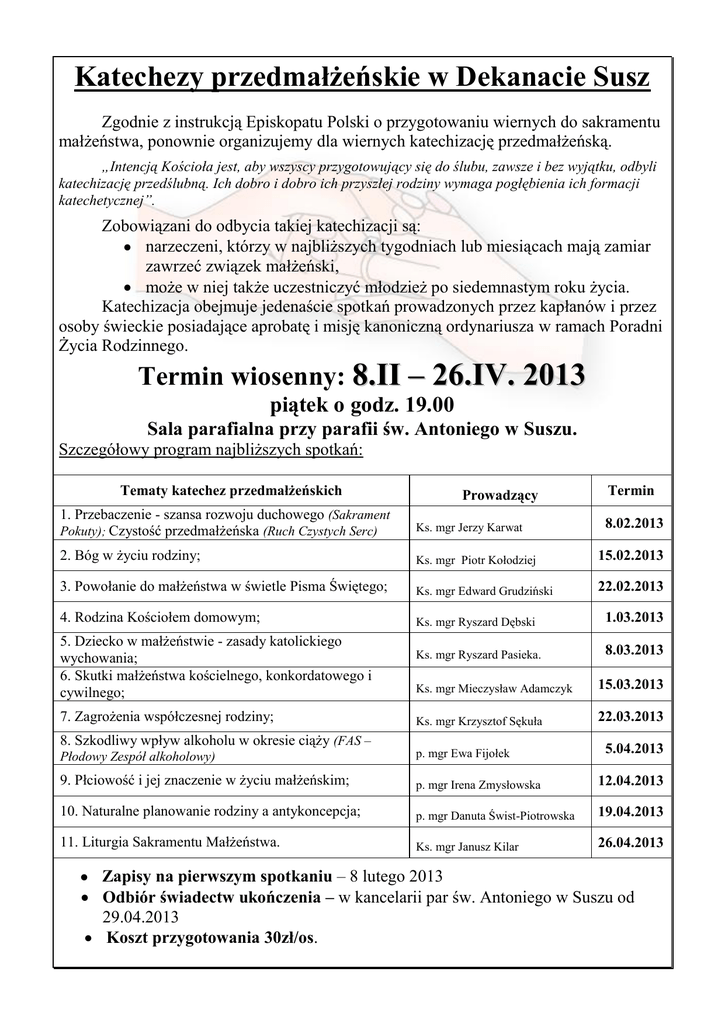 Katechezy przedmałżeńskie w Dekanacie Susz Zgodnie z instrukcją Episkopatu Polski o przygotowaniu wiernych do sakramentu małżeństwa, ponownie organizujemy dla wiernych katechizację przedmałżeńską. „Intencją Kościoła jest, aby wszyscy przygotowujący się do ślubu, zawsze i bez wyjątku, odbyli katechizację przedślubną. Ich dobro i dobro ich przyszłej rodziny wymaga pogłębienia ich formacji katechetycznej”. Zobowiązani do odbycia takiej katechizacji są: narzeczeni, którzy w najbliższych tygodniach lub miesiącach mają zamiar zawrzeć związek małżeński, może w niej także uczestniczyć młodzież po siedemnastym roku życia. Katechizacja obejmuje jedenaście spotkań prowadzonych przez kapłanów i przez osoby świeckie posiadające aprobatę i misję kanoniczną ordynariusza w ramach Poradni Życia Rodzinnego. Termin wiosenny: 8.II – 26.IV. 2013 piątek o godz. 19.00 Sala parafialna przy parafii św. Antoniego w Suszu. Szczegółowy program najbliższych spotkań: Tematy katechez przedmałżeńskich Prowadzący Termin 1. Przebaczenie - szansa rozwoju duchowego (Sakrament Pokuty); Czystość przedmałżeńska (Ruch Czystych Serc) Ks. mgr Jerzy Karwat 2. Bóg w życiu rodziny; Ks. mgr Piotr Kołodziej 15.02.2013 3. Powołanie do małżeństwa w świetle Pisma Świętego; Ks. mgr Edward Grudziński 22.02.2013 4. Rodzina Kościołem domowym; Ks. mgr Ryszard Dębski 1.03.2013 Ks. mgr Ryszard Pasieka. 8.03.2013 5. Dziecko w małżeństwie - zasady katolickiego wychowania; 6. Skutki małżeństwa kościelnego, konkordatowego i cywilnego; 7. Zagrożenia współczesnej rodziny; 8. Szkodliwy wpływ alkoholu w okresie ciąży (FAS – 8.02.2013 Ks. mgr Mieczysław Adamczyk 15.03.2013 Ks. mgr Krzysztof Sękuła 22.03.2013 5.04.2013 Płodowy Zespół alkoholowy) p. mgr Ewa Fijołek 9. Płciowość i jej znaczenie w życiu małżeńskim; p. mgr Irena Zmysłowska 12.04.2013 10. Naturalne planowanie rodziny a antykoncepcja; p. mgr Danuta Świst-Piotrowska 19.04.2013 11. Liturgia Sakramentu Małżeństwa. Ks. mgr Janusz Kilar 26.04.2013 Zapisy na pierwszym spotkaniu – 8 lutego 2013 Odbiór świadectw ukończenia – w kancelarii par św. Antoniego w Suszu od 29.04.2013 Koszt przygotowania 30zł/os.