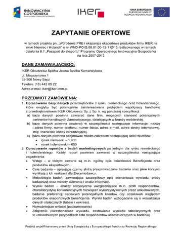 ZAPYTANIE OFERTOWE w ramach projektu pn. „Wdrożenie PRE i ekspansja eksportowa produktów firmy IKER na rynki Niemiec i Holandii” o nr WND-POIG.06.01.00-12-112/13 realizowanego w ramach działania 6.1 „Paszport do eksportu” Programu Operacyjnego Innowacyjna Gospodarka na lata 2007-2013 DANE ZAMAWIAJĄCEGO: IKER Obtułowicz Spółka Jawna Spółka Komandytowa ul. Magazynowa 1 33-300 Nowy Sącz Telefon: (18) 442 85 22 Adres e-mail: [email protected] PRZEDMIOT ZAMÓWIENIA: 1. Opracowanie bazy danych przedsiębiorstw z rynku niemieckiego oraz holenderskiego, które mogłyby być potencjalnie zainteresowane podjęciem współpracy handlowej z przedsiębiorstwem IKER Obtułowicz Sp. j. Sp. k. wg poniższej specyfikacji: a) baza danych powinna zawierać dane firm, mogących stanowić potencjalnych partnerów handlowych Zamawiającego, działających w branży meblarskiej. b) baza danych powinna zawierać w szczególności następujące informacje: nazwę i adres firmy, numer telefonu, numer faksu, adres e-mail, adres strony internetowej, imię i nazwisko osoby zarządzającej. c) baza danych powinna obejmować swoim zakresem następującą ilość rekordów: rynek niemiecki – 1 000 rynek holenderski – 650 2. Opracowanie raportów z badań marketingowych po jednym dla rynku niemieckiego i holenderskiego. Każdy raport powinien zawierać w szczególności następujące zagadnienia: Wstęp – w którym zawarte są m.in. ogólny opis działalności Beneficjenta oraz produktów eksportowych. Cele badania – opisujące czemu służą przeprowadzane badania oraz jakie korzyści wynikają z ich realizacji dla Zleceniodawcy. Metodologia badań, zawierająca szczegółowy opis scenariusza wywiadu, próby badawczej oraz metody zbierania i analiz informacji. Wyniki badań – analizy statystyczne uwzgledniające m.in. profil respondentów, charakterystykę konkurencyjnych rozwiązań wykorzystywanych przez ankietowanych, badanie preferencji cenowych potencjalnych klientów czy oczekiwań względem produktów eksportowych beneficjenta. Wyniki badań wzbogacane są o wizualizacje danych statecznych (tabele i wykresy). Najważniejsze wnioski (podsumowanie) Załączniki (kwestionariusz wywiadu, zestawienie wyników tabelarycznych oraz w uzasadnionych przypadkach lista respondentów uczestniczących w badaniu) Projekt współfinansowy przez Unię Europejską z Europejskiego Funduszu Rozwoju Regionalnego 3. Opracowanie raportów z określenia, wyselekcjonowania, sprawdzenia wiarygodności grupy docelowej potencjalnych partnerów handlowych dla IKER Obtułowicz Sp. j. Sp. k. oraz przygotowaniu ofert współpracy na dwóch rynkach zagranicznych: niemieckim i holenderskim. Raport powinien obejmować swoim zakresem 200 podmiotów z rynku niemieckiego oraz 100 podmiotów z rynku holenderskiego oraz zawierać następujące informacje: wypis ze stron internetowych z zakresem działalności; weryfikację danych adresowych; weryfikację danych rejestrowych; weryfikację sytuacji finansowej; przygotowanie ofert współpracy dla rekomendowanych podmiotów. Wszystkie elementy przedmiotu zamówienia muszą oznaczenia zgodnie z wytycznymi zawartymi w aktualnym przewodniku w zakresie promocji projektów finansowanych w ramach programu operacyjnego innowacyjna gospodarka 2007 – 2013. OFERTA POWINNA ZAWIERAĆ: nazwę oferenta; adres lub siedzibę oferenta; cenę całkowitą netto i brutto (za każdy element przedmiotu zamówienia); datę sporządzenia i ważności oferty; oferta powinna być podpisana przez osobę upoważnioną. Zastrzegamy sobie prawo do odrzucenia ofert nie zawierających ww. informacji. TERMIN I MIEJSCE SKŁADANIA OFERT: Oferta powinna być złożona w formie pisemnej (osobiście lub pocztą na adres siedziby Zamawiającego) lub w formie elektronicznej (na adres e-mail Zamawiającego). Termin składania ofert upływa w dniu 22.01.2015 r. Decyduje data wpłynięcia oferty. TERMIN REALIZACJI ZAMÓWIENIA: do 01.02.2015 roku do 31.03.2015 roku KRYTERIA WYBORU OFERTY: Oferty które nie zostały odrzucone z przyczyn formalnych i merytorycznych oraz oferty, które spełniają warunki Zapytania Ofertowego zostaną ocenione w oparciu o następujące kryteria: 1) CENA – 100%. Jeżeli nie będzie można dokonać wyboru oferty najkorzystniejszej na podstawie przyjętego kryterium ze względu na to, iż dwie lub więcej ofert będzie posiadać taką samą najniższą cenę Zamawiający przeprowadzi negocjacje z Wykonawcami. Wszelkich dodatkowych informacji w sprawie przedmiotu zamówienia udziela Janusz Obtułowicz– tel. 602710947 Projekt współfinansowy przez Unię Europejską z Europejskiego Funduszu Rozwoju Regionalnego