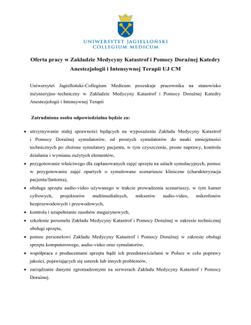 Oferta pracy w Zakładzie Medycyny Katastrof i Pomocy Doraźnej Katedry Anestezjologii i Intensywnej Terapii UJ CM Uniwersytet Jagielloński-Collegium Medicum poszukuje pracownika na stanowisko inżynieryjno–techniczny w Zakładzie Medycyny Katastrof i Pomocy Doraźnej Katedry Anestezjologii i Intensywnej Terapii Zatrudniona osoba odpowiedzialna będzie za: utrzymywanie stałej sprawności będących na wyposażeniu Zakładu Medycyny Katastrof i Pomocy Doraźnej symulatorów, od prostych symulatorów do nauki umiejętności technicznych po złożone symulatory pacjenta, w tym czyszczenie, proste naprawy, kontrola działania i wymiana zużytych elementów, przygotowanie właściwego dla zaplanowanych zajęć sprzętu na salach symulacyjnych, pomoc w przygotowaniu zajęć opartych o symulowane scenariusze kliniczne (charakteryzacja pacjenta/fantoma), obsługa sprzętu audio-video używanego w trakcie prowadzenia scenariuszy, w tym kamer cyfrowych, projektorów multimedialnych, mikserów audio-video, mikrofonów bezprzewodowych i przewodowych, kontrola i uzupełnianie zasobów magazynowych, szkolenie personelu Zakładu Medycyny Katastrof i Pomocy Doraźnej w zakresie technicznej obsługi sprzętu, pomoc personelowi Zakładu Medycyny Katastrof i Pomocy Doraźnej w zakresie obsługi sprzętu komputerowego, audio-video oraz symulatorów, współpraca z producentami sprzętu bądź ich przedstawicielami w Polsce w celu poprawy jakości, pojawiających się usterek lub innych problemów, zarządzanie danymi zgromadzonymi na serwerach Zakładu Medycyny Katastrof i Pomocy Doraźnej. Wymagania: wykształcenie min. średnie (preferowane techniczne), znajomość języka angielskiego w stopniu podstawowym, umiejętność obsługi cyfrowego i analogowego sprzętu audio-wideo, wiedza i umiejętności z zakresu prostych napraw sprzętu elektronicznego i technicznego, dobra organizacja czasu pracy, dokładność, sumienność, komunikatywność i umiejętność pracy w zespole wielospecjalistycznym, chęć stałego podnoszenia swoich kwalifikacji, dyspozycyjność – możliwa (dodatkowo płatna) praca w weekendy, mile widziane doświadczenie w zakresie obsługi symulatorów medycznych. Wymagane dokumenty: pisemne zgłoszenie udziału w konkursie, CV, kserokopie dokumentów potwierdzających wykształcenie oraz staż pracy, kserokopie zaświadczeń o ukończonych kursach i szkoleniach oraz innych dodatkowych dokumentów potwierdzających nabyte umiejętności, podpisane własnoręcznie oświadczenie Kandydata o wyrażeniu zgody na przetwarzanie danych osobowych do celów rekrutacji o następującej treści: "Wyrażam zgodę na przetwarzanie moich danych osobowych do realizacji procesu rekrutacji prowadzonego przez Uniwersytet Jagielloński - Collegium Medicum, zgodne z ustawą z dnia 29.08.1997 r. o ochronie danych osobowych (tekst jedn. Dz. U. z 2014, poz. 1182)". Termin składania dokumentów: do 5 stycznia 2017 r. Forma składania ofert: dokumenty proszę złożyć w sekretariacie Zakładu Medycyny Katastrof i Pomocy Doraźnej Katedry Anestezjologii i Intensywnej Terapii Uniwersytetu Jagiellońskiego Collegium Medicum, ul. Kopernika 19, 31-501 Kraków, w godzinach od 8: 00 – 15:00 lub drogą elektroniczną na adres e-mail [email protected]