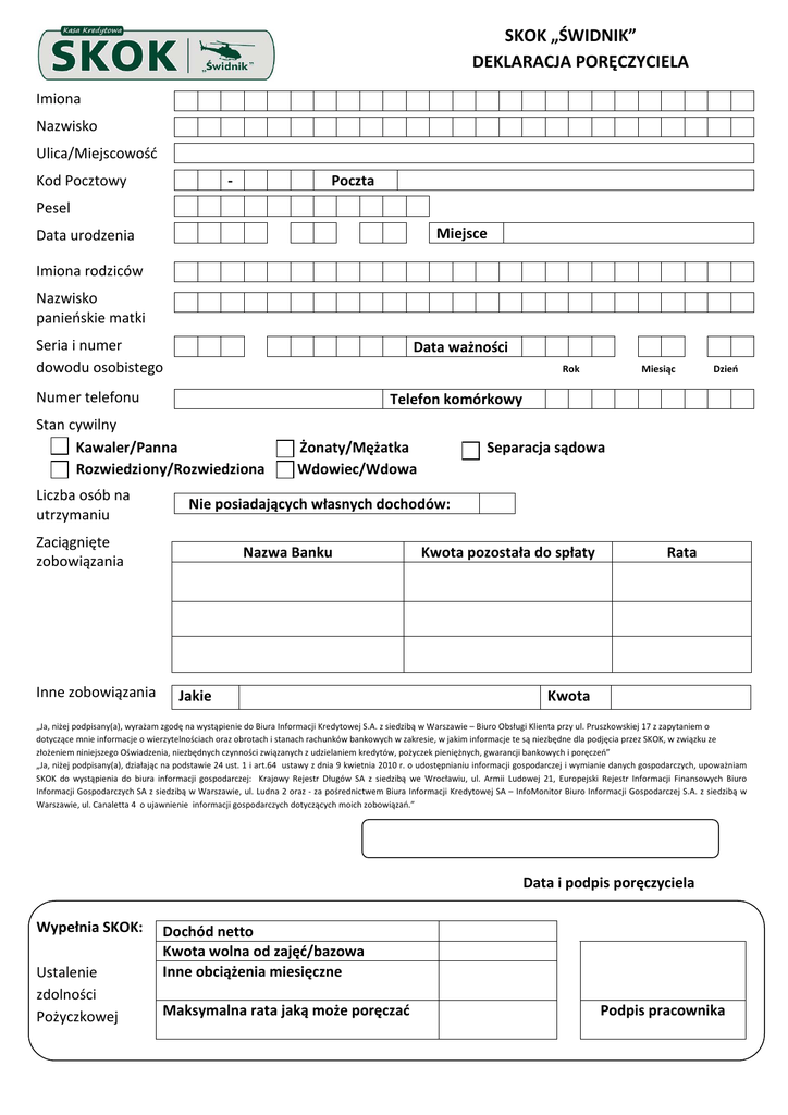 SKOK „ŚWIDNIK” DEKLARACJA PORĘCZYCIELA Imiona Nazwisko Ulica/Miejscowość - Kod Pocztowy Poczta Pesel Miejsce Data urodzenia Imiona rodziców Nazwisko panieńskie matki Seria i numer dowodu osobistego Data ważności Rok Numer telefonu Żonaty/Mężatka Wdowiec/Wdowa Separacja sądowa Nie posiadających własnych dochodów: Zaciągnięte zobowiązania Inne zobowiązania Dzień Telefon komórkowy Stan cywilny Kawaler/Panna Rozwiedziony/Rozwiedziona Liczba osób na utrzymaniu Miesiąc Nazwa Banku Jakie Kwota pozostała do spłaty Rata Kwota „Ja, niżej podpisany(a), wyrażam zgodę na wystąpienie do Biura Informacji Kredytowej S.A. z siedzibą w Warszawie – Biuro Obsługi Klienta przy ul. Pruszkowskiej 17 z zapytaniem o dotyczące mnie informacje o wierzytelnościach oraz obrotach i stanach rachunków bankowych w zakresie, w jakim informacje te są niezbędne dla podjęcia przez SKOK, w związku ze złożeniem niniejszego Oświadzenia, niezbędnych czynności związanych z udzielaniem kredytów, pożyczek pieniężnych, gwarancji bankowych i poręczeń” „Ja, niżej podpisany(a), działając na podstawie 24 ust. 1 i art.64 ustawy z dnia 9 kwietnia 2010 r. o udostępnianiu informacji gospodarczej i wymianie danych gospodarczych, upoważniam SKOK do wystąpienia do biura informacji gospodarczej: Krajowy Rejestr Długów SA z siedzibą we Wrocławiu, ul. Armii Ludowej 21, Europejski Rejestr Informacji Finansowych Biuro Informacji Gospodarczych SA z siedzibą w Warszawie, ul. Ludna 2 oraz - za pośrednictwem Biura Informacji Kredytowej SA – InfoMonitor Biuro Informacji Gospodarczej S.A. z siedzibą w Warszawie, ul. Canaletta 4 o ujawnienie informacji gospodarczych dotyczących moich zobowiązań.” Data i podpis poręczyciela Wypełnia SKOK: Ustalenie zdolności Pożyczkowej Dochód netto Kwota wolna od zajęć/bazowa Inne obciążenia miesięczne Maksymalna rata jaką może poręczać Podpis pracownika SKOK „ŚWIDNIK” DEKLARACJA PORĘCZYCIELA Imiona Nazwisko Ulica/Miejscowość - Kod Pocztowy Poczta Pesel Miejsce Data urodzenia Imiona rodziców Nazwisko panieńskie matki Seria i numer dowodu osobistego Data ważności Rok Numer telefonu Żonaty/Mężatka Wdowiec/Wdowa Separacja sądowa Nie posiadających własnych dochodów: Zaciągnięte zobowiązania Inne zobowiązania Dzień Telefon komórkowy Stan cywilny Kawaler/Panna Rozwiedziony/Rozwiedziona Liczba osób na utrzymaniu Miesiąc Nazwa Banku Jakie Kwota pozostała do spłaty Rata Kwota „Ja, niżej podpisany(a), wyrażam zgodę na wystąpienie do Biura Informacji Kredytowej S.A. z siedzibą w Warszawie – Biuro Obsługi Klienta przy ul. Pruszkowskiej 17 z zapytaniem o dotyczące mnie informacje o wierzytelnościach oraz obrotach i stanach rachunków bankowych w zakresie, w jakim informacje te są niezbędne dla podjęcia przez SKOK, w związku ze złożeniem niniejszego Oświadzenia, niezbędnych czynności związanych z udzielaniem kredytów, pożyczek pieniężnych, gwarancji bankowych i poręczeń” „Ja, niżej podpisany(a), działając na podstawie 24 ust. 1 i art.64 ustawy z dnia 9 kwietnia 2010 r. o udostępnianiu informacji gospodarczej i wymianie danych gospodarczych, upoważniam SKOK do wystąpienia do biura informacji gospodarczej: Krajowy Rejestr Długów SA z siedzibą we Wrocławiu, ul. Armii Ludowej 21, Europejski Rejestr Informacji Finansowych Biuro Informacji Gospodarczych SA z siedzibą w Warszawie, ul. Ludna 2 oraz - za pośrednictwem Biura Informacji Kredytowej SA – InfoMonitor Biuro Informacji Gospodarczej S.A. z siedzibą w Warszawie, ul. Canaletta 4 o ujawnienie informacji gospodarczych dotyczących moich zobowiązań.” Data i podpis poręczyciela Wypełnia SKOK: Ustalenie zdolności Pożyczkowej Dochód netto Kwota wolna od zajęć/bazowa Inne obciążenia miesięczne Maksymalna rata jaką może poręczać Podpis pracownika
