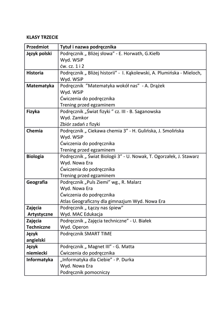 KLASY TRZECIE Przedmiot Język polski Historia Matematyka Fizyka Chemia Biologia Geografia Zajęcia Artystyczne Zajęcia Techniczne Język angielski Język niemiecki Informatyka Tytuł i nazwa podręcznika Podręcznik „ Bliżej słowa” - E. Horwath, G.Kiełb Wyd. WSiP ćw. cz. 1 i 2 Podręcznik „ Bliżej historii” - I. Kąkolewski, A. Plumińska - Mieloch, Wyd. WSiP Podręcznik ”Matematyka wokół nas” - A. Drążek Wyd. WSiP Ćwiczenia do podręcznika Trening przed egzaminem Podręcznik „Świat fizyki ” cz. III - B. Saganowska Wyd. Zamkor Zbiór zadań z fizyki Podręcznik „ Ciekawa chemia 3” - H. Gulińska, J. Smolińska Wyd. WSiP Ćwiczenia do podręcznika Trening przed egzaminem Podręcznik „ Świat Biologii 3” - U. Nowak, T. Ogorzałek, J. Stawarz Wyd. Nowa Era Ćwiczenia do podręcznika Trening przed egzaminem Podręcznik „Puls Ziemi” wg., R. Malarz Wyd. Nowa Era Ćwiczenia do podręcznika Atlas Geograficzny dla gimnazjum Wyd. Nowa Era Podręcznik „ Łączy nas śpiew” Wyd. MAC Edukacja Podręcznik „ Zajęcia techniczne” - U. Białek Wyd. Operon Podręcznik SMART TIME Podręcznik „ Magnet III” - G. Matta Ćwiczenia do podręcznika „Informatyka dla Ciebie” - P. Durka Wyd. Nowa Era Podręcznik pomocniczy Wiedza Podręcznik „ Dziś i jutro” o Wyd. Nowa Era społeczeństw ie Religia Podręcznik do nauczania religii „W drodze do Emaus – Jezus prowadzi i zbawia”
