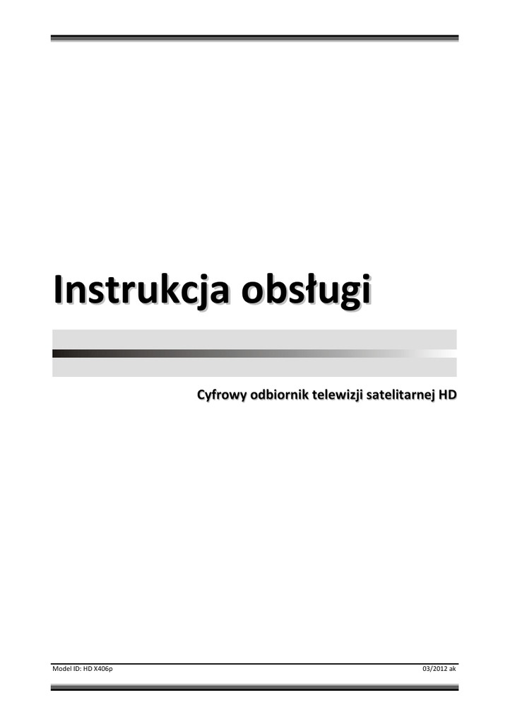 Instrukcja obsługi Cyfrowy odbiornik telewizji satelitarnej HD Model ID: HD X406p 03/2012 ak Spis treści 1. OCHRONA ŚRODOWISKA................................................................................................................................................ 6 2. UWAGI EKSPLOATACYJNE............................................................................................................................................... 7 2.1. Automatyczne wyłączenie zasilania.......................................................................................................................... 7 2.2. Współpraca z zewnętrznym napędem USB (dotyczy odbiorników ze złączem USB) ................................................... 7 2.3. Instalacja baterii w pilocie ........................................................................................................................................ 8 3. CECHY URZĄDZENIA ....................................................................................................................................................... 9 4. AKCESORIA ..................................................................................................................................................................... 9 5. OPIS PRODUKTU............................................................................................................................................................. 9 5.1. Panel przedni ........................................................................................................................................................... 9 5.2. Otworzony panel przedni ....................................................................................................................................... 10 5.3. Panel Tylny............................................................................................................................................................. 10 5.4. Pilot Zdalnego Sterowania...................................................................................................................................... 11 6. POŁĄCZENIA Z INNYMI URZĄDZENIAMI. ....................................................................................................................... 12 6.1. Podłączenie do Telewizora...................................................................................................................................... 12 6.2. Podłączenie Anteny ................................................................................................................................................ 13 7. PODŁĄCZENIE ELEKTRYCZNE. WŁĄCZENIE ODBIORNIKA................................................................................................ 14 8. PODSTAWOWA OBSŁUGA ............................................................................................................................................ 15 8.1. TV/R ...................................................................................................................................................................... 15 8.2. Wyciszenie ............................................................................................................................................................. 15 8.3. Display ................................................................................................................................................................... 15 8.4. Mode ..................................................................................................................................................................... 15 8.5. Napisy.................................................................................................................................................................... 15 8.6. Time ...................................................................................................................................................................... 15 8.7. Sleep ...................................................................................................................................................................... 15 8.8. Numeryczny wybór kanału ..................................................................................................................................... 15 8.9. Zoom ..................................................................................................................................................................... 15 8.10. Ulubione ................................................................................................................................................................ 15 8.11. Dźwięk ................................................................................................................................................................... 16 8.12. SAT ........................................................................................................................................................................ 16 8.13. Poprzedni kanał ..................................................................................................................................................... 16 8.14. EPG ........................................................................................................................................................................ 16 8.15. Wyjście .................................................................................................................................................................. 16 8.16. Następny / poprzedni kanał ................................................................................................................................... 16 8.17. Zwiększenie / zmniejszenie głośności ..................................................................................................................... 16 8.18. 