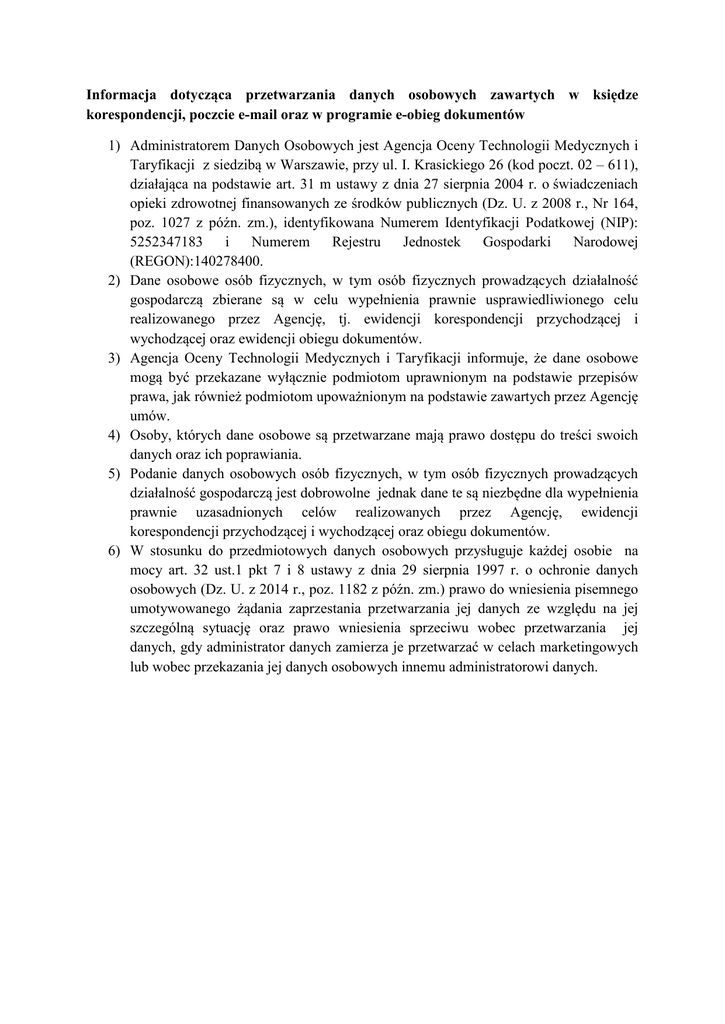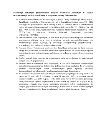 Informacja dotycząca przetwarzania danych osobowych zawartych w księdze korespondencji, poczcie e-mail oraz w programie e-obieg dokumentów 1) Administratorem Danych Osobowych jest Agencja Oceny Technologii Medycznych i Taryfikacji z siedzibą w Warszawie, przy ul. I. Krasickiego 26 (kod poczt. 02 – 611), działająca na podstawie art. 31 m ustawy z dnia 27 sierpnia 2004 r. o świadczeniach opieki zdrowotnej finansowanych ze środków publicznych (Dz. U. z 2008 r., Nr 164, poz. 1027 z późn. zm.), identyfikowana Numerem Identyfikacji Podatkowej (NIP): 5252347183 i Numerem Rejestru Jednostek Gospodarki Narodowej (REGON):140278400. 2) Dane osobowe osób fizycznych, w tym osób fizycznych prowadzących działalność gospodarczą zbierane są w celu wypełnienia prawnie usprawiedliwionego celu realizowanego przez Agencję, tj. ewidencji korespondencji przychodzącej i wychodzącej oraz ewidencji obiegu dokumentów. 3) Agencja Oceny Technologii Medycznych i Taryfikacji informuje, że dane osobowe mogą być przekazane wyłącznie podmiotom uprawnionym na podstawie przepisów prawa, jak również podmiotom upoważnionym na podstawie zawartych przez Agencję umów. 4) Osoby, których dane osobowe są przetwarzane mają prawo dostępu do treści swoich danych oraz ich poprawiania. 5) Podanie danych osobowych osób fizycznych, w tym osób fizycznych prowadzących działalność gospodarczą jest dobrowolne jednak dane te są niezbędne dla wypełnienia prawnie uzasadnionych celów realizowanych przez Agencję, ewidencji korespondencji przychodzącej i wychodzącej oraz obiegu dokumentów. 6) W stosunku do przedmiotowych danych osobowych przysługuje każdej osobie na mocy art. 32 ust.1 pkt 7 i 8 ustawy z dnia 29 sierpnia 1997 r. o ochronie danych osobowych (Dz. U. z 2014 r., poz. 1182 z późn. zm.) prawo do wniesienia pisemnego umotywowanego żądania zaprzestania przetwarzania jej danych ze względu na jej szczególną sytuację oraz prawo wniesienia sprzeciwu wobec przetwarzania jej danych, gdy administrator danych zamierza je przetwarzać w celach marketingowych lub wobec przekazania jej danych osobowych innemu administratorowi danych.