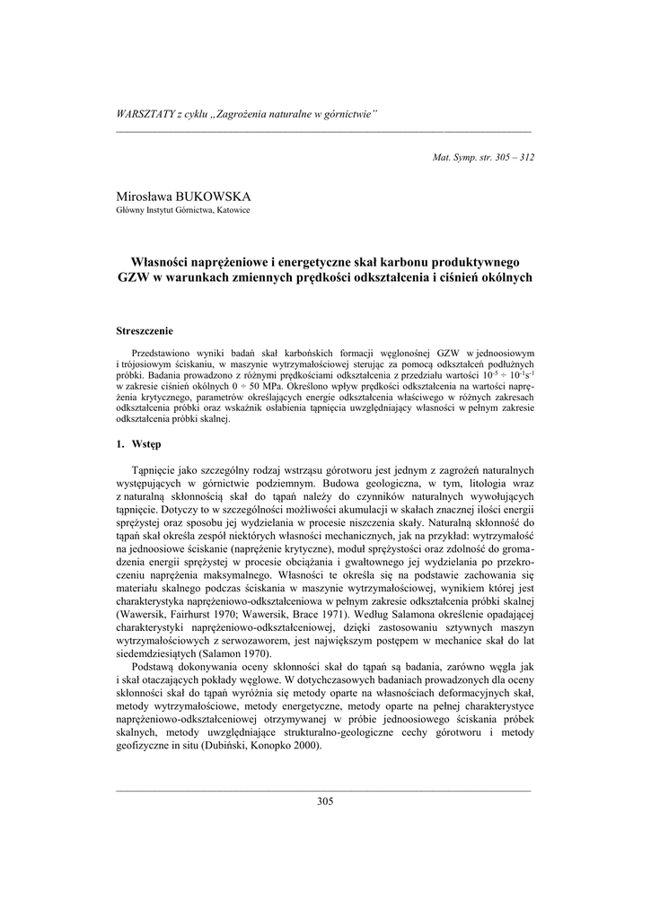 WARSZTATY z cyklu „Zagrożenia naturalne w górnictwie” ____________________________________________________________________________ Mat. Symp. str. 305 – 312 Mirosława BUKOWSKA Główny Instytut Górnictwa, Katowice Własności naprężeniowe i energetyczne skał karbonu produktywnego GZW w warunkach zmiennych prędkości odkształcenia i ciśnień okólnych Streszczenie Przedstawiono wyniki badań skał karbońskich formacji węglonośnej GZW w jednoosiowym i trójosiowym ściskaniu, w maszynie wytrzymałościowej sterując za pomocą odkształceń podłużnych próbki. Badania prowadzono z różnymi prędkościami odkształcenia z przedziału wartości 10-5 ÷ 10-1s-1 w zakresie ciśnień okólnych 0 ÷ 50 MPa. Określono wpływ prędkości odkształcenia na wartości naprężenia krytycznego, parametrów określających energie odkształcenia właściwego w różnych zakresach odkształcenia próbki oraz wskaźnik osłabienia tąpnięcia uwzględniający własności w pełnym zakresie odkształcenia próbki skalnej. 1. Wstęp Tąpnięcie jako szczególny rodzaj wstrząsu górotworu jest jednym z zagrożeń naturalnych występujących w górnictwie podziemnym. Budowa geologiczna, w tym, litologia wraz z naturalną skłonnością skał do tąpań należy do czynników naturalnych wywołujących tąpnięcie. Dotyczy to w szczególności możliwości akumulacji w skałach znacznej ilości energii sprężystej oraz sposobu jej wydzielania w procesie niszczenia skały. Naturalną skłonność do tąpań skał określa zespół niektórych własności mechanicznych, jak na przykład: wytrzymałość na jednoosiowe ściskanie (naprężenie krytyczne), moduł sprężystości oraz zdolność do gromadzenia energii sprężystej w procesie obciążania i gwałtownego jej wydzielania po przekroczeniu naprężenia maksymalnego. Własności te określa się na podstawie zachowania się materiału skalnego podczas ściskania w maszynie wytrzymałościowej, wynikiem której jest charakterystyka naprężeniowo-odkształceniowa w pełnym zakresie odkształcenia próbki skalnej (Wawersik, Fairhurst 1970; Wawersik, Brace 1971). Według Salamona określenie opadającej charakterystyki naprężeniowo-odkształceniowej, dzięki zastosowaniu sztywnych maszyn wytrzymałościowych z serwozaworem, jest największym postępem w mechanice skał do lat siedemdziesiątych (Salamon 1970). Podstawą dokonywania oceny skłonności skał do tąpań są badania, zarówno węgla jak i skał otaczających pokłady węglowe. W dotychczasowych badaniach prowadzonych dla oceny skłonności skał do tąpań wyróżnia się metody oparte na własnościach deformacyjnych skał, metody wytrzymałościowe, metody energetyczne, metody oparte na pełnej charakterystyce naprężeniowo-odkształceniowej otrzymywanej w próbie jednoosiowego ściskania próbek skalnych, metody uwzględniające strukturalno-geologiczne cechy górotworu i metody geofizyczne in situ (Dubiński, Konopko 2000). ____________________________________________________________________________ 305 M. BUKOWSKA – Własności naprężeniowe i energetyczne skał karbonu produktywnego... ____________________________________________________________________________ W ostatnich latach kryteria oceny skłonności skał do tąpań uwzględniają również pokrytyczne własności skał, badane w sztywnych maszynach wytrzymałościowych, w których otrzymuje się całkowitą charakterystykę naprężeniowo-odkształceniową, opisującą zachowanie się skał zarówno w części przedkrytycznej jak i w części pokrytycznej. Wśród nielicznych wskaźników skłonności do tąpań, uwzględniających pokrytyczną charakterystykę niszczenia próbki skalnej, na uwagę zasługuje wskaźnik osłabienia tąpnięcia, uwzględniający energię sprężystą i energię pokrytycznego niszczenia próbki (Krzysztoń 1989; Bukowska 2000), wskaźnik nazwany okresem dynamicznego rozpadu (Kidybiński, Smołka 1988), wskaźnik intensywności rozpraszania energii uwzględniający czas rozpadu próbki skalnej (Bukowska, Smołka 1994). Stałe doskonalenie metod badania własności mechanicznych skał jest przyczyną poszukiwań nowych możliwości oceny górotworu pod względem skłonności do tąpań. Interesującym wydaje się nowy wskaźnik skłonności górotworu do tąpań uwzględniający, zarówno własności pokrytyczne węgla jak i własności sprężyste skał otaczających, wskazując tym samym na obecność warstw wstrząsogennych – warstw o dużej zdolności do gromadzenia energii sprężystej, która w postaci energii wstrząsów sejsmicznych przekazywana do pokładu i zamieniana w energię kinetyczną powoduje dynamiczne jego niszczenie (Bukowska w druku). Zachowanie się górotworu naruszonego robotami górniczymi zależy między innymi od własności skał, w tym własności wytrzymałościowo-odkształceniowych, a te zależą od prędkości odkształcenia. Szereg niekorzystnych zjawisk w górotworze zachodzi z różnymi prędkościami. Przykładem mogą być tąpania, które mają charakter dynamiczny (10 -2 ÷ 102s-1) oraz powolne zaciskanie wyrobisk górniczych (konwergencja wyrobisk) o charakterze statycznym. W stateczności wyrobisk górniczych szczególnie ważne są prędkości odkształcenia, które występują przy urabianiu skał, na przykład metodami udarowymi (10 -2 ÷ 102 s-1) oraz prędkości odkształcenia występujące w otoczeniu wyrobisk eksploatacyjnych (10 -5 ÷ 10-3 s-1). 2. Wskaźniki skłonności skał do tąpań W artykule przedstawiono wpływ prędkości odkształcenia na wartości niektórych parametrów wyznaczonych z charakterystyk naprężeniowo-odkształceniowych. Są wśród nich: naprężenie krytyczne w jednoosiowym i trójosiowym ściskaniu (Bukowska 2000), energie właściwe w poszczególnych zakresach odkształcenia podłużnego próbki skalnej, na podstawie badań jednoosiowego ściskania, którego realizacja w warunkach laborator