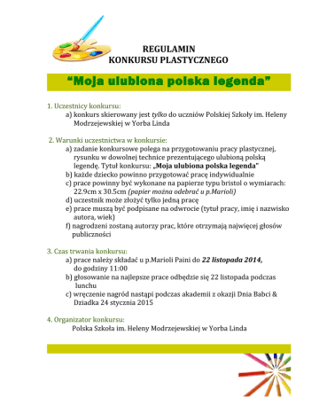REGULAMIN KONKURSU PLASTYCZNEGO “Moja ulubiona polska legenda” 1. Uczestnicy konkursu: a) konkurs skierowany jest tylko do uczniów Polskiej Szkoły im. Heleny Modrzejewskiej w Yorba Linda 2. Warunki uczestnictwa w konkursie: a) zadanie konkursowe polega na przygotowaniu pracy plastycznej, rysunku w dowolnej technice prezentującego ulubioną polską legendę. Tytuł konkursu: „Moja ulubiona polska legenda” b) każde dziecko powinno przygotować pracę indywidualnie c) prace powinny być wykonane na papierze typu bristol o wymiarach: 22.9cm x 30.5cm (papier można odebrać u p.Marioli) d) uczestnik może złożyć tylko jedną pracę e) prace muszą być podpisane na odwrocie (tytuł pracy, imię i nazwisko autora, wiek) f) nagrodzeni zostaną autorzy prac, które otrzymają najwięcej głosów publiczności 3. Czas trwania konkursu: a) prace należy składać u p.Marioli Paini do 22 listopada 2014, do godziny 11:00 b) głosowanie na najlepsze prace odbędzie się 22 listopada podczas lunchu c) wręczenie nagród nastąpi podczas akademii z okazji Dnia Babci & Dziadka 24 stycznia 2015 4. Organizator konkursu: Polska Szkoła im. Heleny Modrzejewskiej w Yorba Linda