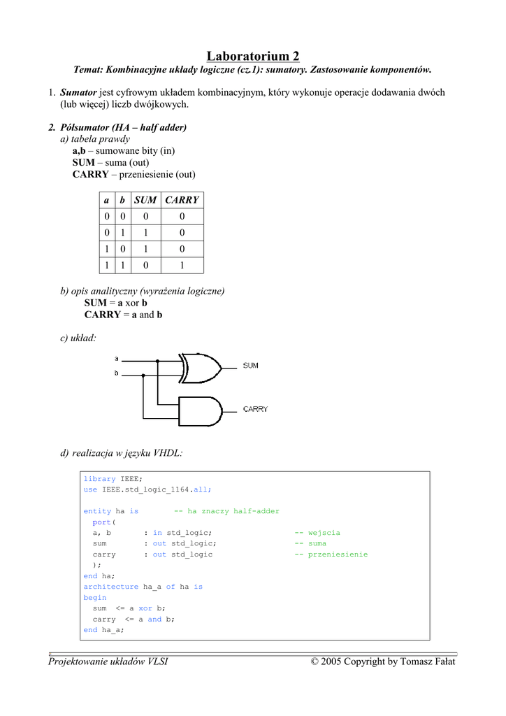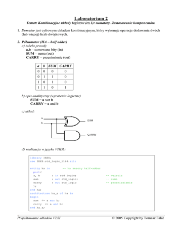 Laboratorium 2 Temat: Kombinacyjne układy logiczne (cz.1): sumatory. Zastosowanie komponentów. 1. Sumator jest cyfrowym układem kombinacyjnym, który wykonuje operacje dodawania dwóch (lub więcej) liczb dwójkowych. 2. Półsumator (HA – half adder) a) tabela prawdy a,b – sumowane bity (in) SUM – suma (out) CARRY – przeniesienie (out) a b SUM CARRY 0 0 0 0 0 1 1 0 1 0 1 0 1 1 0 1 b) opis analityczny (wyraŜenia logiczne) SUM = a xor b CARRY = a and b c) układ: d) realizacja w języku VHDL: library IEEE; use IEEE.std_logic_1164.all; entity ha is -- ha znaczy half-adder port( a, b : in std_logic; sum : out std_logic; carry : out std_logic ); end ha; architecture ha_a of ha is begin sum <= a xor b; carry <= a and b; end ha_a; Projektowanie układów VLSI -- wejscia -- suma -- przeniesienie © 2005 Copyright by Tomasz Fałat 3. Pełny sumator (FA - full adder) a) tabela prawdy a,b – sumowane bity (in) SUM – suma (out) Ci – przeniesienie (in) Co – przeniesienie (out) Ci a b SUM Co 0 0 0 0 0 0 0 1 1 0 0 1 0 1 0 0 1 1 0 1 1 0 0 1 0 1 0 1 0 1 1 1 0 0 1 1 1 1 1 1 b) opis analityczny SUM = a xor b xor Ci Co = (a and b) or (a and Ci) or (b and Ci) c) układ: d) realizacja w języku VHDL library IEEE; use IEEE.std_logic_1164.all; entity fa is -- fa znaczy full-adder port( a, b, ci : in std_logic; -- wejscia (ci -przeniesienie wej.) sum : out std_logic; -- suma co : out std_logic -- przeniesienie wyj. ); end fa; architecture fa_a of fa is begin sum <= a xor b xor ci; co <= (a and b) or (a and ci) or (b and ci); end fa_a; Projektowanie układów VLSI © 2005 Copyright by Tomasz Fałat 4. Sumator 2-bitowy a) realizowana funkcja: Q(q2q1q0)= A(a1a0)+B(b1b0) b) układ c) realizacja w języku VHDL library IEEE; use IEEE.std_logic_1164.all; use IEEE.std_logic_unsigned.all; entity sum_3 is port ( a1, a0 b1, b0 q2, q1, q0 ); end sum_3; : in std_logic; : in std_logic; : out std_logic -- wejscie 1 -- wejscie 2 -- wyjscie (suma) architecture sum_3_a of sum_3 is component ha is port( a, b : in std_logic; sum : out std_logic; carry : out std_logic ); end component; -- wejscia -- suma -- przeniesienie component fa is port( a, b, ci : in std_logic; sum : out std_logic; co : out std_logic ); end component; -- wejscia -- suma -- przeniesienie signal cc : std_logic; begin blok1: ha port map (a=>a0, b=>b0, sum=>q0, carry=>cc); blok2: fa port map (a=>a1, b=>b1, ci=>cc, sum=>q1, co=>q2); end sum_3_a; Projektowanie układów VLSI © 2005 Copyright by Tomasz Fałat 5. Komponenty Przy realizacji sumatora n-bitowego wystarczy zdefiniować (w osobnych plikach projektu) półsumator (ha) i pełny sumator (fa), a następnie wykorzystać je jako komponenty wewnątrz architektury sumatora n-bitowego. Deklaracje component informują kompilator, jak wyglądają części składowe (tu: sumatory ha i fa) układu. Deklaracja komponentu jest identyczna z deklaracją jednostki, ze słowem kluczowym entity zastąpionym przez component. 6. Zadania do realizacji w trakcie laboratorium: a) wykorzystując zdefiniowane komponenty zrealizować 4-bitowy sumator + testbench b) wykorzystując zdefiniowane komponenty zrealizować sumator MOD15 + testbench Rew. 2007, P.M. Szecówka Projektowanie układów VLSI © 2005 Copyright by Tomasz Fałat