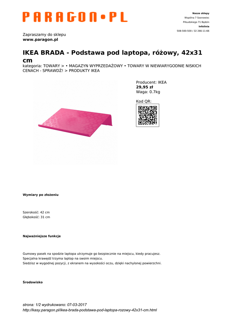 Nasze sklepy Wspólna 7 Sosnowiec Piłsudskiego 71 Będzin Infolinia 508-500-500 / 32 266-11-66 Zapraszamy do sklepu www.paragon.pl IKEA BRADA - Podstawa pod laptopa, różowy, 42x31 cm kategoria: TOWARY > • MAGAZYN WYPRZEDAŻOWY • TOWARY W NIEWIARYGODNIE NISKICH CENACH - SPRAWDŹ! > PRODUKTY IKEA Producent: IKEA 29,95 zł Waga: 0.7kg Kod QR: Wymiary po złożeniu Szerokość: 42 cm Głębokość: 31 cm Najważniejsze funkcje Gumowy pasek na spodzie laptopa utrzymuje go bezpiecznie na miejscu, kiedy pracujesz. Specjalna krawędź trzyma laptop na swoim miejscu. Siedzisz w wygodnej pozycji, z ekranem na wysokości oczu, dzięki nachylonej powierzchni. Środowisko strona: 1/2 wydrukowano: 07-03-2017 http://kasy.paragon.pl/ikea-brada-podstawa-pod-laptopa-rozowy-42x31-cm.html W zależności od lokalnych uwarunkowań, produkt po zużyciu może być przeznaczony do recyklingu lub odzysku energetycznego. Instrukcje dotyczące bezpieczeństwa Przecierać miękką tkaniną zwilżoną łagodnym środkiem do zmywania. Wycierać czystą suchą tkaniną Opis produktu wysokoudarzeniowe tworzywo polistyrenowe, guma syntetyczna strona: 2/2 wydrukowano: 07-03-2017 http://kasy.paragon.pl/ikea-brada-podstawa-pod-laptopa-rozowy-42x31-cm.html