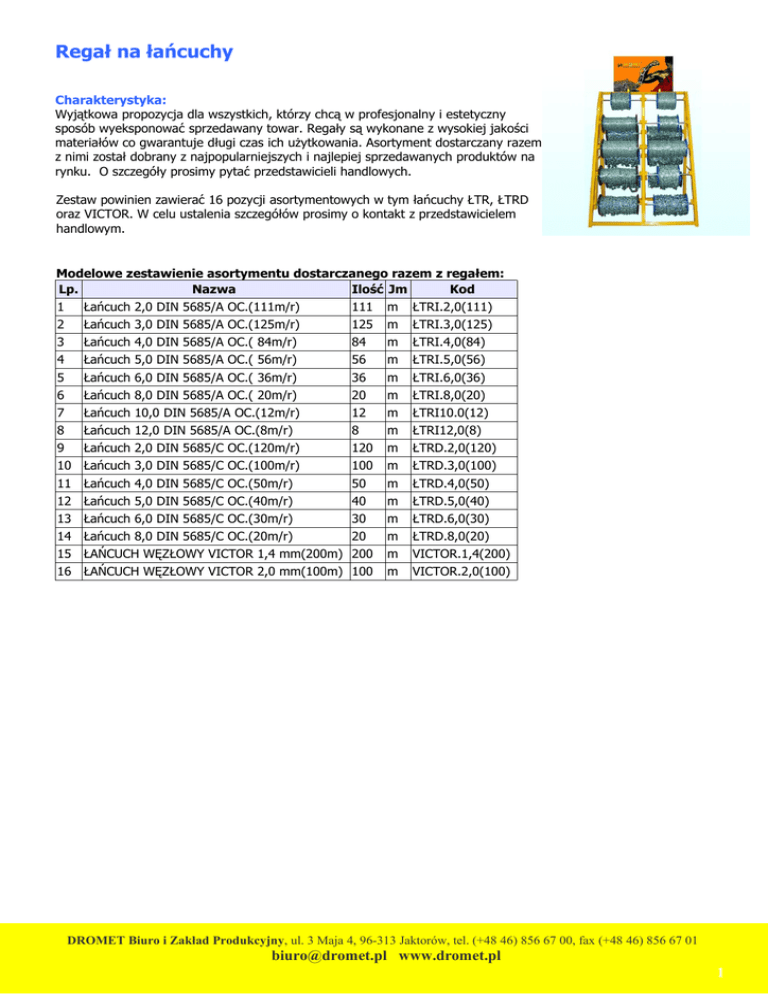 Regał na łańcuchy Charakterystyka: Wyjątkowa propozycja dla wszystkich, którzy chcą w profesjonalny i estetyczny sposób wyeksponować sprzedawany towar. Regały są wykonane z wysokiej jakości materiałów co gwarantuje długi czas ich użytkowania. Asortyment dostarczany razem z nimi został dobrany z najpopularniejszych i najlepiej sprzedawanych produktów na rynku. O szczegóły prosimy pytać przedstawicieli handlowych. Zestaw powinien zawierać 16 pozycji asortymentowych w tym łańcuchy ŁTR, ŁTRD oraz VICTOR. W celu ustalenia szczegółów prosimy o kontakt z przedstawicielem handlowym. Modelowe zestawienie asortymentu dostarczanego razem z regałem: Lp. Nazwa Ilość Jm Kod 1 Łańcuch 2,0 DIN 5685/A OC.(111m/r) 111 m ŁTRI.2,0(111) 2 Łańcuch 3,0 DIN 5685/A OC.(125m/r) 125 m ŁTRI.3,0(125) 3 Łańcuch 4,0 DIN 5685/A OC.( 84m/r) 84 m ŁTRI.4,0(84) 4 Łańcuch 5,0 DIN 5685/A OC.( 56m/r) 56 m ŁTRI.5,0(56) 5 Łańcuch 6,0 DIN 5685/A OC.( 36m/r) 36 m ŁTRI.6,0(36) 6 Łańcuch 8,0 DIN 5685/A OC.( 20m/r) 20 m ŁTRI.8,0(20) 7 Łańcuch 10,0 DIN 5685/A OC.(12m/r) 12 m ŁTRI10.0(12) 8 Łańcuch 12,0 DIN 5685/A OC.(8m/r) 8 m ŁTRI12,0(8) 9 Łańcuch 2,0 DIN 5685/C OC.(120m/r) 120 m ŁTRD.2,0(120) 10 Łańcuch 3,0 DIN 5685/C OC.(100m/r) 100 m ŁTRD.3,0(100) 11 Łańcuch 4,0 DIN 5685/C OC.(50m/r) 50 m ŁTRD.4,0(50) 12 Łańcuch 5,0 DIN 5685/C OC.(40m/r) 40 m ŁTRD.5,0(40) 13 Łańcuch 6,0 DIN 5685/C OC.(30m/r) 30 m ŁTRD.6,0(30) 14 Łańcuch 8,0 DIN 5685/C OC.(20m/r) 20 m ŁTRD.8,0(20) 15 ŁAŃCUCH WĘZŁOWY VICTOR 1,4 mm(200m) 200 m VICTOR.1,4(200) 16 ŁAŃCUCH WĘZŁOWY VICTOR 2,0 mm(100m) 100 m VICTOR.2,0(100) DROMET Biuro i Zakład Produkcyjny, ul. 3 Maja 4, 96-313 Jaktorów, tel. (+48 46) 856 67 00, fax (+48 46) 856 67 01 [email protected] www.dromet.pl 1