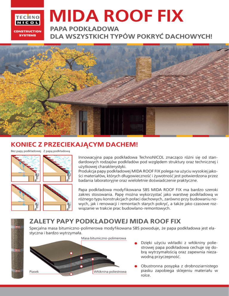 MIDA ROOF FIX PAPA PODKŁADOWA DLA WSZYSTKICH TYPÓW POKRYĆ DACHOWYCH! Koniec z przeciekającym dachem! Bez papy podkładowej Z papą podkładową Innowacyjna papa podkładowa TechnoNICOL znacząco różni się od standardowych rodzajów podkładów pod względem struktury oraz technicznej i użytkowej charakterystyki. Produkcja papy podkładowej MIDA ROOF FIX polega na użyciu wysokiej jakości materiałów, których długowieczność i żywotność jest potwierdzona przez badania laboratoryjne oraz wieloletnie doświadczenie praktyczne. Papa podkładowa modyfikowana SBS MIDA ROOF FIX ma bardzo szeroki zakres stosowania. Papę można wykorzystać jako warstwę podkładową w różnego typu konstrukcjach połaci dachowych, zarówno przy budowaniu nowych, jak i renowacji i remontach starych pokryć, a także jako czasowe rozwiązanie w trakcie prac budowlano-remontowych. Zalety papy podkładowej MIDA ROOF FIX Specjalna masa bitumiczno-polimerowa modyfikowana SBS powoduje, że papa podkładowa jest elastyczna i bardzo wytrzymała. Masa bitumiczno-polimerowa Dzięki użyciu wkładki z włókniny poliestrowej papa podkładowa cechuje się dobrą wytrzymałością oraz zapewnia niezawodną przyczepność. Piasek Włóknina poliestrowa Obustronna posypka z drobnoziarnistego piasku zapobiega sklejeniu materiału w rolce. Papa Podkładowa MIDA ROOF FIX pasuje do każdego rodzaju pokrycia dachowego! Zbyt wielu właścicieli domów spotyka sie z problemem przeciekającego dachu. TechnoNICOL przedstawia idealne rozwiązanie, które zapewni trwałe podłoże pod każde pokrycie dachowe. Papa MIDA ROOF FIX jest ultranowoczesną papą podkładową, zapobiegającą powstawaniu przecieków. Innowacyjność i uniwersalność tego produktu stawia go na pierwszym miejscu wśród materiałów podkładowych pod pokrycia dachowe. Ponadto, system dachowy oparty na gontach bitumicznych SHINGLAS oraz papie MIDA ROOF FIX, posiada badania w zakresie klasyfikacji ogniowej Broof (t1). Dane techniczne Wartość Długość / szerokość 25 / 1 [m] Ilość rolek na palecie 23 [szt.] Grubość 1,5 [mm] Osnowa Włóknina poliestrowa wzdłużne poprzeczne wzdłużne wzdłużne 343 [N/50mm] poprzeczne 300 [N/50mm] wzdłużne 50 [%] poprzeczne 50 [%] Giętkość w niskich temperaturach ≤ -20 [oC] Temperatura mięknięcia ≥ 95 [oC] Reakcja na ogień Klasa E Klasyfikacja ogniowa Broof (t1) Systemy dachowe z wykorzystaniem papy MIDA ROOF FIX B A 1. A - Gont bitumiczny B - Blachodachówka 2. Papa podkładowa MIDA ROOF FIX 3. Płyta OSB lub pełne deskowanie 4. Łata 5. Krokiew 6. Kontrłata do stworzenia szczeliny wentylacyjnej 7. Membrana paroprzepuszczalna 8. Paroizolacja 9. Łaty pod ocieplenie 10. Termoizolacja 11. Płyta G-K System dachowy klasy Broof (t1) Montaż nowego pokrycia dachowego KONTAKT: Prace renowacyjne TechnoNICOL Polska sp. z o.o. 05-500 Piaseczno ul. Gen. L. Okulickiego 7/9 tel. +48 22 886 48 86 fax +48 22 886 49 60 Tymczasowe pokrycie dachowe Wielu właścicieli domów spotyka sie z problemem przeciekającego dachu. TechnoNICOL przedstawia idealne rozwiązanie - ultranowoczesna papa podkładowa, zapobiegająca powstawaniu przecieków! Aby uzyskać szczegółową informację na temat oferty TechnoNICOL Polska sp. z o.o. prosimy o kontakt z biurem lub regionalnymi przedstawicielami handlowymi. Dane kontaktowe znajdują się na stronie internetowej: www.technonicol.pl