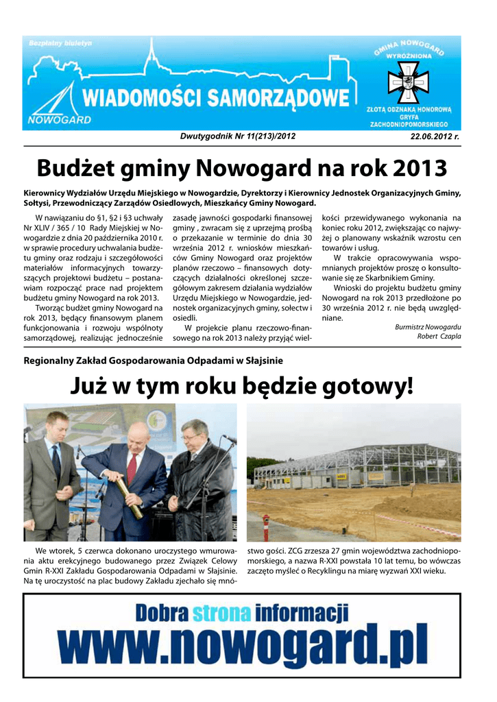 Dwutygodnik Nr 11(213)/2012 22.06.2012 r. Budżet gminy Nowogard na rok 2013 Kierownicy Wydziałów Urzędu Miejskiego w Nowogardzie, Dyrektorzy i Kierownicy Jednostek Organizacyjnych Gminy, Sołtysi, Przewodniczący Zarządów Osiedlowych, Mieszkańcy Gminy Nowogard. W nawiązaniu do §1, §2 i §3 uchwały Nr XLIV / 365 / 10 Rady Miejskiej w Nowogardzie z dnia 20 października 2010 r. w sprawie procedury uchwalania budżetu gminy oraz rodzaju i szczegółowości materiałów informacyjnych towarzyszących projektowi budżetu – postanawiam rozpocząć prace nad projektem budżetu gminy Nowogard na rok 2013. Tworząc budżet gminy Nowogard na rok 2013, będący finansowym planem funkcjonowania i rozwoju wspólnoty samorządowej, realizując jednocześnie zasadę jawności gospodarki finansowej gminy , zwracam się z uprzejmą prośbą o przekazanie w terminie do dnia 30 września 2012 r. wniosków mieszkańców Gminy Nowogard oraz projektów planów rzeczowo – finansowych dotyczących działalności określonej szczegółowym zakresem działania wydziałów Urzędu Miejskiego w Nowogardzie, jednostek organizacyjnych gminy, sołectw i osiedli. W projekcie planu rzeczowo-finansowego na rok 2013 należy przyjąć wiel- kości przewidywanego wykonania na koniec roku 2012, zwiększając co najwyżej o planowany wskaźnik wzrostu cen towarów i usług. W trakcie opracowywania wspomnianych projektów proszę o konsultowanie się ze Skarbnikiem Gminy. Wnioski do projektu budżetu gminy Nowogard na rok 2013 przedłożone po 30 września 2012 r. nie będą uwzględniane. Burmistrz Nowogardu Robert Czapla Regionalny Zakład Gospodarowania Odpadami w Słajsinie Już w tym roku będzie gotowy! We wtorek, 5 czerwca dokonano uroczystego wmurowania aktu erekcyjnego budowanego przez Związek Celowy Gmin R-XXI Zakładu Gospodarowania Odpadami w Słajsinie. Na tę uroczystość na plac budowy Zakładu zjechało się mnó- stwo gości. ZCG zrzesza 27 gmin województwa zachodniopomorskiego, a nazwa R-XXI powstała 10 lat temu, bo wówczas zaczęto myśleć o Recyklingu na miarę wyzwań XXI wieku. WIADOMOŒCI SAMORZ¥DOWE 2 22.06.2012 r. W baśniowych klimatach Wernisaż nowogardzianki Bożeny Kubiak “ Dzień bez malowania - to dzień stracony” O tym, że miasto nasze artystycznie uzdolnionymi ludźmi stoi - pisałem nieraz. Potwierdzeniem mojej hipotezy jest kolejna wystawa, tym razem malarstwa i rysunku wielce utalentowanej nowogardzianki pani Bożeny Kubiak, której otwarcie miało miejsce 11 czerwca br w piwnicznym salonie wystawienniczym miejscowej biblioteki. Całość ekspozycji prezentuje się niezwykle kolorowo. Nic dziwnego, ponieważ autorka jest zafascynowana malarstwem impresjonistów i surrealistów, szczególnie Salvadorem Dali, czerpiąc z nich inspiracje do własnej twórczości. Na szczególną uwagę zasługuje kilka portretów legendarnych gwiazd filmowych kunsztownie wykonanych oraz oryginalne krajobrazy. Pani Bożena Kubiak jest amatorką w najlepszym słowa tego znaczeniu – taki rodzimy Janko Muzykant od malowania. Z rozbrajającą szczerością mówi, że nie ukończyła żadnej szkoły artystycznej (marzenie życia) z prozaicznych powodów - braku pieniędzy. Jest osobą bardzo pracowitą - dzień bez malowania to dzień stracony. Obdarzona fantazją i wyobraźnią tworzy swój własny, intymny mikrokosmos. Napawa optymizmem fakt uczestniczenia w wernisażu stałych bywalców biblioteki, którzy w przyszłości być może staną się zalążkiem życia towarzyskiego i kulturalnego w Nowogardzie. Jest to bądź co bądź także forma integrująca lokalne społeczeństwo i podtrzymująca kruche więzi międzyludzkie. Właśnie poprzez luźne rozmowy przy lampce wina i to niekoniecznie o sztuce czy doznaniach estetycznych. Takiej inicjatywie należy tylko przyklasnąć i życzyć powodzenia bohaterce wystawy i wszystkim pracownikom biblioteki. Tekst M. A. Frydryk, foto Franciszek Karolewski Medal dla Marty Krzywanii W dniu 24 maja burmistrz przyjmował uroczyście w restauracji „Kamena” pary małżeńskie, które przeżyły w związku małżeńskim 50 lat, by wręczyć im „Medale za Długoletnie Pożycie Małżeńskie” przyznane przez Prezydenta RP Bronisława Komorowskiego. Niestety uroczystości nie doczekał Józef Karzywania. W dniu 12 czerwca burmistrz udał się do mieszkania pani Marty Krzywania, by oficjalnie wręczyć medal, dyplom z podziękowaniami od władz samorządowych, upominek i kwiaty. Pani Marta po wieloletniej pracy w bankowości jest na emeryturze. Dzieci, z postawy których jest bardzo zadowolona mieszkają w Szczecinie. Wnuki uzdolnione artystycznie (muzyka, grafika) osiągają już sukcesy - szkoda tylko, że nie mogą być bliżej babci. Brakuje tego zwyczajnego, codziennego kontaktu. Nie czuje się jednak samotnie dzięki wspaniałym sąsiadkom i przyjaciółkom. Słuchając opowieści o tych przyjaźniach, bezinteresownej pomocy w czasie gdy najbardziej tego potrzeba nabiera się wiary w ludzi. Ważna jest także aktywność, zainteresowanie problemami miasta, życiowe doświadczenie i mądrość, którymi to wartościami chce się wciąż służyć innym. Dużo zdrowia Pani Marto! tekst i fot. Lesław M. Marek 22.06.2012 r. WIADOMOŒCI SAMORZ¥DOWE Bezkolizyjna Sesja Rady Miejskiej Tematem Sesji Rady Miejskiej w dniu 2 czerwca 2012 roku było przyjęcie uchwały dot. zmiany miejscowego planu zagospodarowania przestrzennego dla części obrębu Słajsino-gmina Nowogard, w związku z budową Regionalnego Zakładu Przetwarzania Odpadów w tej miejscowości. Przy wymaganym kworum, uchwałę przyjęto jednogłośnie, co jest ewenementem i dobrze świadczy o prospołecznej postawie wszystkich radnych, zarówno z opozycji jak i koalicji SLD-PSL. Marian A. Frydryk Ulica Kowalska dwukierunkowa Uwzględniając wnioski mieszkańców wspólnoty mieszkaniowej, przy ul. Kowalskiej 1, w roku ubiegłym gmina Nowogard wyremontowała przyległy do wspólnoty 