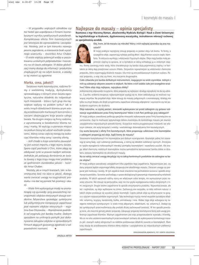 olej new 4-10-07 11:38 Page 19 | kosmetyki do masa˝u | – W przypadku wi´kszych oÊrodków czy te˝ hoteli spa wspó∏praca z firmami kosmetycznymi wynika z praktycznych przes∏anek. Kompleksowa oferta firm kosmetycznych jest ∏atwiejsza do wprowadzenia i zarzàdzania. Niestety, jest w tym kierunku rozwoju pewne zagro˝enie, a mianowicie brak wyraênego wizerunku – stwierdza Artur Chaber. – O wiele wi´kszy potencja∏ widz´ w poszukiwaniu unikalnych pó∏produktów i tworzeniu na ich bazie zabiegów. W dobie globalizacji mamy dost´p do informacji i produktów znajdujàcych si´ na ca∏ym Êwiecie, a zasoby w tej materii sà ogromne. Najlepsze do masa˝y – opinia specjalisty Rozmowa z mgr Marzenà Roman, absolwentkà Wydzia∏u Biologii i Nauk o Ziemi Uniwersytetu Jagielloƒskiego w Krakowie, dyplomowanà masa˝ystkà, instruktorem rekreacji ruchowej ze specjalnoÊcià aerobik. Olej, krem, ˝el do masa˝u czy mleczko? Który z nich najlepiej sprawdza si´ przy masa˝ach? W mojej praktyce najcz´Êciej stosuj´ preparaty w postaci oleju lub kremu. Te formy, a szczególnie oleje, zapewniajà nale˝yty poÊlizg d∏oni i dajà klientce uczucie ciep∏a i komfortu. Te odczucia wynikajà z w∏aÊciwoÊci fizycznych olejów. Oleje majà bardzo ma∏à pojemnoÊç cieplnà co sprawia, ˝e w kontakcie ze skórà och∏adzajà jà w znikomym stopniu. Kremy zawierajà nieco wody, która charakteryzuje si´ bardzo du˝à pojemnoÊcià cieplnà i w kontakcie ze skórà dajà przejÊciowe uczucie ch∏odu. OczywiÊcie najwa˝niejsze sà w∏aÊciwoÊci chemiczne preparatu, które wspomagajà dzia∏anie masa˝u i dla mnie sà one podstawowym kryterium wyboru. Postaç preparatu, a wi´c olej czy krem, ma znaczenie drugorz´dne. Cia∏o cz∏owieka jest bardzo delikatnym instrumentem, reagujàcym na wiele czynników. Jednym z Marka, cena, jakoÊç? nich sà substancje aktywne zawarte w olejkach. Na które z nich ludzkie cia∏o jest szczególnie wra˝- Âwiatowe marki kosmetyczne, rodzime firmy z wieloletnià tradycjà, dystrybutorzy sprowadzajàcy z ró˝nych stron Êwiata egzotyczne, naturalne sk∏adniki do indywidualnych mieszanek – która z tych grup ma najwi´ksze wp∏ywy na polskim rynku? Jak w wielu innych dziedzinach biznesu prym wiodà przedstawiciele markowych koncernów z sieciami obejmujàcymi kraje prawie ca∏ego Êwiata. Na drugim miejscu sà firmy rodzime, z ugruntowanà w ÊwiadomoÊci klienta nazwà i markà. W wyÊcigu o pierwsze miejsce na podium biorà te˝ udzia∏ wschodni producenci, którzy coraz cz´Êciej starajà si´ zaskoczyç klientów niskà cenà i szerokà ofertà. – JeÊli chodzi o kraje orientalne zauwa˝alny jest wzrost importu z tego rejonu Êwiata. Spora cz´Êç pochodzi z Chin, które zdajà si´ zdobywaç rynki w prawie ka˝dym sektorze. Jednak˝e jak pokazujà doniesienia ze Êwiata towary z tego kraju mogà mieç problemy ze spe∏nieniem standardów jakoÊci – twierdzi Artur Chaber. Niestety, jak w innych bran˝ach, tak i w kosmetycznej iloÊç nie idzie w jakoÊç, dlatego warto zwracaç uwag´ na oryginalnoÊç produktu i nie daç si´ ponieÊç fali promocji i okazji. – Wiele firm wykorzystuje mod´ na aromaterapi´ czy ajurwed´ i przy powszechnej nieznajomoÊci olejków eterycznych stosuje ewidentne fa∏szerstwa sprzedajàc syntetyczne lub pó∏syntetyczne kompozycje zapachowe pod nazwami olejków eterycznych – wyjaÊnia Ewa Olszewska. – Rozró˝nienie podróbki od orygina∏u jest bardzo trudne. Dobrym sposobem na unikni´cia pomy∏ki jest dokonywanie zakupów olejków w sprawdzonych firmach dajàcych gwarancj´ zgodnoÊci z odpowiednimi normami. liwe? Które oleje dajà najlepsze, najszybsze efekty? Jednoznacznej odpowiedzi na pytanie, które preparaty sà najlepsze i dzia∏ajà najszybciej nie da si´ udzieliç. Z punktu widzenia terapeuty najkorzystniejsze wydajà si´ te, które oddzia∏ywujà na mo˝liwie najwi´cej zmys∏ów. Na przyk∏ad oleje, które stosuj´ do masa˝y po∏àczonych z aromaterapià, dzia∏ajà nie tylko na zmys∏ dotyku ale dzi´ki przyjemnemu zapachowi u∏atwiajà odpr´˝enie i wyciszenie czy te˝ pobudzenie organizmu do dzia∏ania. Oleje naturalne, w czystej postaci, mieszanki wykonywane tu˝ przed zabiegiem czy gotowe substancje wyprodukowane przez firmy kosmetyczne? Które z nich Pani preferuje przy zabiegach? W mojej praktyce zawodowej preferuj´ specjalne mieszanki wykonywane przez firmy kosmetyczne na zamówienie. Daje to mo˝liwoÊç optymalnego doboru kosmetyku do konkretnego masa˝u jak równie˝ uwzgl´dnienia indywidualnych potrzeb klienta. OczywiÊcie mo˝na przygotowywaç mieszanki we w∏asnym zakresie, ale wol´ korzystaç z wiedzy i wieloletniego doÊwiadczenia firm kosmetycznych. Czy warto korzystaç z oferty firm kosmetycznych, które proponujàc ca∏oÊciowe linie kosmetyków z zabiegami proponujà te˝ oleje, bàdê kremy do masa˝u? Stosowanie kompleksowych linii kosmetyków jest dobrym rozwiàzaniem. Kosmetyki jednej linii zawierajà t´ samà baz´, czyli substancje podstawowà, a ró˝nià si´ sk∏adem substancji czynnych. Zmniejsza to ryzyko wystàpienia niekorzystnych interakcji pomi´dzy kosmetykami i wywo∏ania uczuleƒ. Ale znajàc sk∏ad chemiczny niektórych kosmetyków mo˝na samodzielnie komponowaç bardzo dobre w dzia∏aniu zestawy kosmetyków do okreÊlonych masa˝y. Na co nale˝y zwracaç uwag´ decydujàc si´ na zakup konkretnych produktów do zabiegów na bazie olejów? W mojej praktyce zawodowej uwzgl´dniam kilka aspektów tego zagadnienia. Najwa˝niejsze jest, czy dany preparat b´dzie wspomaga∏ efekty terapeutyczne okreÊlonego masa˝u. Zwracam uwag´ czy preparat jest markowy i Êwie˝y. W tym aspekcie du˝e znaczenie ma pochodzenie surowca i sposób otrzymywania produktu. Surowiec pochodzàcy z upraw ekologicznych gwarantuje niepowtarzalnà witalnoÊç produktu. W takich uprawach roÊliny rosnà we w∏aÊciwym sobie tempie, nie w