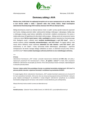 Informacja prasowa Warszawa, 15.02.2010 Domowy zabieg z AVA Mroźna zima, krótki dzień nie wpływają korzystnie ani na nasze samopoczucie ani na skórę. Warto w tym okresie zadbać o siebie i zapewnić sobie choć chwilę relaksu. Dzięki kosmetykom Laboratorium Kosmetycznego AVA możemy stworzyć mini SPA we własnym domu. Zabieg kosmetyczny nawet we własnej łazience może w szybki i prosty sposób skutecznie poprawić nam humor, dodając pewności siebie i jednocześnie działając relaksująco i odprężająco. Zadbaj więc o relaksującą muzykę, zapal świece, kadzidełka, lub kominek z olejkiem aromatycznym. Do wanny z ciepłą wodą wsyp sól kąpielową lub wlej olejek natłuszczający. Zabieg zacznij od oczyszczania twarzy i ciała przy użyciu Żeli do mycia twarzy i ciała z peelingiem produkcji Laboratorium Kosmetycznego AVA. Następnie oczyść i odśwież twarz tonikiem bezalkoholowym z serii ECO Linea®. Leżąc w wannie możemy nałożyć maseczkę samowchłaniającą z serii ECO Linea®. Po kąpieli dobrze zrobi naszej skórze delikatny masaż wykonany balsamem do ciała również z serii ECO Linea®, gdyż zastosowany w nim olejek z trawy cytrynowej działa odświeżająco, pobudzająco i poprawia samopoczucie. Na koniec naszego zabiegu nakładamy na twarz, w zależności od pory dnia, kremy z serii ECO Linea®: Krem na dzień stymulująco-ochronny lub Krem na noc rewitalizująco-ochronny. *** O firmie: Laboratorium Kosmetyczne „AVA" istnieje i prowadzi nieprzerwanie działalność od 1961 roku. Jest jedną z najstarszych prywatnych firm kosmetycznych w Polsce. „W zgodzie z naturą”® to hasło, które przyświeca działalności Laboratorium od początku jej istnienia. Firma stale poszukuje nowych rozwiązań, odpowiadających na aktualne potrzeby kobiet. Pierwsza i jedyna polska firmą posiadająca licencję na produkcję kosmetyków ekologicznych. ECO Linea® to pierwsze polskie naturalne i organiczne kosmetyki z certyfikatem wg standardów ECOCERT. W swojej bogatej ofercie Laboratorium Kosmetyczne „AVA" posiada kosmetyki wytwarzane już od ponad 49 lat. Są to sprawdzone kosmetyki , które przez cały czas cieszą się dużą popularnością wśród klientek i należą do grupy najlepiej sprzedających się produktów w swojej kategorii. Laboratorium specjalizuje się w produkcji kosmetyków pielęgnacyjnych do twarzy i ciała zarówno w wersji detalicznej, jak i profesjonalnej. Więcej informacji można znaleźć na www.ava-laboratorium.pl *** Kontakt prasowy : Sylwester Puczen, Media Connect, tel. 606 651 657, [email protected] Certyfikowany kosmetyk organiczny ECO Linea TONIK BEZALKOHOLOWY tonizująco-odświeżający cena sugerowana: 35 zł, poj.: 200 ml Delikatnie oczyszcza, odświeża i pielęgnuje skórę. Działa na nią ochronnie i kojąco. Substancje aktywne zastosowane w toniku mają właściwości antybakteryjne, łagodzą podrażnienia. Tonik zabezpiecza skórę przed utratą elastyczności. Łagodnie tonizuje, reguluje poziom nawilżenia i przywraca naturalne ph skóry, która odzyskuje zdrowy wygląd. Żel myjący do twarzy + peeling Cena sugerowana: 8,50 zł, poj.: 100 ml Emulsja myjąca i oczyszczająca skórę twarzy i szyi z martwych komórek naskórka i innych zanieczyszczeń. Zawiera drobne kuleczki o działaniu złuszczająco-wygładzającym, mikrokapsułki z olejem jojoba i witaminą E odżywiające skórę oraz środki natłuszczające i łagodzące podrażnienia. Żel wygładza skórę, poprawia jej ukrwienie przyspiesza proces odnowy komórkowej. Skóra staje się bardziej elastyczna, lepiej napięta, miękka i delikatna w dotyku. Przygotowana do zabiegów pielęgnacyjno-kosmetycznych. Żel pod prysznic + peeling Cena sugerowana: 9 zł, poj.: 200 ml Emulsja myjąca i oczyszczająca skórę ciała z martwych komórek naskórka i innych zanieczyszczeń. Zawiera drobne kuleczki o działaniu złuszczająco-wygładzającym, mikrokapsułki z olejem jojoba, kompleks witamin A, E, F, H - odżywia skórę i opóźnia procesy przedwczesnego jej starzenia się oraz środki natłuszczające i łagodzące podrażnienia. Żel wygładza i zmiękcza skórę, poprawia jej ukrwienie, przyspiesza naturalny proces odnowy komórkowej, pozostawia skórę gładką, aksamitną, bardziej elastyczną i lepiej napiętą, miękką i miłą w dotyku. Certyfikowany kosmetyk naturalny ECO Linea - MASECZKA samowchłaniająca się Cena sugerowana: 36 zł, poj.: 30 ml Intensywnie pielęgnuje, wzmacnia procesy regeneracyjne, wygładza, pozwala zachować właściwy poziom nawilżenia. Działa rewitalizująco na głębsze elastyczność, jędrność i napięcie. warstwy skóry poprawiając jej Chroni przed procesami starzenia, odżywia i wzmacnia skórę. Wygładza płytkie i zmniejsza głębsze zmarszczki. Certyfikowany kosmetyk naturalny ECO Linea - BALSAM DO CIAŁA regenerująco-napinający Cena sugerowana: 41 zł, poj.: 200 ml Chroni skórę przed wysuszeniem, pomagając zachować jej prawidłowy poziom nawilżenia.. Stymuluje procesy rewitalizujące w skórze. Odżywia ją, wzmacnia i regeneruje. Sprawia, że skóra wolniej ulega procesowi starzenia, jest odpowiednio nawilżona, natłuszczona, jędrna i napięta. Odzyskuje elastyczność i zdrowy wygląd. Certyfikowany kosmetyk naturalny ECO Linea - KREM NA DZIEŃ stymulująco-ochronny Cena sugerowana: 37 zł, poj.: 50 ml Daje optymalną ochronę oraz wspiera procesy regeneracyjne skóry. Zabezpiecza skórę przed procesami starzenia, niszczy wolne rodniki, redukuje procesy zapalne, chroni przed oddziaływaniem zanieczyszczonego środowiska. Skóra jest wygładzona, bardziej elastyczna, napięta, jędrna, odzyskuje zdrowy, młody wygląd. Certyfikowany kosmetyk naturalny ECO Linea - KREM NA NOC rewitalizująco-ochronny Cena sugerowana: 38 zł, poj.: 50 ml Działa przeciwzmarszczkowo, głęboko nawilża i odpowiednio natłuszcza skórę. Odżywia i regeneruje podczas nocnego odpoczynku. Wygładza płytkie i zm