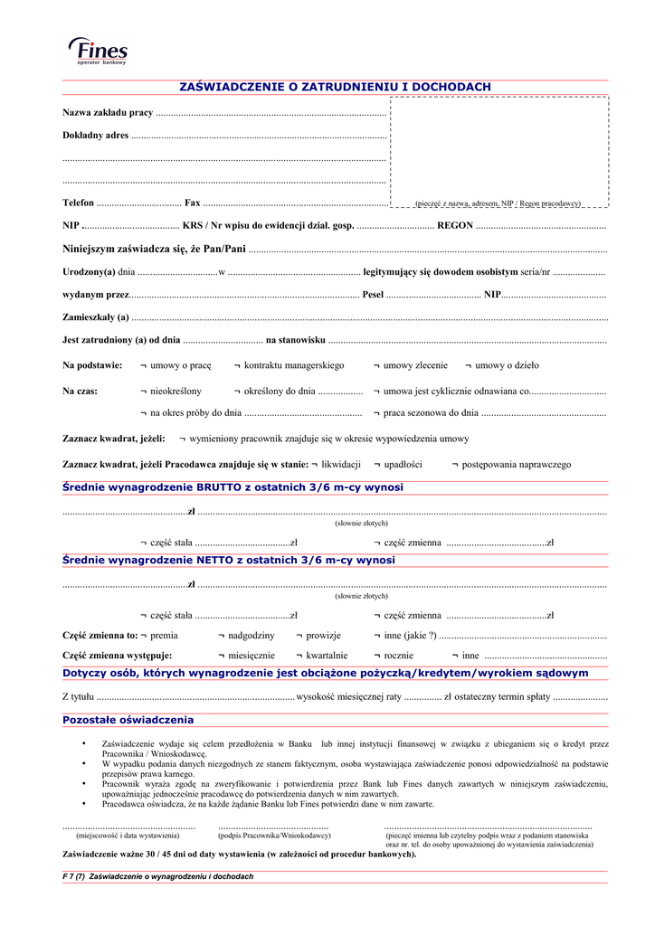 ZAŚWIADCZENIE O ZATRUDNIENIU I DOCHODACH Nazwa zakładu pracy ............................................................................................ Dokładny adres ...................................................................................................... ................................................................................................................................. ................................................................................................................................. Telefon .................................. Fax .......................................................................... (pieczęć z nazwą, adresem, NIP / Regon pracodawcy) NIP ....................................... KRS / Nr wpisu do ewidencji dział. gosp. ............................... REGON .................................................... Niniejszym zaświadcza się, że Pan/Pani ............................................................................................................................................... Urodzony(a) dnia ................................w ..................................................... legitymujący się dowodem osobistym seria/nr ..................... wydanym przez............................................................................................ Pesel ...................................... NIP.......................................... Zamieszkały (a) .............................................................................................................................................................................................. Jest zatrudniony (a) od dnia ................................ na stanowisku ............................................................................................................... Na podstawie: umowy o pracę kontraktu managerskiego umowy zlecenie Na czas: nieokreślony określony do dnia .................. umowa jest cyklicznie odnawiana co............................... na okres próby do dnia ............................................... praca sezonowa do dnia .................................................. Zaznacz kwadrat, jeżeli: umowy o dzieło wymieniony pracownik znajduje się w okresie wypowiedzenia umowy Zaznacz kwadrat, jeżeli Pracodawca znajduje się w stanie: likwidacji upadłości postępowania naprawczego Średnie wynagrodzenie BRUTTO z ostatnich 3/6 m-cy wynosi ..................................................zł ................................................................................................................................................................... (słownie złotych) część stała ......................................zł część zmienna ........................................zł Średnie wynagrodzenie NETTO z ostatnich 3/6 m-cy wynosi ..................................................zł ................................................................................................................................................................... (słownie złotych) część stała ......................................zł część zmienna ........................................zł Część zmienna to: premia nadgodziny prowizje inne (jakie ?) ................................................................... Część zmienna występuje: miesięcznie kwartalnie rocznie inne ................................................. Dotyczy osób, których wynagrodzenie jest obciążone pożyczką/kredytem/wyrokiem sądowym Z tytułu ............................................................................... wysokość miesięcznej raty ............... zł ostateczny termin spłaty ...................... Pozostałe oświadczenia • • • • Zaświadczenie wydaje się celem przedłożenia w Banku lub innej instytucji finansowej w związku z ubieganiem się o kredyt przez Pracownika / Wnioskodawcę. W wypadku podania danych niezgodnych ze stanem faktycznym, osoba wystawiająca zaświadczenie ponosi odpowiedzialność na podstawie przepisów prawa karnego. Pracownik wyraża zgodę na zweryfikowanie i potwierdzenia przez Bank lub Fines danych zawartych w niniejszym zaświadczeniu, upoważniając jednocześnie pracodawcę do potwierdzenia danych w nim zawartych. Pracodawca oświadcza, że na każde żądanie Banku lub Fines potwierdzi dane w nim zawarte. ..................................................... ............................................ ................................................................................... (miejscowość i data wystawienia) (podpis Pracownika/Wnioskodawcy) (pieczęć imienna lub czytelny podpis wraz z podaniem stanowiska oraz nr. tel. do osoby upoważnionej do wystawienia zaświadczenia) Zaświadczenie ważne 30 / 45 dni od daty wystawienia (w zależności od procedur bankowych). F 7 (7) Zaświadczenie o wynagrodzeniu i dochodach