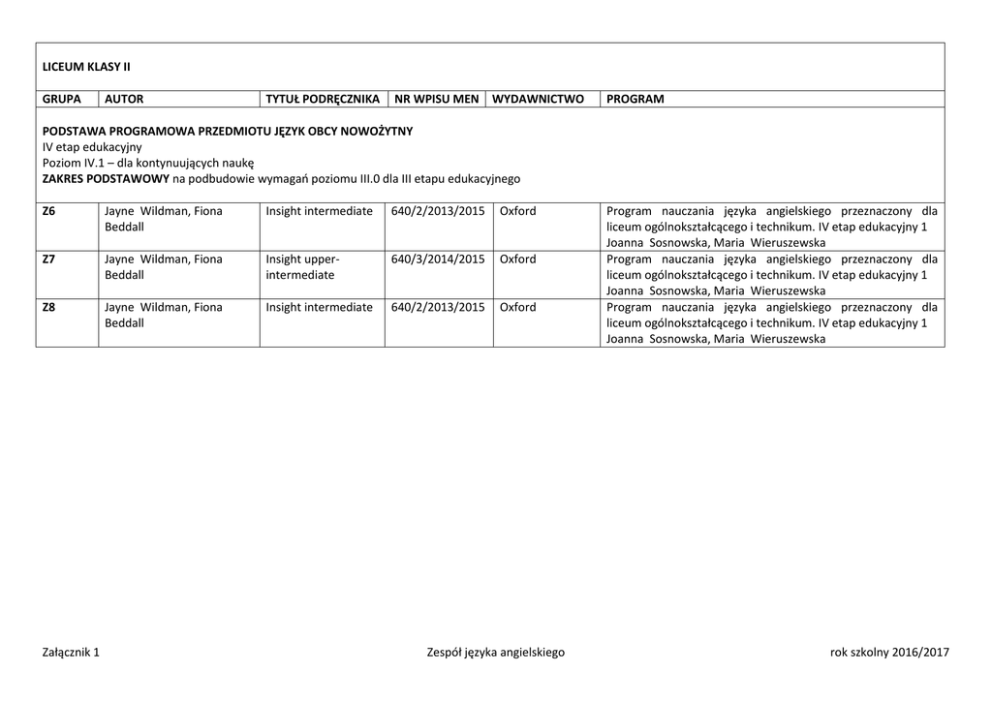 LICEUM KLASY II GRUPA AUTOR TYTUŁ PODRĘCZNIKA NR WPISU MEN WYDAWNICTWO PROGRAM PODSTAWA PROGRAMOWA PRZEDMIOTU JĘZYK OBCY NOWOŻYTNY IV etap edukacyjny Poziom IV.1 – dla kontynuujących naukę ZAKRES PODSTAWOWY na podbudowie wymagao poziomu III.0 dla III etapu edukacyjnego Z6 Jayne Wildman, Fiona Beddall Insight intermediate 640/2/2013/2015 Oxford Z7 Jayne Wildman, Fiona Beddall Insight upperintermediate 640/3/2014/2015 Oxford Z8 Jayne Wildman, Fiona Beddall Insight intermediate 640/2/2013/2015 Oxford Załącznik 1 Zespół języka angielskiego Program nauczania języka angielskiego przeznaczony dla liceum ogólnokształcącego i technikum. IV etap edukacyjny 1 Joanna Sosnowska, Maria Wieruszewska Program nauczania języka angielskiego przeznaczony dla liceum ogólnokształcącego i technikum. IV etap edukacyjny 1 Joanna Sosnowska, Maria Wieruszewska Program nauczania języka angielskiego przeznaczony dla liceum ogólnokształcącego i technikum. IV etap edukacyjny 1 Joanna Sosnowska, Maria Wieruszewska rok szkolny 2016/2017 PODSTAWA PROGRAMOWA PRZEDMIOTUJĘZYK OBCY NOWOŻYTNY IV etap edukacyjny Poziom IV.1 – dla kontynuujących naukę ZAKRES ROZSZERZONY na podbudowie wymagao poziomu III.1 dla III etapu edukacyjnego Z1 Jayne Wildman, Fiona Beddall Insight Intermediate 640/2/2013/2015 Oxford Z2 Jayne Wildman, Fiona Beddall Insight upperintermediate 640/3/2014/2015 Oxford Z3 Jayne Wildman, Fiona Beddall Insight Preintermediate 640/1/2013/2015 Oxford Z4 Jayne Wildman, Fiona Beddall Insight Intermediate 640/2/2013/2015 Oxford Z5 Jayne Wildman, Fiona Beddall Insight Intermediate 640/2/2013/2015 Oxford Załącznik 1 Zespół języka angielskiego Program nauczania języka angielskiego przeznaczony dla liceum ogólnokształcącego i technikum. IV etap edukacyjny 1 Joanna Sosnowska, Maria Wieruszewska Program nauczania języka angielskiego przeznaczony dla liceum ogólnokształcącego i technikum. IV etap edukacyjny 1 Joanna Sosnowska, Maria Wieruszewska Program nauczania języka angielskiego przeznaczony dla liceum ogólnokształcącego i technikum. IV etap edukacyjny 1 J. Sosnowska, M. Wieruszewska Program nauczania języka angielskiego przeznaczony dla liceum ogólnokształcącego i technikum. IV etap edukacyjny 1 Joanna Sosnowska, Maria Wieruszewska Program nauczania języka angielskiego przeznaczony dla liceum ogólnokształcącego i technikum. IV etap edukacyjny 1 Joanna Sosnowska, Maria Wieruszewska rok szkolny 2016/2017 PODSTAWA PROGRAMOWA PRZEDMIOTU JĘZYK OBCY NOWOŻYTNY IV etap edukacyjny Poziom IV.1 – dla kontynuujących naukę ZAKRES PODSTAWOWY na podbudowie wymagao poziomu III.0 dla III etapu edukacyjnego Język angielski jako język drugi Z11 Jayne Wildman, Fiona Beddall Insight upperintermediate 640/3/2014/2015 Oxford Z12 Jayne Wildman, Fiona Beddall Insight Intermediate 640/2/2013/2015 Oxford Załącznik 1 Zespół języka angielskiego Program nauczania języka angielskiego przeznaczony dla liceum ogólnokształcącego i technikum. IV etap edukacyjny 1 Joanna Sosnowska, Maria Wieruszewska Program nauczania języka angielskiego przeznaczony dla liceum ogólnokształcącego i technikum. IV etap edukacyjny 1 Joanna Sosnowska, Maria Wieruszewska rok szkolny 2016/2017 LICEUM KLASY III GRUPA AUTOR TYTUŁ PODRĘCZNIKA NR WPISU MEN WYDAWNICTWO PROGRAM PODSTAWA PROGRAMOWA PRZEDMIOTU JĘZYK OBCY NOWOŻYTNY IV etap edukacyjny Poziom IV.1 – dla kontynuujących naukę ZAKRES PODSTAWOWY na podbudowie wymagao poziomu III.0 dla III etapu edukacyjnego X6 Marta Inglot, Izabela Michalak, Anna Milewska Repetytorium: Destination 2015. Poziom podstawowy 681/2014 Nowa Era Program nauczania języka angielskiego. Kurs kontynuacyjny dla klas 1-3 liceum. Poziom IV.1 na podbudowie III etapu edukacyjnego Halina Tybida X7 Marta Rosioska, Lynda Edwards Matura 2015. Repetytorium do matury – poziom podstawowy I rozszerzony 710/2014 Macmillan Program nauczania języka angielskiego. Kurs kontynuacyjny dla klas 1-3 liceum. Poziom IV.1 na podbudowie III etapu edukacyjnego. Milada Krajewska X8 Marta Rosioska, Lynda Edwards Matura 2015. Repetytorium - – poziom podstawowy I rozszerzony 710/2014 Macmillan Program nauczania języka angielskiego. Kurs kontynuacyjny dla klas 1-3 liceum. Poziom IV.1 na podbudowie III etapu edukacyjnego. Milada Krajewska X9 Marta Rosioska, Lynda Edwards Matura 2015. Repetytorium- – poziom podstawowy I rozszerzony 710/2014 Macmillan Program nauczania języka angielskiego. Kurs kontynuacyjny dla klas 1-3 liceum. Poziom IV.1 na podbudowie III etapu edukacyjnego. Milada Krajewska X 10 David Spencer Repetytorium dla uczniów liceów i techników. Poziom rozszerzony. 775/2016 Macmillan Program nauczania języka angielskiego. Kurs kontynuacyjny dla klas 1-3 liceum. Poziom IV.1 na podbudowie III etapu edukacyjnego. Milada Krajewska Załącznik 1 Zespół języka angielskiego rok szkolny 2016/2017 PODSTAWA PROGRAMOWA PRZEDMIOTU JĘZYK OBCY NOWOŻYTNY IV etap edukacyjny Poziom IV.1 – dla kontynuujących naukę ZAKRES ROZSZERZONY na podbudowie wymagao poziomu III.1 dla III etapu edukacyjnego X1 Stuart McKinlay, Bob Hastings, Monika Galbarczyk New Matura Success advanced 127/6/2009 Pearson Program nauczania języka angielskiego. Maria Kłos, Anna Sikorzyoska Marta Umioska, Rob Hastings Repetytorium maturalne – poziom rozszerzony Repetytorium: Destination 2015. Poziom podstawowy i rozszerzony 723/2014 681/2014 Nowa Era Program nauczania języka angielskiego. Kurs kontynuacyjny dla klas 1-3 liceum. Poziom IV.1 na podbudowie III etapu edukacyjnego Halina Tybida X2 Marta Inglot, Izabela Michalak, Anna Milewska X3 Marta Inglot, Izabela Michalak, Anna Milewska Repetytorium: Destination 2015. Poziom podstawowy i rozszerzony 681/2014 Nowa Era Program nauczania języka angielskiego. Kurs kontynuacyjny dla klas 1-3 liceum. Poziom IV.1 na podbudowie III etapu edukacyjnego Halina Tybida X4 Marta Inglot, Izabela Michalak, Anna Milewska Repetytorium: Destination 2015. Poziom podstawowy i rozszerzo