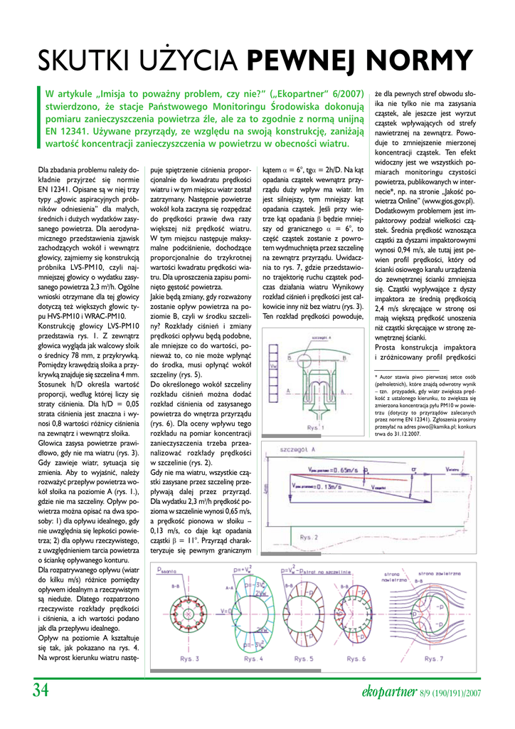 SKUTKI UŻYCIA PEWNEJ NORMY W artykule „Imisja to poważny problem, czy nie?” („Ekopartner” 6/2007) stwierdzono, że stacje Państwowego Monitoringu Środowiska dokonują pomiaru zanieczyszczenia powietrza źle, ale za to zgodnie z normą unijną EN 12341. Używane przyrządy, ze względu na swoją konstrukcję, zaniżają wartość koncentracji zanieczyszczenia w powietrzu w obecności wiatru. Dla zbadania problemu należy dokładnie przyjrzeć się normie EN 12341. Opisane są w niej trzy typy „głowic aspiracyjnych próbników odniesienia” dla małych, średnich i dużych wydatków zasysanego powietrza. Dla aerodynamicznego przedstawienia zjawisk zachodzących wokół i wewnątrz głowicy, zajmiemy się konstrukcją próbnika LVS-PM10, czyli najmniejszej głowicy o wydatku zasysanego powietrza 2,3 m3/h. Ogólne wnioski otrzymane dla tej głowicy dotyczą też większych głowic typu HVS-PM10 i WRAC-PM10. Konstrukcję głowicy LVS-PM10 przedstawia rys. 1. Z zewnątrz głowica wygląda jak walcowy słoik o średnicy 78 mm, z przykrywką. Pomiędzy krawędzią słoika a przykrywką znajduje się szczelina 4 mm. Stosunek h/D określa wartość proporcji, według której liczy się straty ciśnienia. Dla h/D = 0,05 strata ciśnienia jest znaczna i wynosi 0,8 wartości różnicy ciśnienia na zewnątrz i wewnątrz słoika. Głowica zasysa powietrze prawidłowo, gdy nie ma wiatru (rys. 3). Gdy zawieje wiatr, sytuacja się zmienia. Aby to wyjaśnić, należy rozważyć przepływ powietrza wokół słoika na poziomie A (rys. 1.), gdzie nie ma szczeliny. Opływ powietrza można opisać na dwa sposoby: 1) dla opływu idealnego, gdy nie uwzględnia się lepkości powietrza; 2) dla opływu rzeczywistego, z uwzględnieniem tarcia powietrza o ściankę opływanego konturu. Dla rozpatrywanego opływu (wiatr do kilku m/s) różnice pomiędzy opływem idealnym a rzeczywistym są nieduże. Dlatego rozpatrzono rzeczywiste rozkłady prędkości i ciśnienia, a ich wartości podano jak dla przepływu idealnego. Opływ na poziomie A kształtuje się tak, jak pokazano na rys. 4. Na wprost kierunku wiatru nastę- !" puje spiętrzenie ciśnienia proporcjonalnie do kwadratu prędkości wiatru i w tym miejscu wiatr został zatrzymany. Następnie powietrze wokół koła zaczyna się rozpędzać do prędkości prawie dwa razy większej niż prędkość wiatru. W tym miejscu następuje maksymalne podciśnienie, dochodzące proporcjonalnie do trzykrotnej wartości kwadratu prędkości wiatru. Dla uproszczenia zapisu pominięto gęstość powietrza. Jakie będą zmiany, gdy rozważony zostanie opływ powietrza na poziomie B, czyli w środku szczeliny? Rozkłady ciśnień i zmiany prędkości opływu będą podobne, ale mniejsze co do wartości, ponieważ to, co nie może wpłynąć do środka, musi opłynąć wokół szczeliny (rys. 5). Do określonego wokół szczeliny rozkładu ciśnień można dodać rozkład ciśnienia od zasysanego powietrza do wnętrza przyrządu (rys. 6). Dla oceny wpływu tego rozkładu na pomiar koncentracji zanieczyszczenia trzeba przeanalizować rozkłady prędkości w szczelinie (rys. 2). Gdy nie ma wiatru, wszystkie cząstki zasysane przez szczelinę przepływają dalej przez przyrząd. Dla wydatku 2,3 m3/h prędkość pozioma w szczelinie wynosi 0,65 m/s, a prędkość pionowa w słoiku – 0,13 m/s, co daje kąt opadania cząstki β = 11°. Przyrząd charakteryzuje się pewnym granicznym kątem α = 6°, tgα = 2h/D. Na kąt opadania cząstek wewnątrz przyrządu duży wpływ ma wiatr. Im jest silniejszy, tym mniejszy kąt opadania cząstek. Jeśli przy wietrze kąt opadania β będzie mniejszy od granicznego α = 6°, to część cząstek zostanie z powrotem wydmuchnięta przez szczelinę na zewnątrz przyrządu. Uwidacznia to rys. 7, gdzie przedstawiono trajektorię ruchu cząstek podczas działania wiatru Wynikowy rozkład ciśnień i prędkości jest całkowicie inny niż bez wiatru (rys. 3). Ten rozkład prędkości powoduje, że dla pewnych stref obwodu słoika nie tylko nie ma zasysania cząstek, ale jeszcze jest wyrzut cząstek wpływających od strefy nawietrznej na zewnątrz. Powoduje to zmniejszenie mierzonej koncentracji cząstek. Ten efekt widoczny jest we wszystkich pomiarach monitoringu czystości powietrza, publikowanych w internecie*, np. na stronie „Jakość powietrza Online” (www.gios.gov.pl). Dodatkowym problemem jest impaktorowy podział wielkości cząstek. Średnia prędkość wznosząca cząstki za dyszami impaktorowymi wynosi 0,94 m/s, ale tutaj jest pewien profil prędkości, który od ścianki osiowego kanału urządzenia do zewnętrznej ścianki zmniejsza się. Cząstki wypływające z dyszy impaktora ze średnią prędkością 2,4 m/s skręcające w stronę osi mają większą prędkość unoszenia niż cząstki skręcające w stronę zewnętrznej ścianki. Prosta konstrukcja impaktora i zróżnicowany profil prędkości * Autor stawia piwo pierwszej setce osób (pełnoletnich), które znajdą odwrotny wynik – tzn. przypadek, gdy wiatr zwiększa prędkość z ustalonego kierunku, to zwiększa się zmierzona koncentracja pyłu PM10 w powietrzu (dotyczy to przyrządów zalecanych przez normę EN 12341). Zgłoszenia prosimy przesyłać na adres [email protected]; konkurs trwa do 31.12.2007. ekopartner 8/9 (190/191)/2007 powodują różną separację cząstek tego samego materiału. A co z cząstkami o zróżnicowanym ciężarze właściwym? Według normy EN12341 impaktory w głowicy LVS-PM10 zostały zaprojektowane dla separacji cząstek o średnicy aerodynamicznej mniejszej niż 10 mikrometrów. Średnica aerodynamiczna jest wielkością umowną, odnoszącą się tylko do cząstek o wymiarach równoważnych dla ciężaru właściwego wtedy, gdy γ = 1 g/cm3. Separacja przy pomocy impaktora polega na działaniu siły odśrodkowej, która powoduje, że cząstki o pewnej masie i oporze aerodynamicznym mogą się znaleźć w pewnym obszarze (otw