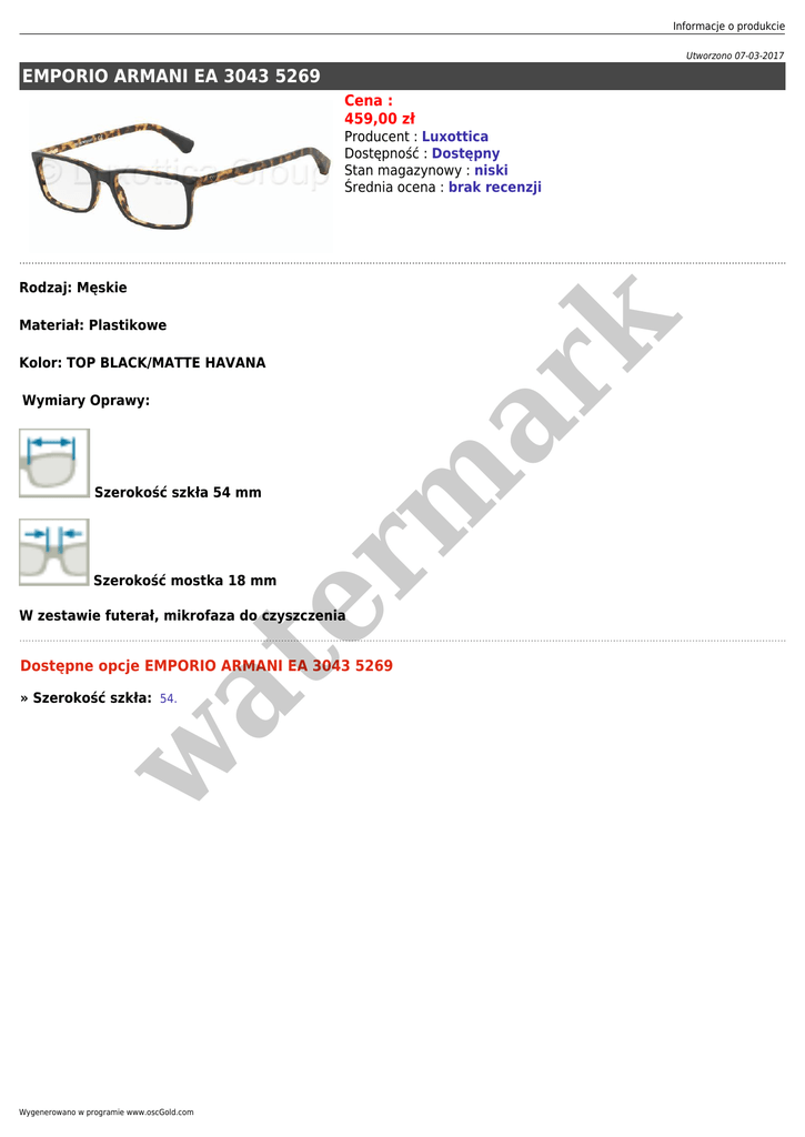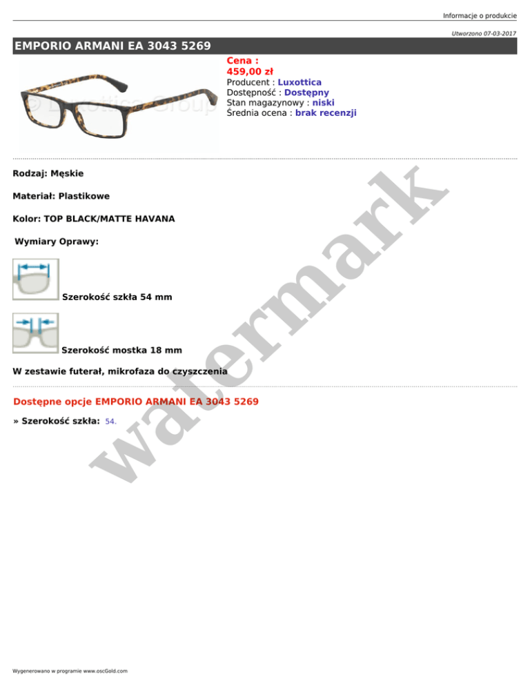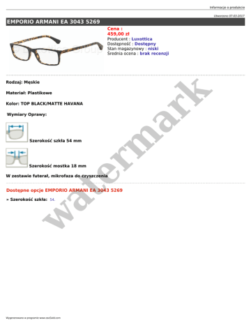 Informacje o produkcie Utworzono 07-03-2017 EMPORIO ARMANI EA 3043 5269 Cena : 459,00 zł Producent : Luxottica Dostępność : Dostępny Stan magazynowy : niski Średnia ocena : brak recenzji Materiał: Plastikowe er m ar k Rodzaj: Męskie Kolor: TOP BLACK/MATTE HAVANA Wymiary Oprawy: Szerokość szkła 54 mm Szerokość mostka 18 mm at W zestawie futerał, mikrofaza do czyszczenia Dostępne opcje EMPORIO ARMANI EA 3043 5269 w » Szerokość szkła: 54. Wygenerowano w programie www.oscGold.com