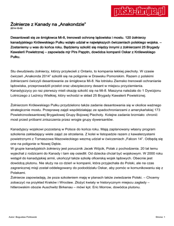 Żołnierze z Kanady na „Anakondzie” 2014-10-02 Desantowali się ze śmigłowca Mi-8, trenowali ochronę lądowiska i mostu. 120 żołnierzy kanadyjskiego Królewskiego Pułku wzięło udział w największych ćwiczeniach polskiego wojska. – Zostaniemy u was do końca roku. Będziemy szkolić się między innymi z żołnierzami 25 Brygady Kawalerii Powietrznej – zapowiada mjr Pirs Papptn, dowódca kompanii Oskar z Królewskiego Pułku. Stu dwudziestu żołnierzy, którzy przylecieli z Ontario, to kompania lekkiej piechoty. W czasie ćwiczeń „Anakonda 2014” szkolili się na poligonie w Drawsku Pomorskim. Razem z polskimi żołnierzami ćwiczyli desantowanie ze śmigłowca Mi-8. Na lotnisku Ziemsko trenowali ochranianie lądowiska, przeprowadzili przelot oraz ubezpieczony desant w miejscu przyziemienia. Kanadyjczycy po raz pierwszy mieli okazję szkolić się na Mi-8. Maszyna należała do 1 Dywizjonu Lotniczego z Leźnicy Wielkiej, który wchodzi w skład 25 Brygady Kawalerii Powietrznej. Żołnierzom Królewskiego Pułku przydzielono także zadanie desantowania się w okolice ważnego strategicznie mostu. Przeprawę zajęli współdziałając ze spadochroniarzami z amerykańskiej 173 Powietrznodesantowej Brygadowej Grupy Bojowej Piechoty. Kolejne zadanie brzmiało: chronić most przed próbami zniszczenia przez wrogie grupy dywersantów. Kanadyjscy wojskowi pozostaną w Polsce do końca roku. Mają zaplanowany własny program szkolenia zakładający wiele zajęć ze strzelania. Z kolei w listopadzie razem z kawalerzystami powietrznymi z Tomaszowa Mazowieckiego wezmą udział w ćwiczeniach „Falcon 14”. Odbędą się one na poligonie w Nowej Dębie. W grupie kanadyjskich żołnierzy jest porucznik Jacek Wójcik, Polak z pochodzenia. 20 lat temu wyjechał z rodzicami do Kanady i tam się osiedlił. Od dziecka chciał być wojskowym. W 2000 roku wstąpił do kanadyjskiej armii, ukończył także szkołę oficerską wojsk lądowych. Obecnie jest dowódcą plutonu. Nie służy na co dzień w kompanii, która przyjechała do Polski, ale na czas zagranicznej misji został oddelegowany do pododdziału Oskar, aby pomóc w komunikowaniu się z Polakami. Żołnierze zapowiadają, że poza szkoleniem mają w planach także zwiedzanie Polski. – Chcemy zobaczyć na przykład Kraków i Wrocław. Złożyć kwiaty w historycznym miejscu zagłady – hitlerowskim obozie Auschwitz Birkenau – mówi kpt. Eric Morrow, dowódca plutonu. Autor: Bogusław Politowski Strona: 1