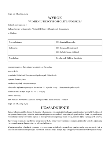 Sygn. akt III AUa 542/14 WYROK W IMIENIU RZECZYPOSPOLITEJ POLSKIEJ Dnia 16 czerwca 2015 r. Sąd Apelacyjny w Szczecinie - Wydział III Pracy i Ubezpieczeń Społecznych w składzie: Przewodniczący: SSA Jolanta Hawryszko Sędziowie: SSA Romana Mrotek (spr.) SSA Zofia Rybicka - Szkibiel Protokolant: St. sekr. sąd. Elżbieta Kamińska po rozpoznaniu w dniu 16 czerwca 2015 r. w Szczecinie sprawy R. S. przeciwko Zakładowi Ubezpieczeń Społecznych Oddział w S. o prawo do emerytury na skutek apelacji ubezpieczonego od wyroku Sądu Okręgowego w Szczecinie VII Wydział Pracy i Ubezpieczeń Społecznych z dnia 21 maja 2014 r. sygn. akt VII U 1819/13 oddala apelację. SSA Romana Mrotek SSA Jolanta Hawryszko SSA Zofia Rybicka - Szkibiel Sygn. akt III AUa 542/14 UZASADNIENIE Zakład Ubezpieczeń Społecznych Oddział w S. decyzją z 6 sierpnia 2013 roku, po rozpatrzeniu wniosku R. S., odmówił mu prawa do emerytury z tytułu wykonywania pracy w warunkach szczególnych, ponieważ na dzień 1 stycznia 1999 roku ubezpieczony udowodnił 24 lata 11 miesięcy i 1 dzień ogólnego stażu pracy, zamiast 25 lat wymaganych ustawą. Z powyższą decyzją nie zgodził się ubezpieczony R. S., który w odwołaniu z 29 sierpnia 2013 roku wniósł o jej zmianę i przyznanie prawa do emerytury w wieku obniżonym. W odpowiedzi na odwołanie pozwany organ rentowy wniósł o jego oddalenie, podtrzymując argumentację, jak w uzasadnieniu zaskarżonej decyzji. Wyrokiem z dnia 21maja 2014 r. Sąd Okręgowy w Szczecinie VII Wydział Pracy i Ubezpieczeń Społecznych oddalił odwołanie oraz przyznaje radcy prawnemu M. P. od Skarbu Państwa kwotę 60 zł powiększoną o stawkę podatku VAT, tytułem nieopłaconej pomocy prawnej pełnomocnika z urzędu Sąd ten ustalił, że R. S. urodził się (...). Wniosek o emeryturę z tytułu wykonywania pracy w warunkach szczególnych ubezpieczony złożył 15 lipca 2013 roku. Nie jest on członkiem otwartego funduszu emerytalnego. Przed organem rentowym ubezpieczony udowodnił 21 lat 5 miesięcy i 28 dni okresów pracy w warunkach szczególnych. Natomiast na dzień 1 stycznia 1999 roku R. S. udokumentował w postępowaniu administracyjnym okres składkowy i nieskładkowy w łącznym wymiarze 24 lat 11 miesięcy i 1 dnia. W okresie od 13 listopada 1972 roku do 12 marca 1973 roku R. S. odbywał w Lidze (...) kurs kierowców zawodowych na prawo jazdy kategorii B, na który został skierowany przez Wojskową Komendę Uzupełnień w S.. Z dniem 1 marca 1973 roku ubezpieczony podjął pracę w (...) S.A. w S.. Zasadniczą służbę wojskową ubezpieczony pełnił w okresie od 26 lipca 1973 roku do 14 lipca 1975 roku. Na podstawie tak dokonanych ustaleń faktycznych, Sąd Okręgowy zważył, że w przedmiotowej sprawie poza sporem pozostaje fakt, iż R. S. urodzony (...), nie osiągnął wymaganego przepisem art. 24 ustawy z dnia 17 grudnia 1998 r. o emeryturach i rentach z Funduszu Ubezpieczeń Społecznych (Dz. U. z 2009 r. Nr 153, poz. 1227 ze zm.) tzw. powszechnego wieku emerytalnego. Jednocześnie Sąd Okręgowy wyjaśnił, że w wyżej wskazanej ustawie zróżnicowane zostały warunki przechodzenia na emeryturę według kryterium urodzenia: dla ubezpieczonych urodzonych po dniu 31 grudnia 1948 roku oraz dla ubezpieczonych urodzonych przed dniem 1 stycznia 1949 roku oraz dla niektórych ubezpieczonych urodzonych po dniu 31 grudnia 1948 roku, a przed dniem 1 stycznia 1969 roku. Z kolei przepis art. 184 ustawy stanowi, że ubezpieczonemu urodzonemu po dniu 31 grudnia 1948 roku przysługuje emerytura po osiągnięciu wieku przewidzianego w art. 32, 33, 39 i 40, jeżeli w dniu wejścia w życie ustawy osiągnął: 1. okres zatrudnienia w szczególnych warunkach lub w szczególnym charakterze wymaganym w przepisach dotychczasowych do nabycia prawa do emerytury w wieku niższym niż 60 lat – dla kobiet i 65 lat – dla mężczyzn oraz 2. okres składkowy i nieskładkowy, o którym mowa w art. 27, tj. 25 lat dla mężczyzn. Emerytura ta przysługuje pod warunkiem nieprzystąpienia do otwartego funduszu emerytalnego albo złożenia wniosku o przekazanie zgromadzonych środków na dochody budżetu państwa oraz rozwiązanie stosunku pracy – w przypadku ubezpieczonego będącego pracownikiem. W tej sytuacji za istotny Sąd Okręgowy uznał przepis art. 32 ustawy emerytalno-rentowej, który stanowi, że ubezpieczonym urodzonym przed dniem 1 stycznia 1949 roku, będącym pracownikami, zatrudnionymi w szczególnych warunkach lub w szczególnym charakterze, przysługuje emerytura w wieku niższym niż określony w art. 27 pkt 1. Natomiast za pracowników zatrudnionych w szczególnych warunkach uważa się pracowników zatrudnionych przy pracach o znacznej szkodliwości dla zdrowia oraz o znacznym stopniu uciążliwości lub wymagających wysokiej sprawności psychofizycznej ze względu na bezpieczeństwo własne lub otoczenia. Kwestię uzyskiwania prawa do przedmiotowego świadczenia szczegółowo reguluje rozporządzenia Rady Ministrów z dnia 7 lutego 1983 r. w sprawie wieku emerytalnego pracowników zatrudnionych w szczególnych warunkach lub w szczególnym charakterze (Dz. U. Nr 8, poz. 43 ze zm.). Sąd I instancji wywiódł, że w aktualnym stanie prawnym organy rentowe obowiązane są do uwzględniania przy ocenie prawa do przedmiotowego świadczenia wszelkich okresów wykonywania prac w szczególnych warunkach określonych w § 4-8a rozporządzenia. Pracownik, który wykonywał prace w szczególnych warunkach, wymienione w wykazie A, nabywa prawo do emerytury, jeżeli spełnia łącznie następujące warunki: 1) osiągnął wiek emerytalny wynoszący: 55 lat dla kobiet i 60 lat dla mężczyzn, 2) ma wymagany okres zatrudnienia, w tym co najmniej 15 lat pracy w szczególnych warunkach. Z powyższego jednoznacznie wynika, że dla nabycia przez mężczyznę prawa do emerytury w wieku obniżonym na podstawie art. 184 w zw. z art. 32 ustawy emerytalno-rentowej wymagane jest łączne sp