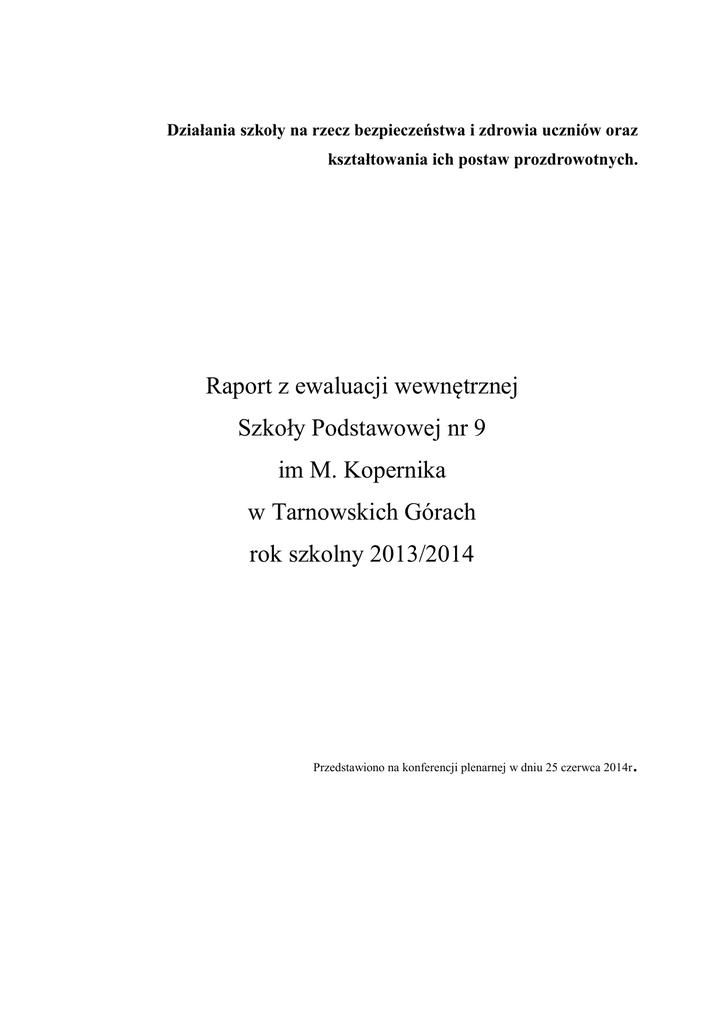 Działania szkoły na rzecz bezpieczeństwa i zdrowia uczniów oraz kształtowania ich postaw prozdrowotnych. Raport z ewaluacji wewnętrznej Szkoły Podstawowej nr 9 im M. Kopernika w Tarnowskich Górach rok szkolny 2013/2014 Przedstawiono na konferencji plenarnej w dniu 25 czerwca 2014r . PRZEDMIOT EWALUACJI: Działania szkoły na rzecz bezpieczeństwa. METODY I NARZĘDZIA WYKORZYSTANE W EWALUACJI: 1. Analiza i modyfikacja dokumentów szkolnych regulaminów wycieczek szkolnych, wyjść i wyjazdów na basen. 2. Zorganizowanie szkolenia Rady Pedagogicznej na temat: „Bezpieczeństwo dzieci i młodzieży podczas wypoczynku i wycieczek szkolnych.” 3. Ankietowanie – kwestionariusz ankiety dla ucznia, nauczyciela i rodzica 4. Obserwacja zajęć pod kątem zapewnienia bezpieczeństwa oraz upowszechniania edukacji zdrowotnej. 5. Kontrola asortymentu artykułów spożywczych sprzedawanych w sklepiku szkolnym. 6. Apele i konkursy poświęcone zagadnieniom prozdrowotnym, wizualizacja tematu na gazetkach szkolnych, upowszechnianie wiedzy na temat zdrowego odżywiania podczas godzin z wychowawcą. PYTANIA KLUCZOWE: 1. Jakie działania podejmuje szkoła w celu zapewnienia bezpieczeństwa uczniów? 2. W jaki sposób szkoła kształtuje postawy prozdrowotne uczniów? 3. Jaka jest skuteczność tych działań? 4. Jakie inne działania może podjąć szkoła celem zwiększenia bezpieczeństwa uczniów oraz wpływu na kształtowanie prawidłowych nawyków prozdrowotnych? INFORMACJE DOTYCZĄCE EWALUACJI WEWNĘTRZNEJ: 1. Źródłem informacji o jakości pracy w obszarach objętych ewaluacją byli uczniowie klas I –VI, ich rodzice oraz nauczyciele - wychowawcy zatrudnieni w szkole 2. Metody i narzędzia badawcze wykorzystywane podczas ewaluacji to: ankiety dla ucznia, rodzica i nauczyciela, analiza regulaminów wycieczek szkolnych, wyjść i wyjazdów na basen, a także hospitacje zajęć lekcyjnych. Działania szkoły Ewaluacja wewnętrzna w szkole polegała na zaplanowanym zbieraniu oraz analizie informacji o warunkach, przebiegu i skuteczności podejmowanych działań. Po przeprowadzonym szkoleniu Rady Pedagogicznej na temat „Bezpieczeństwo dzieci i młodzieży podczas wypoczynku i wycieczek szkolnych.” w niektórych szkolnych dokumentach dokonano zmian, które dotyczyły przede wszystkim ilości opiekunów, liczebności grup uczniowskich oraz kwalifikacji wycieczek. Przez cały rok szkolny kontrolowano asortyment artykułów spożywczych oferowanych w sklepiku szkolnym., ustalono wraz z rodzicami listę zdrowych artykułów spożywczych, oraz wycofano ze sprzedaży batoniki, gumy do żucia oraz artykuły z dużą zawartością cukru. W trakcie roku szkolnego hospitowano zajęcia z wychowania fizycznego pod kątem bezpieczeństwa uczniów. W większości lekcje były przygotowane i przeprowadzone z zachowaniem zasad bezpieczeństwa. Dotyczyło to zarówno organizacji lekcji, doboru ćwiczeń, sprzętu i pomocy dydaktycznych, jak też dbałości o dyscyplinę i bezpieczeństwo uczniów podczas zajęć. W drugim semestrze obserwowano zajęcia, podczas których realizowane były treści z zakresu edukacji zdrowotnej, lekcję przyrody oraz zajęcia świetlicowe. Nauczyciele uświadomili uczniom, że postępowanie według zasad zdrowego stylu życia ma duży wpływ na zdrowie. W listopadzie 2013 r. przeprowadzono ankiety wśród 116 losowo wybranych rodziców w kwietniu 2014 r. przebadano 340 uczniów z klas wychowawców. Celem badania było pozyskanie I -VI oraz 18 nauczycieli – informacji na temat poczucia bezpieczeństwa uczniów oraz stopnia zapewnienia bezpieczeństwa dzieciom przez szkołę w ocenie nauczycieli i rodziców. Wnioski z ankiety dla ucznia Biorąc pod uwagę dwie kategorie odpowiedzi, w których uczniowie określili swoje poczucie bezpieczeństwa w szkole a mianowicie kategorie „tak” i „średnio” uzyskany odsetek świadczy o dość wysokim poczuciu bezpieczeństwa, łącznie wynosi on 86 %. Zdecydowanie najbezpieczniej nasi uczniowie czują się w klasach (95 %) podczas wyjść, wyjazdów i wycieczek (92 %) oraz w gabinecie higienistki szkolnej (87 %). Poczucie bezpieczeństwa uczniów na korytarzu podczas przerw w obecności nauczyciela dyżurującego wynosi 85 % i jest prawie takie samo jak podczas lekcji wychowania fizycznego i pobytu dziecka w świetlicy (84 % w obu przypadkach). Najmniej bezpiecznie czują się uczniowie w stołówce szkolnej tylko 66 %. Wnioski z ankiety dla rodzica W odczuciu rodziców ich pociechy są bardziej bezpieczne podczas wycieczek i wyjazdów (aż w 92 % ) niż podczas przerwy międzylekcyjnej czy lekcji wychowania fizycznego podczas, których bezpieczeństwo dzieci oceniono na 86 %. Pytanie 4 dotyczyło możliwości poszerzenia działalności szkoły w zakresie zwiększenia bezpieczeństwa uczniów, w pytaniu 5 rodzice mogli wskazać propozycje takich działań. Na 116 ankietowanych rodziców 36 udzieliło odpowiedzi, zawierały one 29 różnych propozycji z czego 5 miała na względzie bezpieczeństwo dzieci. Sugestie rodziców były następujące: zwiększyć kontrole nad dziećmi podczas przerw i w świetlicy, zorganizować spotkania z psychologiem, zajęcia ruchowe w czasie przerw oraz ograniczyć kontakty dzieci z klas pierwszych z dziećmi ze starszych klas. Wnioski z ankiety dla nauczyciela Większość nauczycieli 89% dobrze ocenia pełnienie dyżurów na korytarzach szkolnych, 11 procent przyznaje, że dyżury nauczycielskie średnio zapewniają bezpieczeństwo uczniom. W porównaniu z podobnymi pytaniami kierowanymi do uczniów i rodziców widać duże rozbieżności. Uczniowie czują się bezpiecznie podczas przerwy spędzanej obok dyżurującego nauczyciela ocenili na 50%, zaś rodzice uczniów na 64%. Różnica w ocenie dobrych czyli bezpiecznych dyżurów wynosi w pierwszym przypadku (nauczyciel – uczeń) 39%, drugim (nauczyciel – rodzic) 25% PRZEDMIOT EWALUACJI: Działania wychowawcze szkoły w zakresie troski o zdro