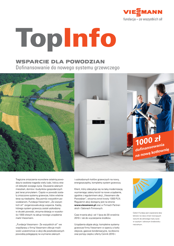 WSPARCIE DLA POWODZIAN Dofinansowanie do nowego systemu grzewczego ł z 0 0 10 ansowania dofin nię otłow k ą w na no Tragiczne zniszczenia wywołane ostatnią powodzią to osobista tragedia wielu ludzi, którzy stracili dobytek swojego życia. Osuszanie zalanych mieszkań, domów i budynków gospodarczych jest teraz priorytetem. Często w powodzi zostały zniszczone systemy grzewcze, które właśnie teraz są niezbędne. Aby pomóc wszystkim powodzianom, Fundacja Viessmann „Ze wszystkich sił” zorganizowała akcję wsparcia. Każdy, którego system grzewczy został uszkodzony w skutek powodzi, otrzyma dotację w wysokości 1000 złotych na zakup nowego urządzenia marki Viessmann. i uszkodzonych kotłów grzewczych na nowy, energoszczędny, kompletny system grzewczy. „Fundacja Viessmann - Ze wszystkich sił” we współpracy z firmą Viessmann oferuje możliwość uczestnictwa w akcji dla poszkodowanych powodzią polegającej na wymianie zalanych Urządzenia objęte akcją: kompletne systemy grzewcze firmy Viessmann w oparciu o kotły olejowe, gazowe kondensacyjne, na drewno oraz pompy ciepła z oferty Cennik 2010 r. Klient, który zdecyduje się na taką modernizację, wymieniając zalany kocioł na nowe urządzenie, zgodnie z regulaminem akcji „Viessmann dla Powodzian”, otrzyma zwrot kwoty 1 000 PLN. Regulamin akcji dostępny jest na stronie www.viessmann.pl oraz w Firmach Partnerskich i Salonach Firmowych. Czas trwania akcji: od 1 lipca do 30 września 2010 r. lub do wyczerpania środków. Celem Fundacji jest wspieranie działalności na rzecz zmian tworzących warunki do zdrowego trybu życia w czystym i zdrowym środowisku naturalnym. WSPARCIE DLA POWODZIAN Dofinansowanie do nowego systemu grzewczego przez Fundację Viessmann Fundacja Viessmann „Ze wszystkich sił” z pomocą powodzianom Od 1 lipca do 30 września 2010 r. potrwa akcja wspierająca osoby dotknięte powodzią zorganizowana przez Fundację Viessmann „Ze wszystkich sił”. Wszyscy ci, których systemy grzewcze zostały uszkodzone lub zniszczone w skutek powodzi, będą mogli skorzystać z pomocy pieniężnej w wysokości 1 000 złotych na zakup nowego systemu grzewczego firmy Viessmann. Akcja skierowana jest do klientów firmy Viessmann, jak również do posiadaczy systemów grzewczych innych firm. Do dyspozycji osób zainteresowanych pomocą będą pracownicy infolinii Viessmann, a także doradcy z Salonów Firmowych oraz Firm Partnerskich z okręgów popowodziowych. Zachęcamy wszystkich do aktywnego włączenia się w informowanie o akcji, aby mogło z niej skorzystać jak najwięcej poszkodowanych osób. Woda jest żywiołem. Procedura przekazania dokumentów: Poszkodowany dzwoni na Infolinię TD24 (0801 0801 24), gdzie konsultant firmy Viessmann informuje o warunkach wsparcia i zaprasza do odwiedzenia Salonu Firmowego lub Firmy Partnerskiej w rejonie dotkniętym powodzią. Salon Firmowy lub Firma Partnerska realizuje wizję lokalną u poszkodowanego i przekazuje klientowi wniosek na przyznanie darowizny. Wysokie wymogi w zakresie wyposażenia w sprzęt diagnostyczny oraz stany magazynowe części zamiennych gwarantują usługi na najwyższym poziomie. Każdy nasz Klient moze w dowolnej chwili skorzystać z 24–godzinnej, dostępnej przez siedem dni w tygodniu opieki technicznej firmy Viessmann. Klient wypełnia oświadczenie i wskazuje sposób przekazania środków (t.j. nr konta lub adres do przekazu pocztowego) W celu otrzymania 1 000 zł pomocy dla powodzian klient lub Firma Partnerska / Salon Firmowy wysyła w terminie do 30.11.2010 r.: oryginał oświadczenia / wniosku , kopię faktury VAT, kopię protokołu uruchomienia, kopię dowodu osobistego, na adres: Fundacja Viessmann „Ze wszystkich sił” ul. Karkonoska 65 53-015 Wrocław z dopiskiem „Akcja Powódź” Godło „Teraz Polska” dla programu 24-godzinnej opieki technicznej firmy Viessmann. Szczegółowych informacji udziela nasza Infolinia tel. 0801 0801 24 Twój Fachowy Serwis: Zmiany techniczne zastrzeżone PL 06/2010 Salon Firmowy lub Firma Partnerska po uruchomieniu urządzenia grzewczego w oświadczeniu wypisuje nr seryjny urządzenia i przekazuje kopię protokołu uruchomienia urządzenia.
