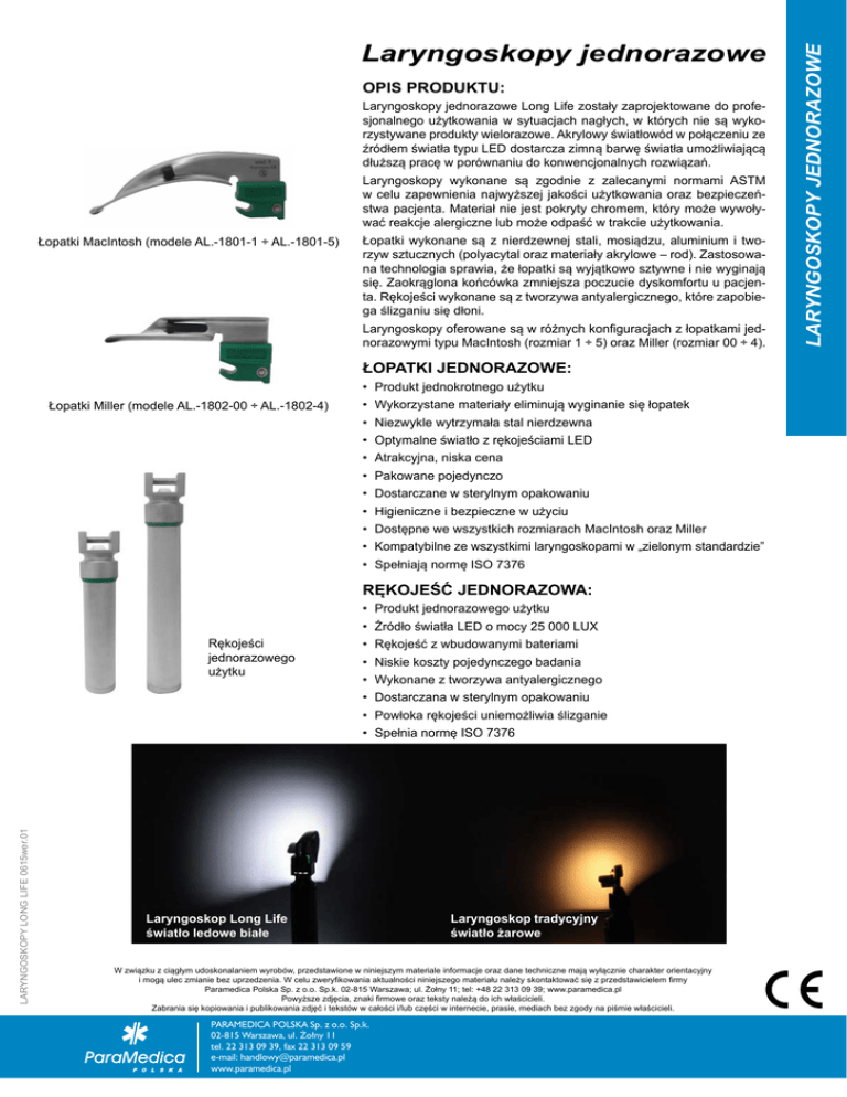 OPIS PRODUKTU: Laryngoskopy jednorazowe Long Life zostały zaprojektowane do profesjonalnego użytkowania w sytuacjach nagłych, w których nie są wykorzystywane produkty wielorazowe. Akrylowy światłowód w połączeniu ze źródłem światła typu LED dostarcza zimną barwę światła umożliwiającą dłuższą pracę w porównaniu do konwencjonalnych rozwiązań. Laryngoskopy wykonane są zgodnie z zalecanymi normami ASTM w celu zapewnienia najwyższej jakości użytkowania oraz bezpieczeństwa pacjenta. Materiał nie jest pokryty chromem, który może wywoływać reakcje alergiczne lub może odpaść w trakcie użytkowania. Łopatki MacIntosh (modele AL.-1801-1 ÷ AL.-1801-5) Łopatki wykonane są z nierdzewnej stali, mosiądzu, aluminium i tworzyw sztucznych (polyacytal oraz materiały akrylowe – rod). Zastosowana technologia sprawia, że łopatki są wyjątkowo sztywne i nie wyginają się. Zaokrąglona końcówka zmniejsza poczucie dyskomfortu u pacjenta. Rękojeści wykonane są z tworzywa antyalergicznego, które zapobiega ślizganiu się dłoni. Laryngoskopy oferowane są w różnych konfiguracjach z łopatkami jednorazowymi typu MacIntosh (rozmiar 1 ÷ 5) oraz Miller (rozmiar 00 ÷ 4). ŁOPATKI JEDNORAZOWE: • Produkt jednokrotnego użytku Łopatki Miller (modele AL.-1802-00 ÷ AL.-1802-4) • Wykorzystane materiały eliminują wyginanie się łopatek • Niezwykle wytrzymała stal nierdzewna • Optymalne światło z rękojeściami LED • Atrakcyjna, niska cena • Pakowane pojedynczo • Dostarczane w sterylnym opakowaniu • Higieniczne i bezpieczne w użyciu • Dostępne we wszystkich rozmiarach MacIntosh oraz Miller • Kompatybilne ze wszystkimi laryngoskopami w „zielonym standardzie” • Spełniają normę ISO 7376 RĘKOJEŚĆ JEDNORAZOWA: • Produkt jednorazowego użytku • Źródło światła LED o mocy 25 000 LUX Rękojeści jednorazowego użytku • Rękojeść z wbudowanymi bateriami • Niskie koszty pojedynczego badania • Wykonane z tworzywa antyalergicznego • Dostarczana w sterylnym opakowaniu • Powłoka rękojeści uniemożliwia ślizganie LARYNGOSKOPY LONG LIFE 0615wer.01 • Spełnia normę ISO 7376 Laryngoskop Long Life światło ledowe białe Laryngoskop tradycyjny światło żarowe W związku z ciągłym udoskonalaniem wyrobów, przedstawione w niniejszym materiale informacje oraz dane techniczne mają wyłącznie charakter orientacyjny i mogą ulec zmianie bez uprzedzenia. W celu zweryfikowania aktualności niniejszego materiału należy skontaktować się z przedstawicielem firmy Paramedica Polska Sp. z o.o. Sp.k. 02-815 Warszawa; ul. Żołny 11; tel: +48 22 313 09 39; www.paramedica.pl Powyższe zdjęcia, znaki firmowe oraz teksty należą do ich właścicieli. Zabrania się kopiowania i publikowania zdjęć i tekstów w całości i/lub części w internecie, prasie, mediach bez zgody na piśmie właścicieli. PARAMEDICA POLSKA Sp. z o.o. Sp.k. 02-815 Warszawa, ul. Żołny 11 tel. 22 313 09 39, fax 22 313 09 59 e-mail: [email protected] www.paramedica.pl LARYNGOSKOPY JEDNORAZOWE Laryngoskopy jednorazowe