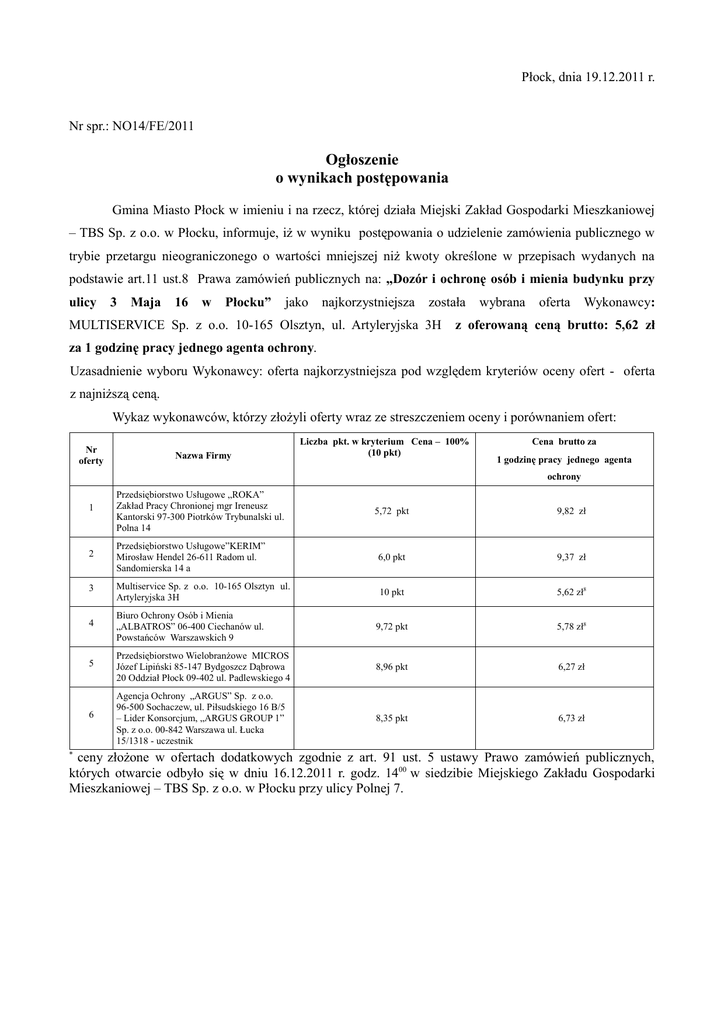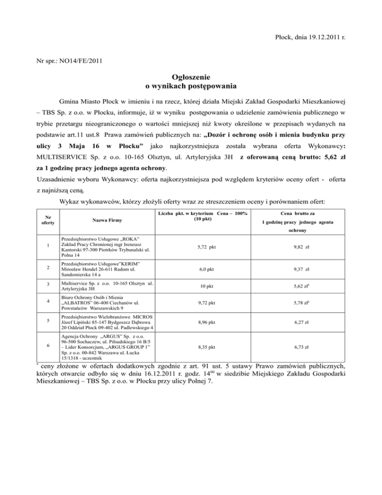 Płock, dnia 19.12.2011 r. Nr spr.: NO14/FE/2011 Ogłoszenie o wynikach postępowania Gmina Miasto Płock w imieniu i na rzecz, której działa Miejski Zakład Gospodarki Mieszkaniowej – TBS Sp. z o.o. w Płocku, informuje, iż w wyniku postępowania o udzielenie zamówienia publicznego w trybie przetargu nieograniczonego o wartości mniejszej niż kwoty określone w przepisach wydanych na podstawie art.11 ust.8 Prawa zamówień publicznych na: „Dozór i ochronę osób i mienia budynku przy ulicy 3 Maja 16 w Płocku” jako najkorzystniejsza została MULTISERVICE Sp. z o.o. 10-165 Olsztyn, ul. Artyleryjska 3H wybrana oferta Wykonawcy: z oferowaną ceną brutto: 5,62 zł za 1 godzinę pracy jednego agenta ochrony. Uzasadnienie wyboru Wykonawcy: oferta najkorzystniejsza pod względem kryteriów oceny ofert - oferta z najniższą ceną. Wykaz wykonawców, którzy złożyli oferty wraz ze streszczeniem oceny i porównaniem ofert: Nr oferty Nazwa Firmy Liczba pkt. w kryterium Cena – 100% (10 pkt) Cena brutto za 1 godzinę pracy jednego agenta ochrony * 1 Przedsiębiorstwo Usługowe „ROKA” Zakład Pracy Chronionej mgr Ireneusz Kantorski 97-300 Piotrków Trybunalski ul. Polna 14 2 5,72 pkt 9,82 zł Przedsiębiorstwo Usługowe”KERIM” Mirosław Hendel 26-611 Radom ul. Sandomierska 14 a 6,0 pkt 9,37 zł 3 Multiservice Sp. z o.o. 10-165 Olsztyn ul. Artyleryjska 3H 10 pkt 5,62 zł8 4 Biuro Ochrony Osób i Mienia „ALBATROS” 06-400 Ciechanów ul. Powstańców Warszawskich 9 9,72 pkt 5,78 zł8 5 Przedsiębiorstwo Wielobranżowe MICROS Józef Lipiński 85-147 Bydgoszcz Dąbrowa 20 Oddział Płock 09-402 ul. Padlewskiego 4 8,96 pkt 6,27 zł 6 Agencja Ochrony „ARGUS” Sp. z o.o. 96-500 Sochaczew, ul. Piłsudskiego 16 B/5 – Lider Konsorcjum, „ARGUS GROUP 1” Sp. z o.o. 00-842 Warszawa ul. Łucka 15/1318 - uczestnik 8,35 pkt 6,73 zł ceny złożone w ofertach dodatkowych zgodnie z art. 91 ust. 5 ustawy Prawo zamówień publicznych, których otwarcie odbyło się w dniu 16.12.2011 r. godz. 1400 w siedzibie Miejskiego Zakładu Gospodarki Mieszkaniowej – TBS Sp. z o.o. w Płocku przy ulicy Polnej 7.