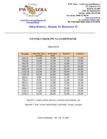 P.W. Izba – Listwy przypodłogowe Ul. Łąkowa 114 Radom 26-600 NIP PL7962535707 Tel/fax: (048) 383-55-88 Tel. Kom. 0608 32 08 69 [email protected] Nr rachunku bankowego: 89 1140 2004 0000 3302 3118 9578 www.listwy-przypodlogowe.pl www.pwizba.pl Sklep firmowy: Radom, Ul. Biznesowa 19 CENNIK COKOŁÓW NA ZAMÓWIENIE OKLEINA Wymiar Dąb, Buk, Dąb czerwony Jesion biały, Klon Egzotyk 1 Egzotyk 2 60x18 70x18 80x18 90x18 100x18 110x18 120x18 60x11 70x11 80x11 90x11 100x11 110x11 120x11 12,00 14,00 15,50 17,50 19,50 22,00 24,50 9,00 9,50 12,00 13,50 14,50 17,00 18,50 13,00 15,00 16,50 18,50 20,50 23,00 26,00 10,00 10,50 13,00 14,50 15,50 18,00 20,00 15,50 17,50 19,00 22,50 24,50 29,00 30,00 11,50 12,00 15,00 17,50 19,00 22,50 25,00 17,00 19,00 22,00 24,00 26,00 31,00 33,00 12,50 13,00 16,50 19,50 22,00 24,00 28,00 Egzotyk 1: sapeli, jatoba, doussie, czereśnia amerykańska, ipe Egzotyk 2: teak, orzech amerykański, palisander, wenge, sucupira Czas realizacji: ok. 14- 21 dni.