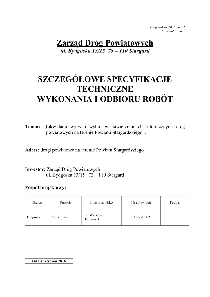 Zarząd Dróg Powiatowych SZCZEGÓŁOWE SPECYFIKACJE