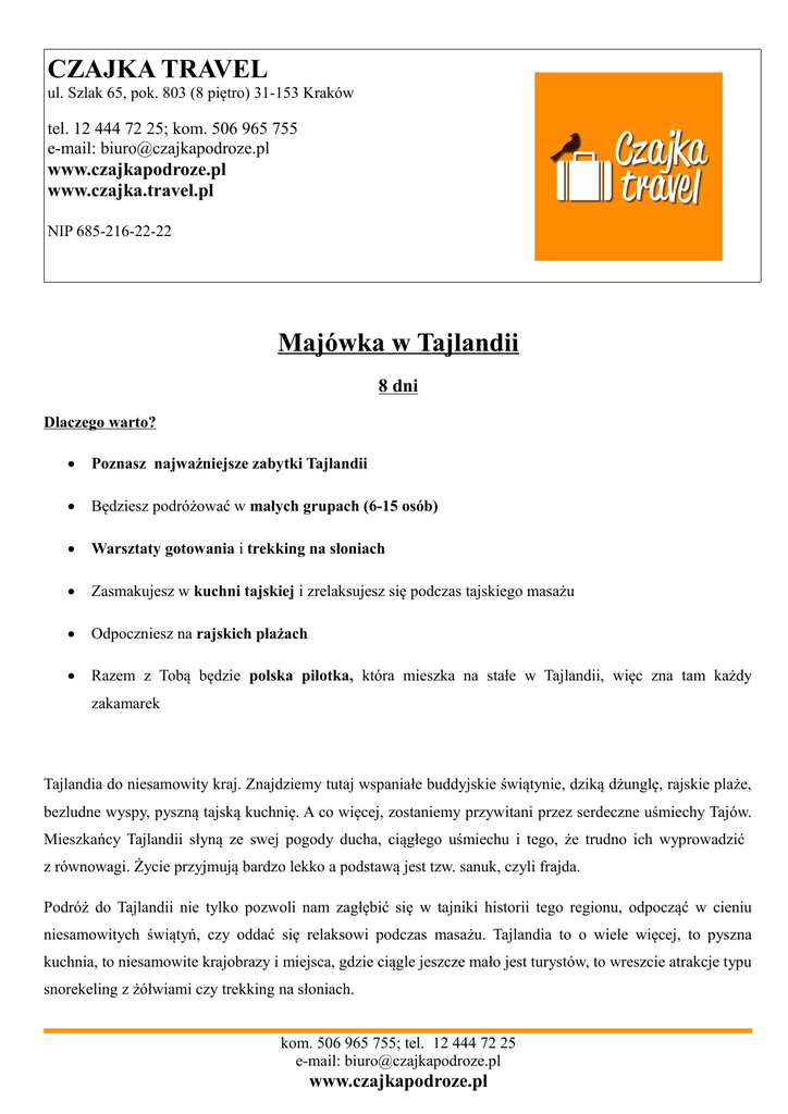 CZAJKA TRAVEL ul. Szlak 65, pok. 803 (8 piętro) 31-153 Kraków tel. 12 444 72 25; kom. 506 965 755 e-mail: [email protected] www.czajkapodroze.pl www.czajka.travel.pl NIP 685-216-22-22 Majówka w Tajlandii 8 dni Dlaczego warto? Poznasz najważniejsze zabytki Tajlandii Będziesz podróżować w małych grupach (6-15 osób) Warsztaty gotowania i trekking na słoniach Zasmakujesz w kuchni tajskiej i zrelaksujesz się podczas tajskiego masażu Odpoczniesz na rajskich plażach Razem z Tobą będzie polska pilotka, która mieszka na stałe w Tajlandii, więc zna tam każdy zakamarek Tajlandia do niesamowity kraj. Znajdziemy tutaj wspaniałe buddyjskie świątynie, dziką dżunglę, rajskie plaże, bezludne wyspy, pyszną tajską kuchnię. A co więcej, zostaniemy przywitani przez serdeczne uśmiechy Tajów. Mieszkańcy Tajlandii słyną ze swej pogody ducha, ciągłego uśmiechu i tego, że trudno ich wyprowadzić z równowagi. Życie przyjmują bardzo lekko a podstawą jest tzw. sanuk, czyli frajda. Podróż do Tajlandii nie tylko pozwoli nam zagłębić się w tajniki historii tego regionu, odpocząć w cieniu niesamowitych świątyń, czy oddać się relaksowi podczas masażu. Tajlandia to o wiele więcej, to pyszna kuchnia, to niesamowite krajobrazy i miejsca, gdzie ciągle jeszcze mało jest turystów, to wreszcie atrakcje typu snorekeling z żółwiami czy trekking na słoniach. kom. 506 965 755; tel. 12 444 72 25 e-mail: [email protected] www.czajkapodroze.pl Daj się porwać i oczarować Azji Południowo-Wschodniej i jedź z nami na odkrywanie Tajlandii. Program idealny dla osób, które nie mają czasu na długi urlop, a chcą zobaczyć to, co w Tajlandii najpiękniejsze. Pilotem wyjazdu będzie Lucy Kopiniak PROGRAM 1 dzień: Wylot z Polski do Bangkoku. 2 dzień: BANGKOK Przylot do Bangkoku, transfer do hostelu, zakwaterowanie i czas wolny na odpoczynek po locie. Wieczorem wyprawa w szalone zakamarki uliczne miasta. Najlepsze sea food w mieście. Odkrywanie tajskiej kuchni ulicznej i życia nocnego miasta. Rajdy tuktukami. Nocleg w Bangkoku. 3 dzień: BANGKOK Wycieczka do najważniejszych świątyń w Bangkoku. Zaczniemy od Świątyni Szmaragdowego Buddy, gdzie poznamy legendy związane z posążkiem. Następnie udamy się do Świątyni Leżącego Buddy w której znajduje się największy posąg Buddy odpoczywającego w Bangkoku. Na koniec poznamy historię Świątyni Świtu, symbolu Bangkoku. Wieczorem drink na dachu z panoramą miasta i tańce dla wytrwałych. Nocleg w Bangkoku. 4 dzień: BANGKOK – PATTAYA – wyspa KOH LARN - BANGKOK Po śniadaniu dla chętnych kurs gotowania potraw tajskich (9.30-13.00) Następnie wycieczka na wyspę Koh Larn, gdzie zostaniemy aż do widowiskowego zachodu słońca. Po zachodzie przespacerujemy się po Walking Street w Pattaya, a po kolacji wrócimy na nocleg do Bangkoku. 5 dzień: BANGKOK – AYUTTHAYA - BANGKOK Po śniadaniu ruszamy do Ayutthaya. Zwiedzimy Zespół Pałacowy Bang Pa Inn i Park Historyczny Ayutthaya, w tym 3 zabytkowe świątynie. Następnie tradycyjny tajski obiad w Ayutthaya. Wieczorem wrócimy do Bangkoku aby zrelaksować się podczas tradycyjnego tajskiego masażu (2h). Nocleg w Bangkoku. kom. 506 965 755; tel. 12 444 72 25 e-mail: [email protected] www.czajkapodroze.pl 6 dzień: BANGKOK – WODNY TARG – KANCHANABURI – HUA HIN Wczesne śniadanie i wymeldowanie z hotelu. Dzień zaczniemy od wycieczki na Targ Wodny, jeden z największych w Tajlandii i jeden z ostatnich bastionów tradycji tajskiej - handlu na łódkach. Po drodze zatrzymamy się na targu, który funkcjonuje od niemalże 100 lat. Targ na torach. Codziennie przejeżdża przez targ pociąg, gdzie w tym czasie straganiki składają się w kilka sekund po czym rozkładają się od nowa. Szkoła przetrwania :) Następnie przejedziemy do Kanchanaburi, miasta i prowincji w której znajduje się znany z powieści i z filmu "Most na Rzece Kwai". Zwiedzimy muzeum Kolei Śmierci. Będzie też czas na pyszne tajskie jedzenie i zakupy. Dla chętnych trekking na słoniach w dżungli i kąpiel ze słoniami w rzece. Po pełnym atrakcji dniu przejedziemy na nocleg do hotelu w Hua Hin. 7 dzień: HUA HIN Czas na relaks. Plażowanie i odpoczynek. Na zakończenie dnia – pożegnalna kolacja. Nocleg w Hua Hin. 8 dzień: HUA HIN - BANGKOK Po śniadaniu wymeldowanie z hotelu i przejazd na lotnisko do Bangkoku. Wylot do Polski. Kolejność zwiedzania może ulec zmianie. Przylot do Polski może być o jeden dzień później w zależności od godzin przelotów Wycieczki fakultatywne: 1) Bangkok - Kurs gotowania potraw tajskich: 50 USD / 1 os. 2) Kanchanaburi – Trekking na słoniach i kąpiel w rzece - 50 USD / 1 os. CENA OBEJMUJE: Bilet lotniczy na trasie Warszawa-Bangkok-Warszawa z przesiadką (do kwoty 2000 PLN) 6 noclegów zgodnie z programem 6 śniadań Transport zgodnie z programem: klimatyzowany bus/samochód Zwiedzanie zgodnie z programem i rajd tuktukami Opiekę polskiego pilota/rezydenta kom. 506 965 755; tel. 12 444 72 25 e-mail: [email protected] www.czajkapodroze.pl Tajskich przewodników Ubezpieczenie KL, NNW, bagażu CENA NIE OBEJMUE: Obiadokolacji (ok. 10-20 USD/os/dzień) Wydatków na pamiątki Zwyczajowych napiwków (5-10% ceny, około 20-30 USD/os/ na cały wyjazd) 2 wycieczek fakultatywnych (50 USD/os/wycieczka) TERMINY/CENY TERMIN CENA Terminy na rok 2017 już wkrótce. Jeśli w tabeli nie widzisz terminu, w którym chcesz pojechać – skontaktuj się z nami. Dopasujemy się do Ciebie w miarę naszych możliwości. UWAGA: Cena: zaliczka (500 PLN) płatna w momencie zapisu; II rata (4000 PLN) płatna na ok. 90 dni przed wyjazdem lub w momencie zakupu biletów lotniczych; III rata (pozostała kwota) płatna na 45 dni przed wyjazdem Przelot - Nasze biuro zajmie się zakupem biletów lotniczych. Po zebraniu się grupy, szukamy dla Państwa najkorzystniejszej opcji przelotu. Po zaakceptowaniu i wpłacie, dokonujemy zakupu. Cena biletu lotniczego na trasie Warszaw
