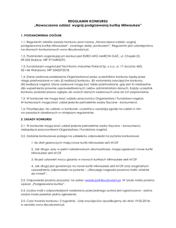 REGULAMIN KONKURSU „Nowoczesna odzie : wygraj podgrzewan kurtk Milwaukee” 1. POSTANOWIENIA OGÓLNE 1.1. Regulamin okre la zasady konkursu pod nazw „Nowoczesna odzie : wygraj podgrzewan kurtk Milwaukee”, zwanego dalej „konkursem”. Regulamin jest udost pniony na stronach konkursowych www.4budowlani.pl. 1.2. Podmiotem organizuj cym konkurs jest EURO MTG MARCIN GA , ul. Chojaki 22, 09-533 S ubice, NIP 9710493270. 1.3. Fundatorem nagród jest Techtronic Industries Poland Sp. z o.o. ul. 17 stycznia 45D, 02-146 Warszawa, NIP 5342272218. 1.4. Dane osobowe przekazane Organizatorowi przez uczestników konkursu b przez niego przetwarzane w celu (I) realizacji konkursu, (II) wy onienia zwyci zców konkursu, (III) realizacji nagród. Dane osobowe mog by tak e przetwarzane, gdy jest to niezb dne dla wype nienia prawnie usprawiedliwionych celów administratora danych. Ka dy uczestnik konkursu posiada prawo wgl du do swoich danych osobowych oraz do ich poprawiania. 1.5. W konkursie nie mog bra udzia u pracownicy Organizatora i Fundatora nagród. W konkursach mog bra udzia jedynie pe noletnie osoby fizyczne - konsumenci. 1.6. Przyst puj c do udzia u w konkursie, uczestnicy wyra aj zgod na udzia w nim na zasadach okre lonych w niniejszym regulaminie. 2. ZASADY KONKURSU 2.1. W konkursie mog bra udzia jedynie pe noletnie osoby fizyczne – konsumenci, nieb ce pracownikami Organizatora i Fundatora nagród. 2.2. Zadanie konkursowe polega na udzieleniu odpowiedzi na pytania konkursowe: 1. Ile stref grzewczych maj nowe kurtki Milwaukee serii M12? 2. Jak d ugo, przy w pe ni na adowanym akumulatorze, mog ogrzewa nowe kurtki Milwaukee serii M12? 3. Ile jest ustawie mocy grzania w nowych kurtkach Milwaukee serii M12? 4. Jak d uga jest gwarancja na nowe kurtki Milwaukee serii M12? oraz oryginalnym uzasadnieniu odpowiedzi na pytanie – „Dlaczego nagroda powinna trafi w nie do mnie?”. 2.3. Odpowiedzi prosimy przysy wpisa „Podgrzewana kurtka”. na adres: [email protected]. W tytule maila prosimy 2.4. Liczba maili z odpowiedziami nades ana przez jednego autora jest ograniczona – jedna osoba mo e przes jedno zg oszenie. 2.5. Czas trwania konkursu: 2 tygodnie. List zwyci zców opublikujemy do dnia 19.02.2016r. w serwisie www.4budowlani.pl. 3. KRYTERIA OCENY 3.1. Przy ocenie wyników b dzie brana pod uwag poprawno oraz oryginalno uzasadnienia. odpowiedzi 3.2. Komisja konkursowa sk ada si z zespo u redakcyjnego serwisu www.4budowlani.pl. 4. PRAWA AUTORSKIE 4.1. Zg aszaj c si do udzia u w Konkursie w sposób przewidziany w niniejszym Regulaminie Uczestnik, o wiadcza i zapewnia, i Utwór Uczestnika nie b dzie narusza praw, w tym praw autorskich i praw pokrewnych lub dóbr Strona 2 z 3 osobistych osób trzecich a jego tre dzie zgodna z obowi zuj cym prawem i zasadami wspó ycia spo ecznego. Publikacja Utworu nie b dzie rodzi a po stronie Organizatora obowi zku wyp aty jakichkolwiek wynagrodze osobom trzecim ani Uczestnikowi b innego rodzaju odpowiedzialno ci z tytu u korzystania lub naruszenia praw maj tkowych lub osobistych. 4.2. Je eli Organizator w nast pstwie publikacji Utworu Uczestnika poniesie koszty zwi zane z naruszeniem praw lub dóbr osobistych osób trzecich, niezgodno ci z prawem b naruszeniem autorskich praw osobistych lub maj tkowych twórców – Uczestnik, pokryje te koszty w ca ci, w tym w szczególno ci pokryje równowarto wszelkich wydatków powsta ych w zwi zku z ustalaniem, czy roszczenia osób trzecich s zasadne, w tym koszty i wydatki na obs ug prawn i zast pstwo prawne. Jednocze nie Uczestnik, zobowi zuje si przyst pi (wst pi ) – je eli zaistnieje taka mo liwo pod wzgl dem procesowym - do ewentualnych post powa s dowych b cych konsekwencj powo anych wy ej narusze . 4.3. Z chwil dodania Utworu Uczestnik udziela Organizatorowi nieodp atnej, niewy cznej, nieograniczonej terytorialnie, na czas nieoznaczony licencji (w tym sublicencji) na korzystanie z Utworu (dalej „Licencja”) na nast puj cych polach eksploatacji: a) pobranie Utworu, wprowadzenie do pami ci komputera, zapisanie i przechowywanie na wszystkich typach no ników, w czaj c w to sporz dzanie ich kopii oraz dowolne korzystanie i rozporz dzanie tymi kopiami; b) modyfikacja warstwy prezentacyjnej, czenie z elementami graficznymi, tekstowymi, a tak e t umaczenie oraz twórcze przekszta cenie, przerobienie, adaptowanie ca ci Utworu lub jego fragmentów oraz rozporz dzanie i korzystanie z takich opracowa na wszystkich polach eksploatacji okre lonych w niniejszym Regulaminie; c) trwa e lub czasowe utrwalanie Utworu i zwielokrotnianie Utworu w szczególno ci technik drukarsk i reprograficzn w formie materia u prasowego, a tak e za po rednictwem programów komputerowych; d) korzystanie z Utworu poprzez m.in. publikowanie Utworu w celach marketingowych, promocyjnych, sponsoringowych Organizatora i podmiotów, którym udzielono sublicencji, poprzez odtwarzanie w materia ach reklamowych, prasowych, radiowo-telewizyjnych, kampaniach reklamowych, newsletterach, informacjach prasowych Organizatora, a tak e publiczne udost pnianie Utworu, jego modyfikacji i utworów zale nych w taki sposób, aby ka dy móg mie do niego dost p w miejscu i w czasie przez siebie wybranym, w tym w aplikacjach internetowych; e) inne ni okre lone w pkt. d korzystanie ze Utworu w celach marketingowych i promocyjnych Organizatora i podmiotów, którym udzielono sublicencji; f) publiczne rozpowszechnianie, w szczególno ci wy wietlanie, publiczne odtworzenie, nadawanie i reemitowanie w dowolnym systemie lub standardzie, a tak e publiczne udost pnianie Utworu w ten sposób, aby ka dy móg mie do niego dost p w miejscu i czasie przez siebie wybranym, w szczególno ci elektroniczne udost pnianie na danie, w tym rozpowszechnienie w sieci Internet oraz w sieciach zamkni tych; g) prawo do udost pniania Utworu do korzystania, w tym udzielania licencji na rzecz osób trzecich, na wszystkich wymienionych powy ej polach eksploatacji. 4.4. Zg aszaj cy nie b dzie ro ci a