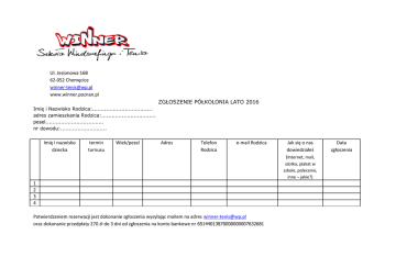 Ul. Jesionowa 16B 62-052 Chomęcice [email protected] www.winner.poznan.pl ZGŁOSZENIE PÓŁKOLONIA LATO 2016 Imię i Nazwisko Rodzica:................................... adres zamieszkania Rodzica:................................ pesel.................................. nr dowodu:........................... Imię i nazwisko dziecka termin turnusu Wiek/pesel Adres Telefon Rodzica e-mail Rodzica Jak się o nas dowiedziałeś (Internet, mail, ulotka, plakat w szkole, polecenie, inne – jakie?) 1 2 3 4 Potwierdzeniem rezerwacji jest dokonanie zgłoszenia wysyłając mailem na adres [email protected] oraz dokonanie przedpłaty 270 zł do 3 dni od zgłoszenia na konto bankowe nr 65144013870000000007632681 Data zgłoszenia