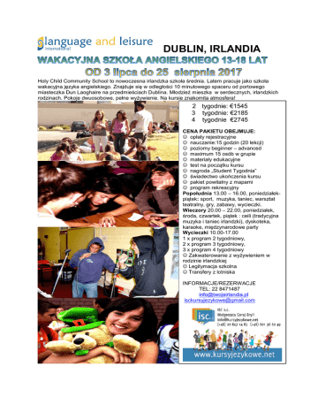 DUBLIN, IRLANDIA Holy Child Community School to nowoczesna irlandzka szkoła średnia. Latem pracuje jako szkoła wakacyjna języka angielskiego. Znajduje się w odległości 10 minutowego spaceru od portowego miasteczka Dun Laoghaire na przedmieściach Dublina. Młodzież mieszka w serdecznych, irlandzkich rodzinach. Pokoje dwuosobowe, pełne wyżywienie. Na kursie znakomita atmosfera! 2 tygodnie: €1545 3 tygodnie: €2185 4 tygodnie €2745 CENA PAKIETU OBEJMUJE: opłaty rejestracyjne nauczanie:15 godzin (20 lekcji) poziomy beginner – advanced maximum 15 osób w grupie materiały edukacyjne test na początku kursu nagroda „Student Tygodnia” świadectwo ukończenia kursu pakiet powitalny z mapami program rekreacyjny Popołudnia 13.00 – 16.00, poniedziałekpiątek: sport, muzyka, taniec, warsztat teatralny, gry, zabawy, wycieczki. Wieczory 20.00 – 22.00, poniedziałek, środa, czwartek, piątek : ceili (tradycyjna muzyka i taniec irlandzki), dyskoteka, karaoke, międzynarodowe party Wycieczki 10.00-17.00 1 x program 2 tygodniowy, 2 x program 3 tygodniowy, 3 x program 4 tygodniowy Zakwaterowanie z wyżywieniem w rodzinie irlandzkiej Legitymacja szkolna Transfery z lotniska INFORMACJE/REZERWACJE TEL: 22 8471487 [email protected] [email protected] TE