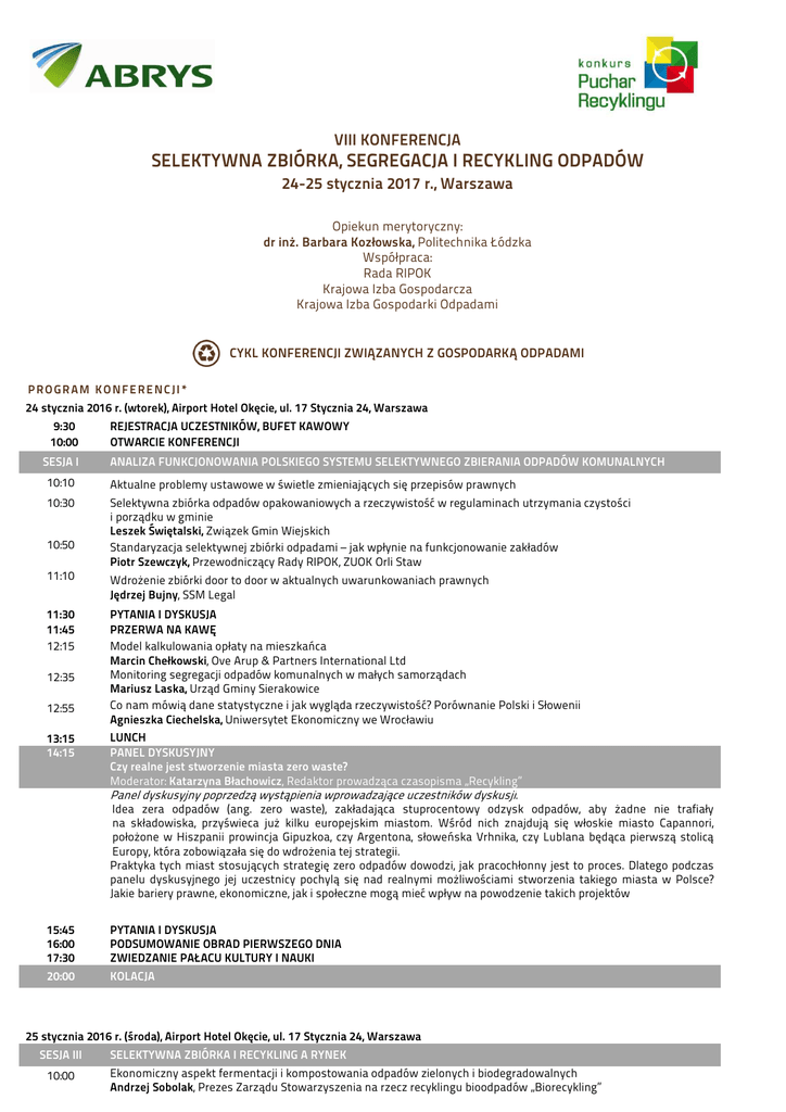 VIII KONFERENCJA SELEKTYWNA ZBIÓRKA, SEGREGACJA I RECYKLING ODPADÓW 24-25 stycznia 2017 r., Warszawa Opiekun merytoryczny: dr inż. Barbara Kozłowska, Politechnika Łódzka Współpraca: Rada RIPOK Krajowa Izba Gospodarcza Krajowa Izba Gospodarki Odpadami CYKL KONFERENCJI ZWIĄZANYCH Z GOSPODARKĄ ODPADAMI PROGRAM KONFERENCJI* 24 stycznia 2016 r. (wtorek), Airport Hotel Okęcie, ul. 17 Stycznia 24, Warszawa 9:30 10:00 SESJA I REJESTRACJA UCZESTNIKÓW, BUFET KAWOWY OTWARCIE KONFERENCJI ANALIZA FUNKCJONOWANIA POLSKIEGO SYSTEMU SELEKTYWNEGO ZBIERANIA ODPADÓW KOMUNALNYCH 10:10 Aktualne problemy ustawowe w świetle zmieniających się przepisów prawnych 10:30 Selektywna zbiórka odpadów opakowaniowych a rzeczywistość w regulaminach utrzymania czystości i porządku w gminie Leszek Świętalski, Związek Gmin Wiejskich Standaryzacja selektywnej zbiórki odpadami – jak wpłynie na funkcjonowanie zakładów Piotr Szewczyk, Przewodniczący Rady RIPOK, ZUOK Orli Staw 10:50 11:10 Wdrożenie zbiórki door to door w aktualnych uwarunkowaniach prawnych Jędrzej Bujny, SSM Legal 11:30 11:45 12:15 PYTANIA I DYSKUSJA PRZERWA NA KAWĘ Model kalkulowania opłaty na mieszkańca Marcin Chełkowski, Ove Arup & Partners International Ltd Monitoring segregacji odpadów komunalnych w małych samorządach Mariusz Laska, Urząd Gminy Sierakowice Co nam mówią dane statystyczne i jak wygląda rzeczywistość? Porównanie Polski i Słowenii Agnieszka Ciechelska, Uniwersytet Ekonomiczny we Wrocławiu 12:35 12:55 13:15 14:15 LUNCH PANEL DYSKUSYJNY Czy realne jest stworzenie miasta zero waste? Moderator: Katarzyna Błachowicz, Redaktor prowadząca czasopisma „Recykling” Panel dyskusyjny poprzedzą wystąpienia wprowadzające uczestników dyskusji. Idea zera odpadów (ang. zero waste), zakładająca stuprocentowy odzysk odpadów, aby żadne nie trafiały na składowiska, przyświeca już kilku europejskim miastom. Wśród nich znajdują się włoskie miasto Capannori, położone w Hiszpanii prowincja Gipuzkoa, czy Argentona, słoweńska Vrhnika, czy Lublana będąca pierwszą stolicą Europy, która zobowiązała się do wdrożenia tej strategii. Praktyka tych miast stosujących strategię zero odpadów dowodzi, jak pracochłonny jest to proces. Dlatego podczas panelu dyskusyjnego jej uczestnicy pochylą się nad realnymi możliwościami stworzenia takiego miasta w Polsce? Jakie bariery prawne, ekonomiczne, jak i społeczne mogą mieć wpływ na powodzenie takich projektów 15:45 16:00 17:30 PYTANIA I DYSKUSJA PODSUMOWANIE OBRAD PIERWSZEGO DNIA ZWIEDZANIE PAŁACU KULTURY I NAUKI 20:00 KOLACJA 25 stycznia 2016 r. (środa), Airport Hotel Okęcie, ul. 17 Stycznia 24, Warszawa SESJA III 10:00 SELEKTYWNA ZBIÓRKA I RECYKLING A RYNEK Ekonomiczny aspekt fermentacji i kompostowania odpadów zielonych i biodegradowalnych Andrzej Sobolak, Prezes Zarządu Stowarzyszenia na rzecz recyklingu bioodpadów „Biorecykling” 10:20 10:40 11:00 11:20 11:40 Efektywność ekonomiczna odzysku opakowań w polskim systemie zbiórki odpadów Krzysztof Baczyński, Związek EKO-PAK System gospodarowania odpadami opakowaniowymi w Polsce. Perspektywa zamknięcia obiegu Tomasz Styś, Instytut Sobieskiego Rola PSZOKów na rynku Marcin Zeszutek, Projekt PSZOK Punkt skupu surowców - jego miejsce w systemie selektywnego zbierania odpadów Ryszard Gola-Sienkiewicz, Państwowa Wyższa Szkoła Zawodowa w Głogowie Mini PSZOKi w Kartuzach Olga Goitowska. Urząd Gminy Kartuzy 12:00 PRZERWA KAWOWA 12:30 PANEL DYSKUSYJNY Nowe perspektywy dla odpadów– aspekty techniczne i kształtowanie cen 13:30 13:40 14:40 PYTANIA I DYSKUSJA LUNCH PANEL DYSKUSYJNY Projekt wprowadzenia Circular Economy w gminach Moderator: dr inż. Barbara Kozłowska, Politechnika Łódzka Panel dyskusyjny poprzedzą wystąpienia wprowadzające uczestników dyskusji. W Polsce gospodarka o obiegu zamkniętym traktowana jest jako szansa rozwojowa. Jak wdrożyć program pilotażowy? Jakie wyzwania stoją przed samorządami? Jaki jest polski sposób na circular economy? Na te i wiele innych pytań postaramy się odpowiedzieć wspólnie z ekspertami i praktykami. 16:10 PYTANIA I DYSKUSJA 16:50 PODSUMOWANIE I ZAKOŃCZENIE KONFERENCJI *Organizatorzy zastrzegają sobie prawo do zmian w programie