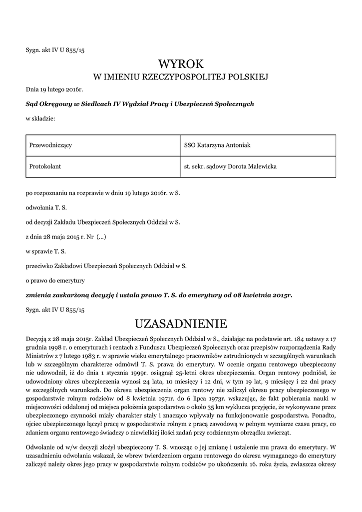 Sygn. akt IV U 855/15 WYROK W IMIENIU RZECZYPOSPOLITEJ POLSKIEJ Dnia 19 lutego 2016r. Sąd Okręgowy w Siedlcach IV Wydział Pracy i Ubezpieczeń Społecznych w składzie: Przewodniczący SSO Katarzyna Antoniak Protokolant st. sekr. sądowy Dorota Malewicka po rozpoznaniu na rozprawie w dniu 19 lutego 2016r. w S. odwołania T. S. od decyzji Zakładu Ubezpieczeń Społecznych Oddział w S. z dnia 28 maja 2015 r. Nr (...) w sprawie T. S. przeciwko Zakładowi Ubezpieczeń Społecznych Oddział w S. o prawo do emerytury zmienia zaskarżoną decyzję i ustala prawo T. S. do emerytury od 08 kwietnia 2015r. Sygn. akt IV U 855/15 UZASADNIENIE Decyzją z 28 maja 2015r. Zakład Ubezpieczeń Społecznych Oddział w S., działając na podstawie art. 184 ustawy z 17 grudnia 1998 r. o emeryturach i rentach z Funduszu Ubezpieczeń Społecznych oraz przepisów rozporządzenia Rady Ministrów z 7 lutego 1983 r. w sprawie wieku emerytalnego pracowników zatrudnionych w szczególnych warunkach lub w szczególnym charakterze odmówił T. S. prawa do emerytury. W ocenie organu rentowego ubezpieczony nie udowodnił, iż do dnia 1 stycznia 1999r. osiągnął 25-letni okres ubezpieczenia. Organ rentowy podniósł, że udowodniony okres ubezpieczenia wynosi 24 lata, 10 miesięcy i 12 dni, w tym 19 lat, 9 miesięcy i 22 dni pracy w szczególnych warunkach. Do okresu ubezpieczenia organ rentowy nie zaliczył okresu pracy ubezpieczonego w gospodarstwie rolnym rodziców od 8 kwietnia 1971r. do 6 lipca 1973r. wskazując, że fakt pobierania nauki w miejscowości oddalonej od miejsca położenia gospodarstwa o około 35 km wyklucza przyjęcie, że wykonywane przez ubezpieczonego czynności miały charakter stały i znacząco wpływały na funkcjonowanie gospodarstwa. Ponadto, ojciec ubezpieczonego łączył pracę w gospodarstwie rolnym z pracą zawodową w pełnym wymiarze czasu pracy, co zdaniem organu rentowego świadczy o niewielkiej ilości zadań przy codziennym obrządku zwierząt. Odwołanie od w/w decyzji złożył ubezpieczony T. S. wnosząc o jej zmianę i ustalenie mu prawa do emerytury. W uzasadnieniu odwołania wskazał, że wbrew twierdzeniom organu rentowego do okresu wymaganego do emerytury zaliczyć należy okres jego pracy w gospodarstwie rolnym rodziców po ukończeniu 16. roku życia, zwłaszcza okresy wakacji szkolnych od 30 czerwca 1971r. do 31 sierpnia 1971r. oraz od 30 czerwca 1972r. do 31 sierpnia 1972r. gdyż właśnie w tym okresie odbywają się najbardziej intensywne prace polowe. Przyznał, że jego ojciec pracował zawodowo, ale podyktowane to było koniecznością utrzymania rodziny. poza gospodarstwem rolnym rodziców, gdyż powyższe było konieczne do utrzymania rodziny (odwołanie k.1-3 akt sprawy). W odpowiedzi na odwołanie organ rentowy wniósł o jego oddalenie powołując się na przepisy prawa i uzasadnienie zawarte w zaskarżonej decyzji (odpowiedź organu rentowego na odwołanie k.4-5 akt sprawy). Sąd ustalił, co następuje: Ubezpieczony T. S. w dniu 8 kwietnia 2015r. ukończył 60. rok życia. W dniu 14 kwietnia 2015r. wystąpił do Zakładu Ubezpieczeń Społecznych Oddział w S. z wnioskiem o ustalenie prawa do emerytury (wniosek z 14 kwietnia 2015r. k.1-4 akt emerytalnych). Na podstawie przedłożonych do wniosku dokumentów organ rentowy ustalił, że na dzień 1 stycznia 1999r. ubezpieczony udowodnił staż ubezpieczeniowy w wymiarze 24 lata, 10 miesięcy i 12 dni, z czego okresy składkowe stanowią 22 lata, 7 miesięcy i 15 dni, a okresy nieskładkowe 2 lata, 2 miesiące i 27 dni. Ponadto organ rentowy ustalił, że do dnia 1 stycznia 1999r. ubezpieczony osiągnął staż pracy w szczególnych warunkach w wymiarze 19 lat, 9 miesięcy i 22 dni. Z uwagi na brak wymaganego ustawą okresu ubezpieczenia decyzją z 28 maja 2015r. organ rentowy odmówił ubezpieczonemu przyznania emerytury (decyzja z 28 maja 2015r. k.40 akt emerytalnych). Ubezpieczony urodził się w dniu (...) w miejscowości O.. Rodzice ubezpieczonego E. i S. małż. S. od 1969r. byli posiadaczami, a od 4 listopada 1971r. właścicielami, gospodarstwa rolnego położonego we wsi O. gmina M. o powierzchni 6,87 ha. Własność tego gospodarstwa nabyli w trybie tzw. ustawy uwłaszczeniowej z 26 października 1971r. o uregulowaniu własności gospodarstw rolnych (zaświadczenie Starostwa Powiatowego w G. z 7 stycznia 2015r. k.11 akt emerytalnych). Ubezpieczony od urodzenia mieszkał z rodzicami na terenie powyższego gospodarstwa (zaświadczenie o zameldowaniu wydane przez Urząd Gminy w M. z 28 lipca 2011r. k.15 akt emerytalnych). Po ukończeniu szkoły podstawowej, ubezpieczony kontynuował naukę w (...) Szkole Zawodowej w R.. Szkołę tę ukończył w dniu 20 czerwca 1973r. (świadectwo ukończenia (...) Szkoły Zawodowej w R. k.9 akt emerytalnych). Poczynając od ukończenia 16. roku życia, co nastąpiło w dniu 8 kwietnia 1971 r., poprzez okres nauki w (...) Szkole Zawodowej w R. ubezpieczony łączył naukę w szkole z pracą w gospodarstwie rolnym rodziców. Na posiadanych gruntach uprawiane było zboże oraz kukurydza. W gospodarstwie rolnym był koń, hodowana była trzoda chlewna w ilości około 8-10 sztuk jednocześnie, oprócz tego 2-3 krowy, owce, króliki oraz drób. Odległość od gospodarstwa rolnego do szkoły ubezpieczonego wynosiła ok. 35 km. Trasę tę ubezpieczony pokonywał autobusem. Zajęcia w szkole odbywały się w godzinach od 8 do 14. Ubezpieczony wychodził z domu o godzinie 6.30. Do domu wracał około godziny 15. Ojciec ubezpieczonego pracował jako piekarz na trzy zmiany. Matka ubezpieczonego nie pracowała zawodowo i zajmowała się domem, opiekując się młodszym rodzeństwem ubezpieczonego, które miało 10 lat i 4 lata. Ubezpieczony miał jeszcze starszą siostrę, która uczyła się w L. i tam mieszkała na stancji. W związku z taką sytuacją rodzinną obowiązki związane z pracą w gospodarstwie rolnym w dużej mierze obciążały ubezpieczonego. Średnio po