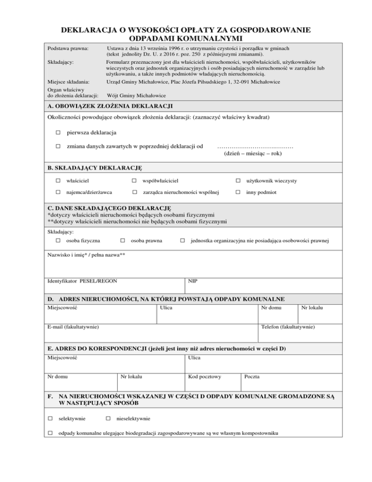 DEKLARACJA O WYSOKOŚCI OPŁATY ZA GOSPODAROWANIE ODPADAMI KOMUNALNYMI Podstawa prawna: Ustawa z dnia 13 września 1996 r. o utrzymaniu czystości i porządku w gminach (tekst jednolity Dz. U. z 2016 r. poz. 250 z późniejszymi zmianami). Składający: Formularz przeznaczony jest dla właścicieli nieruchomości, współwłaścicieli, użytkowników wieczystych oraz jednostek organizacyjnych i osób posiadających nieruchomość w zarządzie lub użytkowaniu, a także innych podmiotów władających nieruchomością. Miejsce składania: Urząd Gminy Michałowice, Plac Józefa Piłsudskiego 1, 32-091 Michałowice Organ właściwy do złożenia deklaracji: Wójt Gminy Michałowice A. OBOWIĄZEK ZŁOŻENIA DEKLARACJI Okoliczności powodujące obowiązek złożenia deklaracji: (zaznaczyć właściwy kwadrat) □ pierwsza deklaracja □ zmiana danych zawartych w poprzedniej deklaracji od ……………………….……… (dzień – miesiąc – rok) B. SKŁADAJĄCY DEKLARACJĘ □ □ □ □ właściciel najemca/dzierżawca współwłaściciel zarządca nieruchomości wspólnej □ □ użytkownik wieczysty inny podmiot C. DANE SKŁADAJĄCEGO DEKLARACJĘ *dotyczy właścicieli nieruchomości będących osobami fizycznymi **dotyczy właścicieli nieruchomości nie będących osobami fizycznymi Składający: □ □ osoba fizyczna osoba prawna □ jednostka organizacyjna nie posiadająca osobowości prawnej Nazwisko i imię* / pełna nazwa** Identyfikator PESEL/REGON NIP D. ADRES NIERUCHOMOŚCI, NA KTÓREJ POWSTAJĄ ODPADY KOMUNALNE Miejscowość Ulica Nr domu E-mail (fakultatywnie) Nr lokalu Telefon (fakultatywnie) E. ADRES DO KORESPONDENCJI (jeżeli jest inny niż adres nieruchomości w części D) Miejscowość Ulica Nr domu Nr lokalu Kod pocztowy Poczta F. NA NIERUCHOMOŚCI WSKAZANEJ W CZĘŚCI D ODPADY KOMUNALNE GROMADZONE SĄ W NASTĘPUJĄCY SPOSÓB □ selektywnie □ □ odpady komunalne ulegające biodegradacji zagospodarowywane są we własnym kompostowniku nieselektywnie G. OBLICZENIE OPŁATY ZA GOSPODAROWANIE ODPADAMI KOMUNALNYMI Oświadczam, że na terenie nieruchomości wskazanej w części D niniejszej deklaracji zamieszkuje: …............ osób. Wyliczenie miesięcznej opłaty: (wypełnić punkt 1 lub 2 stosownie do oświadczenia w części F) 1. dla nieruchomości, na których odpady komunalne zbierane są selektywnie: a) ….………………….………. x liczba osób (od 1 do 4) 10 zł = stawka opłaty ………………………….………… zł iloczyn liczby osób i stawki opłaty + b) ….………………….………. x liczba osób (powyżej 4) 6 zł = stawka opłaty ………………………….…………zł iloczyn liczby osób i stawki opłaty Wysokość opłaty miesięcznej za gospodarowanie odpadami komunalnymi wynosi ……..…………. zł. (suma a i b) (słownie: .……………………………………………………………………………………………..………...) 2. dla nieruchomości, na których odpady komunalne nie są zbierane selektywnie: a) ….………………….………. liczba osób x 25 zł stawka opłaty = ………………………….………… zł iloczyn liczby osób i stawki opłaty Wysokość opłaty miesięcznej za gospodarowanie odpadami komunalnymi wynosi ……..…………. zł. (suma a i b) (słownie: .……………………………………………………………………………………………..………...) H. WYJAŚNIENIA – proszę podać gminę, w której została złożona deklaracja za osoby zameldowane na terenie nieruchomości lub przebywające w niej czasowo, a nie ujęte w części G. I. PODPIS SKŁADAJĄCEGO DEKLARACJĘ Oświadczam, iż jestem świadoma/y odpowiedzialności karnej za podanie danych niezgodnych ze stanem faktycznym. ……………………………………… …………………..……………….. (miejscowość i data) (czytelny podpis) POUCZENIE: 1. 2. 3. Na podstawie art. 3 a ustawy z dnia 17 czerwca 1966 r. o postępowaniu egzekucyjnym w administracji (Dz. U. z 2016 r. poz. 599 ze zm.) niniejsza deklaracja stanowi podstawę do wystawienia tytułu wykonawczego, w sposób przewidziany w art. 6m ust 2b ustawy z dnia 13 września 1996 r. o utrzymaniu czystości i porządku w gminach (Dz. U. z 2016 r. poz. 250 ze zm.) Zgodnie z art. 6m ust. 1 ustawy z dnia 13 września 1996r. o utrzymaniu czystości i porządku w gminach (Dz. U. z 2016 r. poz. 250 ze zm.), właściciel nieruchomości jest zobowiązany złożyć do Wójta Gminy Michałowice, w terminie 14 dni od dnia zamieszkania na danej nieruchomości pierwszej osoby deklarację o wysokości opłaty za gospodarowanie odpadami komunalnymi. W przypadku zmiany danych będących podstawą ustalenia wysokości należnej opłaty za gospodarowanie odpadami komunalnymi, tj.: zmiany liczby osób zamieszkujących daną nieruchomość (zmiany miejsca zamieszkania, narodzin, śmierci) lub zmiany stawki opłaty, właściciel nieruchomości obowiązany jest złożyć nową deklarację Wójtowi Gminy Michałowice, w terminie 14 dni od dnia nastąpienia zmiany. Opłatę za gospodarowanie odpadami w zmienionej wysokości uiszcza się za miesiąc, w którym nastąpiła zmiana.