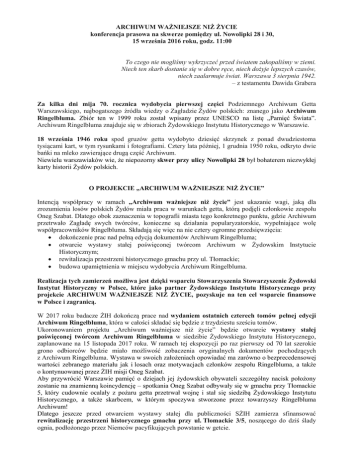 ARCHIWUM WAŻNIEJSZE NIŻ ŻYCIE konferencja prasowa na skwerze pomiędzy ul. Nowolipki 28 i 30, 15 września 2016 roku, godz. 11:00 To czego nie mogliśmy wykrzyczeć przed światem zakopaliśmy w ziemi. Niech ten skarb dostanie się w dobre ręce, niech dożyje lepszych czasów, niech zaalarmuje świat. Warszawa 3 sierpnia 1942. – z testamentu Dawida Grabera Za kilka dni mija 70. rocznica wydobycia pierwszej części Podziemnego Archiwum Getta Warszawskiego, najbogatszego źródła wiedzy o Zagładzie Żydów polskich: znanego jako Archiwum Ringelbluma. Zbiór ten w 1999 roku został wpisany przez UNESCO na listę „Pamięć Świata”. Archiwum Ringelbluma znajduje się w zbiorach Żydowskiego Instytutu Historycznego w Warszawie. 18 września 1946 roku spod gruzów getta wydobyto dziesięć skrzynek z ponad dwudziestoma tysiącami kart, w tym rysunkami i fotografiami. Cztery lata później, 1 grudnia 1950 roku, odkryto dwie bańki na mleko zawierające drugą część Archiwum. Niewielu warszawiaków wie, że niepozorny skwer przy ulicy Nowolipki 28 był bohaterem niezwykłej karty historii Żydów polskich. O PROJEKCIE „ARCHIWUM WAŻNIEJSZE NIŻ ŻYCIE” Intencją współpracy w ramach „Archiwum ważniejsze niż życie” jest ukazanie wagi, jaką dla zrozumienia losów polskich Żydów miała praca w warunkach getta, którą podjęli członkowie zespołu Oneg Szabat. Dlatego obok zaznaczenia w topografii miasta tego konkretnego punktu, gdzie Archiwum przetrwało Zagładę swych twórców, konieczne są działania popularyzatorskie, wypełniające wolę współpracowników Ringelbluma. Składają się więc na nie cztery ogromne przedsięwzięcia: dokończenie prac nad pełną edycją dokumentów Archiwum Ringelbluma; otwarcie wystawy stałej poświęconej twórcom Archiwum w Żydowskim Instytucie Historycznym; rewitalizacja przestrzeni historycznego gmachu przy ul. Tłomackie; budowa upamiętnienia w miejscu wydobycia Archiwum Ringelbluma. Realizacja tych zamierzeń możliwa jest dzięki wsparciu Stowarzyszenia Stowarzyszenie Żydowski Instytut Historyczny w Polsce, które jako partner Żydowskiego Instytutu Historycznego przy projekcie ARCHIWUM WAŻNIEJSZE NIŻ ŻYCIE, pozyskuje na ten cel wsparcie finansowe w Polsce i zagranicą. W 2017 roku badacze ŻIH dokończą prace nad wydaniem ostatnich czterech tomów pełnej edycji Archiwum Ringelbluma, która w całości składać się będzie z trzydziestu sześciu tomów. Ukoronowaniem projektu „Archiwum ważniejsze niż życie” będzie otwarcie wystawy stałej poświęconej twórcom Archiwum Ringelbluma w siedzibie Żydowskiego Instytutu Historycznego, zaplanowane na 15 listopada 2017 roku. W ramach tej ekspozycji po raz pierwszy od 70 lat szerokie grono odbiorców będzie miało możliwość zobaczenia oryginalnych dokumentów pochodzących z Archiwum Ringelbluma. Wystawa w swoich założeniach opowiadać ma zarówno o bezprecedensowej wartości zebranego materiału jak i losach oraz motywacjach członków zespołu Ringelbluma, a także o kontynuowanej przez ŻIH misji Oneg Szabat. Aby przywrócić Warszawie pamięć o dziejach jej żydowskich obywateli szczególny nacisk położony zostanie na znamienną koincydencję – spotkania Oneg Szabat odbywały się w gmachu przy Tłomackie 5, który cudownie ocalały z pożaru getta przetrwał wojnę i stał się siedzibą Żydowskiego Instytutu Historycznego, a także skarbcem, w którym spoczywa stworzone przez towarzyszy Ringelbluma Archiwum! Dlatego jeszcze przed otwarciem wystawy stałej dla publiczności SŻIH zamierza sfinansować rewitalizację przestrzeni historycznego gmachu przy ul. Tłomackie 3/5, noszącego do dziś ślady ognia, podłożonego przez Niemców pacyfikujących powstanie w getcie. O UPAMIĘTNIENIU NA SKWERZE Idea upamiętnienia tego miejsca powstała dzięki grupie pasjonatów, którzy w 2010 roku utworzyli inicjatywę społeczną dążącą do realizacji tego zamierzenia. Grupa ta przekształciła się później w Komitet Budowy Upamiętnienia Archiwum Ringelbluma. W 70. rocznicę wydobycia Archiwum Komitet Budowy Upamiętnienia Archiwum Ringelbluma, Stowarzyszenie Inicjatyw Społeczno-Kulturalnych Stacja Muranów, Żydowski Instytut Historyczny im. Emanuela Ringelbluma, Stowarzyszenie Żydowski Instytut Historyczny połączyły siły, by uhonorować grupę Oneg Szabat i jej dzieło poprzez postawienie na skwerze artystycznej instalacji kommemoratywnej. Inicjatywę tę poparły również władze samorządowe Miasta Stołecznego Warszawa. O ARCHIWUM RINGELBLUMA Tworzenie Archiwum zainicjował historyk dr Emanuel Ringelblum w listopadzie 1940 roku. Powołał on do życia tajną organizację o kryptonimie Oneg Szabat (po hebrajsku „Radość Soboty”, z powodu sobotnich spotkań konspiratorów). Pracowali oni wykorzystując nowoczesne metody gromadzenia materiałów naukowych. Zbierano zarówno akta oficjalnych instytucji jak i prasę, dzienniki oraz pamiętniki mieszkańców getta, niemieckie obwieszczenia, afisze, ulotki, napływającą do getta korespondencję, kartki żywnościowe, a nawet papierki po cukierkach i bilety tramwajowe. W Archiwum znalazło się również kilkadziesiąt fotografii, a także ponad 300 rysunków i akwarel. Zgromadzone w nim materiały - liczące 30 tysięcy kart! - nie mają odpowiedników w innych zespołach archiwalnych na świecie. Nierzadko są ostatnimi świadectwami o życiu, cierpieniu, śmierci pojedynczych osób, ale też całych społeczności z miast i miasteczek rozrzuconych po całej Polsce. Pierwszą część Archiwum Ringelbluma ukryto w nocy z 2 na 3 sierpnia 1942 roku. W getcie od 12 dni trwała deportacja Żydów warszawskich do obozu zagłady w Treblince. W obliczu nieuchronnej śmierci postanowiono zabezpieczyć Archiwum, aby świadczyło o losach wymordowanego Narodu. Na miejsce ukrycia wybrano piwnice żydowskiej szkoły im. Bera Borochowa przy ulicy Nowolipki 68. Jej dyrektor, członek Oneg Szabat 