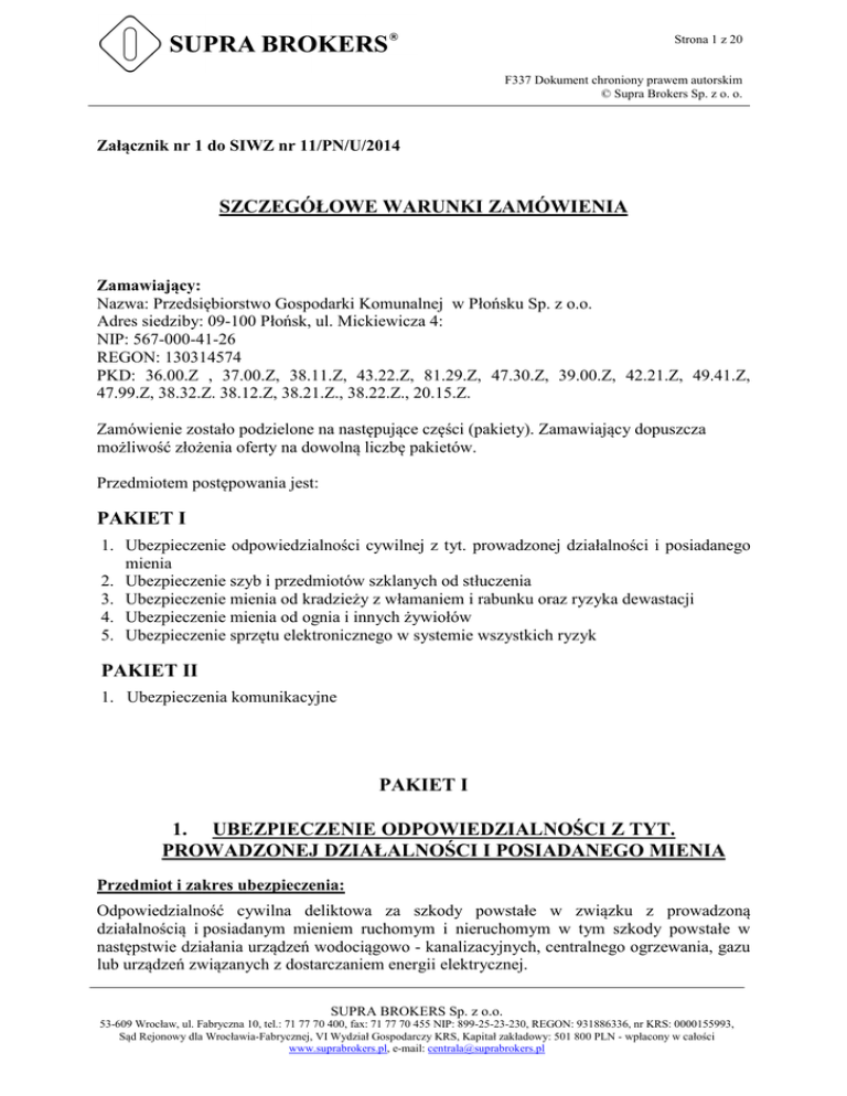 Strona 1 z 20 F337 Dokument chroniony prawem autorskim © Supra Brokers Sp. z o. o. Załącznik nr 1 do SIWZ nr 11/PN/U/2014 SZCZEGÓŁOWE WARUNKI ZAMÓWIENIA Zamawiający: Nazwa: Przedsiębiorstwo Gospodarki Komunalnej w Płońsku Sp. z o.o. Adres siedziby: 09-100 Płońsk, ul. Mickiewicza 4: NIP: 567-000-41-26 REGON: 130314574 PKD: 36.00.Z , 37.00.Z, 38.11.Z, 43.22.Z, 81.29.Z, 47.30.Z, 39.00.Z, 42.21.Z, 49.41.Z, 47.99.Z, 38.32.Z. 38.12.Z, 38.21.Z., 38.22.Z., 20.15.Z. Zamówienie zostało podzielone na następujące części (pakiety). Zamawiający dopuszcza możliwość złożenia oferty na dowolną liczbę pakietów. Przedmiotem postępowania jest: PAKIET I 1. Ubezpieczenie odpowiedzialności cywilnej z tyt. prowadzonej działalności i posiadanego mienia 2. Ubezpieczenie szyb i przedmiotów szklanych od stłuczenia 3. Ubezpieczenie mienia od kradzieży z włamaniem i rabunku oraz ryzyka dewastacji 4. Ubezpieczenie mienia od ognia i innych żywiołów 5. Ubezpieczenie sprzętu elektronicznego w systemie wszystkich ryzyk PAKIET II 1. Ubezpieczenia komunikacyjne PAKIET I 1. UBEZPIECZENIE ODPOWIEDZIALNOŚCI Z TYT. PROWADZONEJ DZIAŁALNOŚCI I POSIADANEGO MIENIA Przedmiot i zakres ubezpieczenia: Odpowiedzialność cywilna deliktowa za szkody powstałe w związku z prowadzoną działalnością i posiadanym mieniem ruchomym i nieruchomym w tym szkody powstałe w następstwie działania urządzeń wodociągowo - kanalizacyjnych, centralnego ogrzewania, gazu lub urządzeń związanych z dostarczaniem energii elektrycznej. SUPRA BROKERS Sp. z o.o. 53-609 Wrocław, ul. Fabryczna 10, tel.: 71 77 70 400, fax: 71 77 70 455 NIP: 899-25-23-230, REGON: 931886336, nr KRS: 0000155993, Sąd Rejonowy dla Wrocławia-Fabrycznej, VI Wydział Gospodarczy KRS, Kapitał zakładowy: 501 800 PLN - wpłacony w całości www.suprabrokers.pl, e-mail: [email protected] Strona 2 z 20 F337 Dokument chroniony prawem autorskim © Supra Brokers Sp. z o. o. Odpowiedzialnością Zakładu Ubezpieczeń objęte są wypadki ubezpieczeniowe, które zaszły w okresie ubezpieczenia, choćby roszczenia z ich tytułu zostały zgłoszone po tym okresie, jednakże przed upływem kodeksowego terminu przedawnienia. Przez wypadek ubezpieczeniowy rozumie się śmierć, uszkodzenie ciała, doznanie rozstroju zdrowia, utratę, zniszczenie, uszkodzenie rzeczy lub czystą stratę finansową. Zakres odpowiedzialności Zakładu Ubezpieczeń zawiera ponadto następująco zdefiniowane rozszerzenia o szkody: 1) wyrządzone pracownikom ubezpieczonego (OC pracodawcy za wypadki przy pracy) limit 50 000 zł 2) powstałe w wyniku niewykonania lub nienależytego wykonania zobowiązania – odpowiedzialność kontraktowa limit 500 000 zł 3) wyrządzone osobie trzeciej przez producenta w związku z wprowadzeniem do obrotu produktów – OC za produkt. Ubezpieczyciel odpowiada za szkody wyrządzone przez produkt , który został wprowadzony do obrotu w okresie ubezpieczenia limit 500 000 zł 4) wyrządzone przez podwykonawców limit 50 000 zł 5) wyrządzone przez pojazdy nie podlegające obowiązkowemu ubezpieczeniu odpowiedzialności cywilnej posiadacza pojazdów mechanicznych limit 100 000 zł 6) powstałe w następstwie działania urządzeń wodociągowo - kanalizacyjnych, centralnego ogrzewania, gazu lub urządzeń związanych z dostarczaniem energii elektrycznej limit 300 000 zł 7) wyrządzone w środowisku naturalnym limit 300 000 zł 8) powstałe w wyniku połączenia produktu wadliwego z innym produktem (pokrycie ewentualnych kosztów usunięcia skażenia wody i uzyskanie wody o odpowiednich parametrach) limit 500 000 zł 9) odpowiedzialność cywilna rozszerzona o koszty usunięcia produktu wadliwego i zastąpienia go produktem wolnym od wad (dostawa wody pitnej wynajętymi beczkowozami dla mieszkańców Miasta Płońska w przypadku skażenia wody w studniach głębinowych Zamawiającego) limit 500 000 zł SUPRA BROKERS Sp. z o.o. 53-609 Wrocław, ul. Fabryczna 10, tel.: 71 77 70 400, fax: 71 77 70 455 NIP: 899-25-23-230, REGON: 931886336, nr KRS: 0000155993, Sąd Rejonowy dla Wrocławia-Fabrycznej, VI Wydział Gospodarczy KRS, Kapitał zakładowy: 501 800 PLN - wpłacony w całości www.suprabrokers.pl, e-mail: [email protected] Strona 3 z 20 F337 Dokument chroniony prawem autorskim © Supra Brokers Sp. z o. o. 10) wynikłe z wadliwego wykonania czynności, prac lub usług, spowodowane przez wypadki ubezpieczeniowe powstałe po przekazaniu odbiorcy przedmiotu czynności, prac lub usług limit 500 000 zł Zakres ubezpieczenia odpowiedzialności cywilnej z tytułu prowadzonej działalności i posiadanego mienia ma obejmować wszelkie PKD wykonywane przez Zamawiającego. SUMA GWARANCYJNA Suma gwarancyjna Wysokość w zł Wszystkie wypadki 500 000 Limit na jeden wypadek 500 000 Wszystkie podlimity sumy gwarancyjnej zostały określone na wszystkie i na jeden wypadek. Udział własny: brak Franszyza integralna: brak Franszyza redukcyjna: brak Zamawiający wnioskuje o zastosowanie w ofercie ubezpieczenia następujących klauzul dodatkowych, które będą brane pod uwagę w ocenie kryterium warunki ubezpieczenia. 1. Klauzula stempla bankowego 2. Klauzula jurysdykcji 2. 1. UBEZPIECZENIE SZYB I PRZEDMIOTÓW SZKLANYCH OD STŁUCZENIA Zakres ubezpieczenia: Ubezpieczeniem objęte są szkody powstałe wskutek stłuczenia (rozbicia) ubezpieczonych przedmiotów. 2. System: na pierwsze ryzyko Przedmiot ubezpieczenia Suma ubezpieczenia Szyby okienne i drzwiowe Oszklenie ścienne i dachowe Płyty szklane stanowiące składowe części mebli, gablot reklamowych, kontuarów, stołów i lad sprzedażnych 5 000 zł SUPRA BROKERS Sp. z o.o. 53-609 Wrocław, ul. Fabryczna 10, tel.: 71 77 70 400, fax: 71 77 70 455 NIP: 899-25-23-230, REGON: 931886336, nr KRS: 0000155993, Sąd Rejonowy dla Wrocławia-Fabrycznej, VI Wydział Gospodarczy KRS, Kapitał zakładowy: 501 800 PLN - wpłacony w całości www.suprabrokers.pl, e-mail: [email protected] Strona 4 z 20 F337 Dokumen