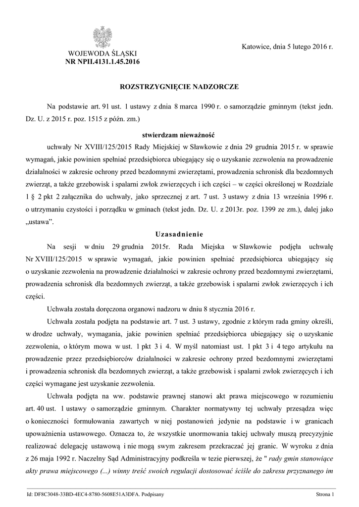Katowice, dnia 5 lutego 2016 r. WOJEWODA ŚLĄSKI NR NPII.4131.1.45.2016 ROZSTRZYGNIĘCIE NADZORCZE Na podstawie art. 91 ust. 1 ustawy z dnia 8 marca 1990 r. o samorządzie gminnym (tekst jedn. Dz. U. z 2015 r. poz. 1515 z późn. zm.) stwierdzam nieważność uchwały Nr XVIII/125/2015 Rady Miejskiej w Sławkowie z dnia 29 grudnia 2015 r. w sprawie wymagań, jakie powinien spełniać przedsiębiorca ubiegający się o uzyskanie zezwolenia na prowadzenie działalności w zakresie ochrony przed bezdomnymi zwierzętami, prowadzenia schronisk dla bezdomnych zwierząt, a także grzebowisk i spalarni zwłok zwierzęcych i ich części – w części określonej w Rozdziale 1 § 2 pkt 2 załącznika do uchwały, jako sprzecznej z art. 7 ust. 3 ustawy z dnia 13 września 1996 r. o utrzymaniu czystości i porządku w gminach (tekst jedn. Dz. U. z 2013r. poz. 1399 ze zm.), dalej jako „ustawa”. Uzasadnienie Na sesji w dniu 29 grudnia 2015r. Rada Miejska w Sławkowie podjęła uchwałę Nr XVIII/125/2015 w sprawie wymagań, jakie powinien spełniać przedsiębiorca ubiegający się o uzyskanie zezwolenia na prowadzenie działalności w zakresie ochrony przed bezdomnymi zwierzętami, prowadzenia schronisk dla bezdomnych zwierząt, a także grzebowisk i spalarni zwłok zwierzęcych i ich części. Uchwała została doręczona organowi nadzoru w dniu 8 stycznia 2016 r. Uchwała została podjęta na podstawie art. 7 ust. 3 ustawy, zgodnie z którym rada gminy określi, w drodze uchwały, wymagania, jakie powinien spełniać przedsiębiorca ubiegający się o uzyskanie zezwolenia, o którym mowa w ust. 1 pkt 3 i 4. W myśl natomiast ust. 1 pkt 3 i 4 tego artykułu na prowadzenie przez przedsiębiorców działalności w zakresie ochrony przed bezdomnymi zwierzętami i prowadzenia schronisk dla bezdomnych zwierząt, a także grzebowisk i spalarni zwłok zwierzęcych i ich części wymagane jest uzyskanie zezwolenia. Uchwała podjęta na ww. podstawie prawnej stanowi akt prawa miejscowego w rozumieniu art. 40 ust. 1 ustawy o samorządzie gminnym. Charakter normatywny tej uchwały przesądza więc o konieczności formułowania zawartych w niej postanowień jedynie na podstawie i w granicach upoważnienia ustawowego. Oznacza to, że wszystkie unormowania takiej uchwały muszą precyzyjnie realizować delegację ustawową i nie mogą swym zakresem przekraczać jej granic. W wyroku z dnia z 26 maja 1992 r. Naczelny Sąd Administracyjny podkreśla w tezie pierwszej, że " rady gmin stanowiące akty prawa miejscowego (...) winny treść swoich regulacji dostosować ściśle do zakresu przyznanego im ————————————————————————————————————————————————————————— Id: DF8C3048-33BD-4EC4-8780-5608E51A3DFA. Podpisany Strona 1 upoważnienia i przysługujących im kompetencji (...), a w razie wątpliwości co do zakresu tego upoważnienia wyjaśnić te wątpliwości przez zastosowanie wykładni zawężającej" (sygn. akt SA/Wr 310/92, publ. "Wspólnota" 1993, nr 2, s. 21). Ustawodawca, kształtując w przepisie art. 7 ust. 3 ustawy upoważnienie rady gminy do podjęcia przedmiotowej uchwały, precyzyjnie wskazał kwestie, które pozostawił regulacji organu stanowiącego jednostki samorządu terytorialnego. Rada gminy, w oparciu o ten przepis, uprawniona jest do określenia wymagań, jakie powinien spełniać przedsiębiorca ubiegający się o uzyskanie przedmiotowych zezwoleń. Oznacza to, że uchwała w sprawie wymagań kierowana jest do podmiotów, które dopiero zamierzają podjąć na danym terenie wskazaną w art. 7 ust. 1 pkt 3 i 4 ustawy działalność. W związku z tym nie może ona formułować dowolnych wymagań, ale tylko takie, które możliwe są przez te podmioty do spełnienia przed uzyskaniem określonego zezwolenia. Wojewódzki Sąd Administracyjny w Gliwicach w wyroku z dnia 29 września 2010r. sygn. akt II SA/GL 354/10 jednoznacznie wskazał, iż „ w ustawowym upoważnieniu do podjęcia uchwały nie mieściło się bowiem uprawnienie do regulowania jakichkolwiek kwestii nie odnoszących się do etapu ubiegania się przedsiębiorcy o uzyskanie zezwolenia. W konsekwencji inkryminowane passusy jako wykraczające poza zakres ustawowej delegacji naruszają prawo”. W innym wyroku Sąd ten stwierdził, iż „określenie innych wymagań, a w szczególności tych, które dotyczą obowiązków przedsiębiorcy w czasie wykonywania działalności już po uzyskaniu zezwolenia, wykracza poza delegację ustawową zawartą w art. 7 ust. 3a ustawy. Takie wykroczenie świadczy o wadliwości uchwalanych zapisów uzasadniającej wyeliminowanie z obrotu prawnego zaskarżonej uchwały w części” (wyrok WSA w Gliwicach z dnia 15 września 2010, sygn. akt II SA/Gl 355/10; wyrok WSA w Gliwicach z dnia 3 października 2014r. sygn. akt II SA/Gl 931/14 http://orzeczenia.nsa.gov.pl). Przy czym cytowane powyżej tezy orzeczeń sądów administracyjnych znajdą zastosowanie przy dokonywaniu oceny zarówno uchwał podejmowanych na podstawie art. 7 ust. 3a, jak i art. 7 ust. 3 ustawy. Chodzi więc o wskazanie w uchwale wyłącznie takich wymagań, spełnieniem których przedsiębiorca może się wykazać na etapie ubiegania się przez niego o zezwolenie. Tymczasem, w ocenie organu nadzoru, regulacja uchwały Rady Miejskiej w Sławkowie dotycząca posiadania wykwalifikowanego personelu do prowadzenia działalności w zakresie ochrony przed bezdomnymi zwierzętami (Rozdział 1 § 2 pkt 2 załącznika do uchwały) formułuje wymaganie, które nie jest możliwe do zweryfikowania na etapie poprzedzającym wydanie przedmiotowych zezwoleń – albowiem dotyczy prowadzonej już działalności. Tym samym należy uznać, iż wskazana wyżej regulacja uchwały stanowi naruszenie przepisu art. 7 ust. 3 ustawy, ponieważ nie odnosi się do wymagań, jakie będzie musiał spełnić przedsiębiorca ubiegający się o uzyskanie 