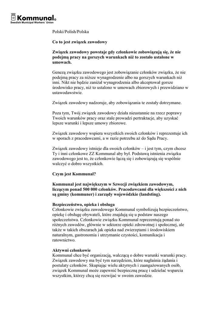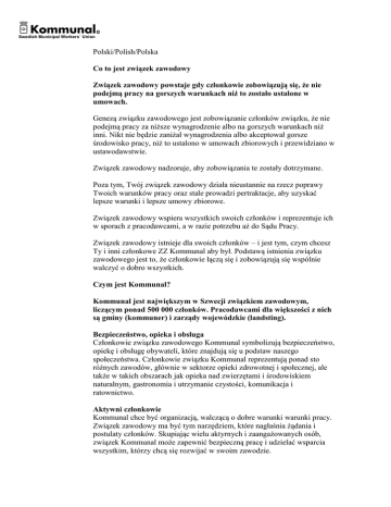 Swedish Municipal Workers´ Union Polski/Polish/Polska Co to jest związek zawodowy Związek zawodowy powstaje gdy członkowie zobowiązują się, że nie podejmą pracy na gorszych warunkach niż to zostało ustalone w umowach. Genezą związku zawodowego jest zobowiązanie członków związku, że nie podejmą pracy za niższe wynagrodzenie albo na gorszych warunkach niż inni. Nikt nie będzie zaniżał wynagrodzenia albo akceptował gorsze środowisko pracy, niż to ustalono w umowach zbiorowych i przewidziano w ustawodawstwie. Związek zawodowy nadzoruje, aby zobowiązania te zostały dotrzymane. Poza tym, Twój związek zawodowy działa nieustannie na rzecz poprawy Twoich warunków pracy oraz stale prowadzi pertraktacje, aby uzyskać lepsze warunki i lepsze umowy zbiorowe. Związek zawodowy wspiera wszystkich swoich członków i reprezentuje ich w sporach z pracodawcami, a w razie potrzebu aż do Sądu Pracy. Związek zawodowy istnieje dla swoich członków – i jest tym, czym chcesz Ty i inni członkowe ZZ Kommunal aby był. Podstawą istnienia związku zawodowego jest to, że członkowie łączą się i zobowiązują się wspólnie walczyć o dobro wszystkich. Czym jest Kommunal? Kommunal jest największym w Szwecji związkiem zawodowym, liczącym ponad 500 000 członków. Pracodawcami dla większości z nich są gminy (kommuner) i zarządy wojewódzkie (landsting). Bezpieczeństwo, opieka i obsługa Członkowie związku zawodowego Kommunal symbolizują bezpieczeństwo, opiekę i obsługę obywateli, które znajdują się u podstaw naszego społeczeństwa. Członkowie związku Kommunal reprezentują ponad sto różnych zawodów, głównie w sektorze opieki zdrowotnej i społecznej, ale także w takich obszarach jak opieka nad zwierzętami i środowiskiem naturalnym, gastronomia i utrzymanie czystości, komunikacja i ratownictwo. Aktywni członkowie Kommunal chce być organizacją, walczącą o dobre warunki warunki pracy. Związek zawodowy ma być tym narzędziem, które nagłaśnia żądania i postulaty członków. Skupiając wielu aktyrnych i zaangażowanych osób, związek Kommunal może zapewnić bezpieczną pracę i udzielać wsparcia wszystkim, którzy chcą się rozwijać w swoim zawodzie. Swedish Municipal Workers´ Union Dokładamy starań, aby wszyscy członkowie mogli pracować w kreatywnym środowisku pracy. Wiedza i umiejętności pracowników są podstawą dobrej opieki społecznej. Walczymy o Ciebie Walka o lepsze warunki pracy toczy się każdego dnia. Walczymy o właściwe i sprawiedliwe wynagrodzenie, bezpieczne zatrudnienie i rozwój kompetencji zawodowych dla wszystkich. Stwarzamy możliwości, które nasi członkowie mogą wykorzystywać w miarę potrzeby i chęci. Za przykład może służyć doskonalenie się w wykonywanym przez siebie zawodzie albo działania na rzecz tworzenia dobrych pracy z prawidłowym wynagrodzeniem dla pracowników. Dlaczego zostać członkiem związku? Jako członek Kommunal możesz czuć się silny i bardziej pewny w swojej pracy. Walczymy o jak najlepsze warunki dla naszych członków w ich działalności zawodowej. Idea związku zawodowego jest prosta – musi być nas wielu, walczących razem o spełnienie naszych żądań. Gdy jest nas wielu, to pracodawcy muszą nas wysłuchać. Związkowe zobowiązanie Zobowiązanie to oznacza że pracownicy – dotyczy to Ciebie, Twoich współtowarzyszy w miejscu pracy i wszystkich innych na rynku pracy – zobowiązują się wobec siebie, że nie będą współzawodniczyć o zatrudnienie zgadzając się na niższe wynagrodzenie i gorsze warunki pracy. Nie ma żadnej ustawy prawnej, gwarantującej Twoje wynagrodzenie. Jest za to umowa – umowa zbiorowa. Nie można niestety uznać za zupełnie pewne, że wszyscy pracodawcy zawsze stosują się do postanowień umowy zbiorowej. Jako członek związku zawodowego Kommunal masz do swojej dyspozycji wybranych powierników, ekspertów i prawników, którzy służą radą i pomocą jeśli natrafisz na jakieś trudności związane z Twoim zatrudnieniem lub wynagrodzeniem. Walczymy o to, co jest ważne dla naszych członków • lepsze wynagrodzenia • dobre warunki zatrunienia • dobre środowisko pracy • dobre wykształcenie i możliwości doskonalenia swoich umiejętności zawodowych Jeżeli nie należysz do związku, nie otrzymasz żadnej pomocy w pertaktacjach z pracodawcą. Swedish Municipal Workers´ Union Jak zostać członkiem Kommunal? Najłatwiej zostać członkiem związku nawiązując kontakt z przedstawicielem Kommunal w Twoim miejscu pracy albo z sekcją związku. Możesz także zostać członkiem poprzez naszą witrynę internetową. Można tam wypełnić formularz w języku szwedzkim, albo wydrukować blankiet i po jego wypełnieniu przesłać go pocztą. Jeżeli potrzebujesz pomocy z wypełnieniem formularza lub wydruku blankietu, to nawiąż kontakt z przedstawicielem związku Kommunal w Twoim miejscu pracy albo z sekcją związku.