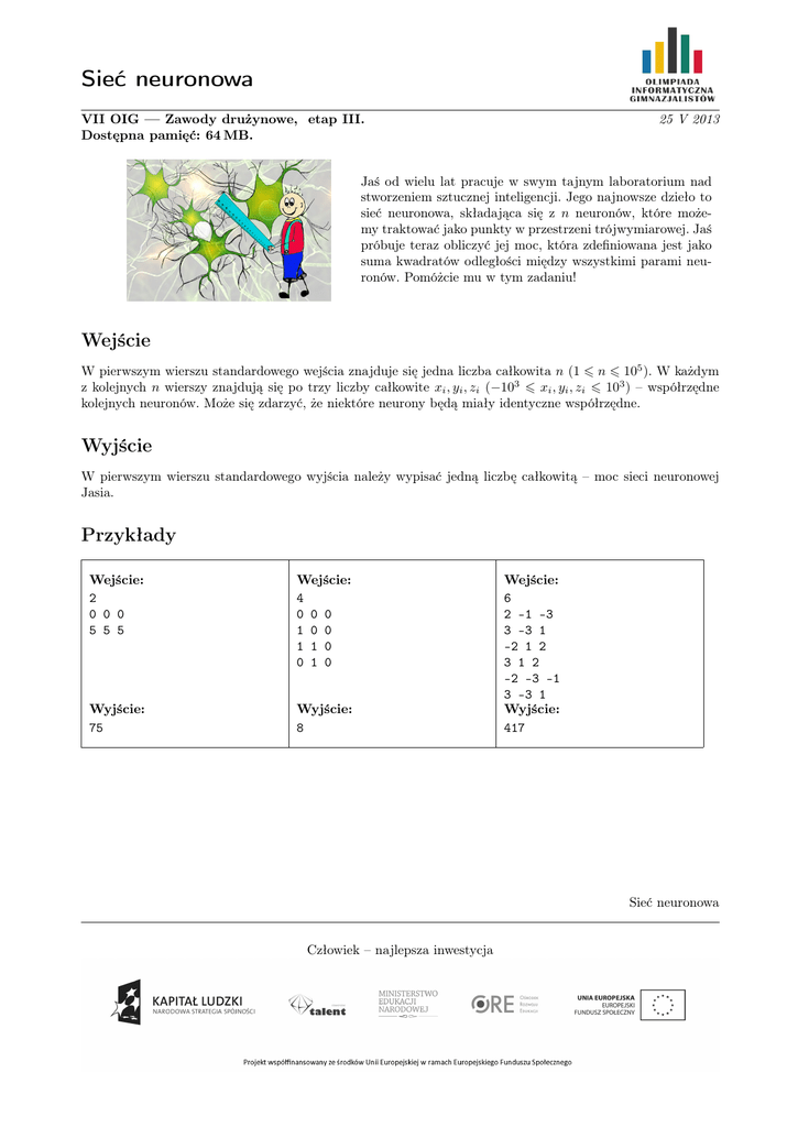 Sieć neuronowa VII OIG — Zawody drużynowe, etap III. Dostępna pamięć: 64 MB. 25 V 2013 Jaś od wielu lat pracuje w swym tajnym laboratorium nad stworzeniem sztucznej inteligencji. Jego najnowsze dzieło to sieć neuronowa, składająca się z n neuronów, które możemy traktować jako punkty w przestrzeni trójwymiarowej. Jaś próbuje teraz obliczyć jej moc, która zdefiniowana jest jako suma kwadratów odległości między wszystkimi parami neuronów. Pomóżcie mu w tym zadaniu! Wejście W pierwszym wierszu standardowego wejścia znajduje się jedna liczba całkowita n (1 6 n 6 105 ). W każdym z kolejnych n wierszy znajdują się po trzy liczby całkowite xi , yi , zi (−103 6 xi , yi , zi 6 103 ) – współrzędne kolejnych neuronów. Może się zdarzyć, że niektóre neurony będą miały identyczne współrzędne. Wyjście W pierwszym wierszu standardowego wyjścia należy wypisać jedną liczbę całkowitą – moc sieci neuronowej Jasia. Przykłady Wejście: 2 0 0 0 5 5 5 Wejście: 4 0 0 0 1 0 0 1 1 0 0 1 0 Wyjście: 75 Wyjście: 8 Wejście: 6 2 -1 -3 3 -3 1 -2 1 2 3 1 2 -2 -3 -1 3 -3 1 Wyjście: 417 Sieć neuronowa Człowiek – najlepsza inwestycja