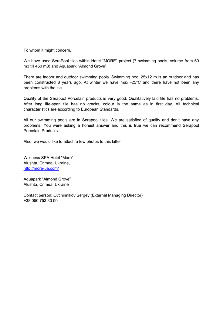 To whom it might concern, We have used SeraPool tiles within Hotel “MORE” project (7 swimming pools, volume from 60 m3 till 450 m3) and Aquapark “Almond Grove” There are indoor and outdoor swimming pools. Swimming pool 25x12 m is an outdoor and has been constructed 8 years ago. At winter we have max -25°C and there have not been any problems with the tile. Quality of the Serapool Porcelain products is very good. Qualitatively laid tile has no problems. After long life-span tile has no cracks, colour is the same as in first day. All technical characteristics are according to European Standards. All our swimming pools are in Serapool tiles. We are satisfied of quality and don’t have any problems. You were asking a honest answer and this is true we can recommend Serapool Porcelain Products. Also, we would like to attach a few photos to this latter Wellness SPA Hotel "Мore" Alushta, Crimea, Ukraine, http://more-ua.com/ Aquapark “Almond Grove” Alushta, Crimea, Ukraine Contact person: Ovchinnikov Sergey (External Managing Director) +38 050 753 30 00 Szanowni Państwo, Wykorzystaliśmy płytki SeraPool w Hotelu “MORE” (7 basenów, od 60 m3 do 450 m3) oraz w Aquaparku “Almond Grove” Sa to baseny zarówno wewnętrzne jak i zewnętrzne. Basen zewnętrzny ma 25x12 m i został zbudowany juz 8 lat temu. W czasie zimy temperatura osiąga czasami -25°C i mimo tego nie malismy jeszcze żadnych problemów z płytkami. Jakość porcelany SeraPool jest bardzo dobra. Nie mamy żadnych problemów z płytkami. Po już tak długim użytkowaniu na płytkach nie ma pęknięć, kolor jest taki sam jak w pierwszy dzień. Wszystkie parametry techniczne są zgodne z normami europejskimi. Wszystkie nasze baseny włożone sa płytkami Serapool. Jesteśmy zadowoleni z jakości i nie majmy z nimi żadnych problemów. Prosiliście Państwo o szczera odpowiedz i to jest prawdamożemy polecić porcelnae SeraPool z czystym sumieniem. Ponadto, chcielibyśmy dołączyć kilka zdjęć z tego listu. Wellness SPA Hotel "Мore" Alushta, Krym, Ukraina, http://more-ua.com/ Aquapark “Almond Grove” Alushta, Krym, Ukraina Osoba kontaktowa: Ovchinnikov Sergey (External Managing Director) +38 050 753 30 00